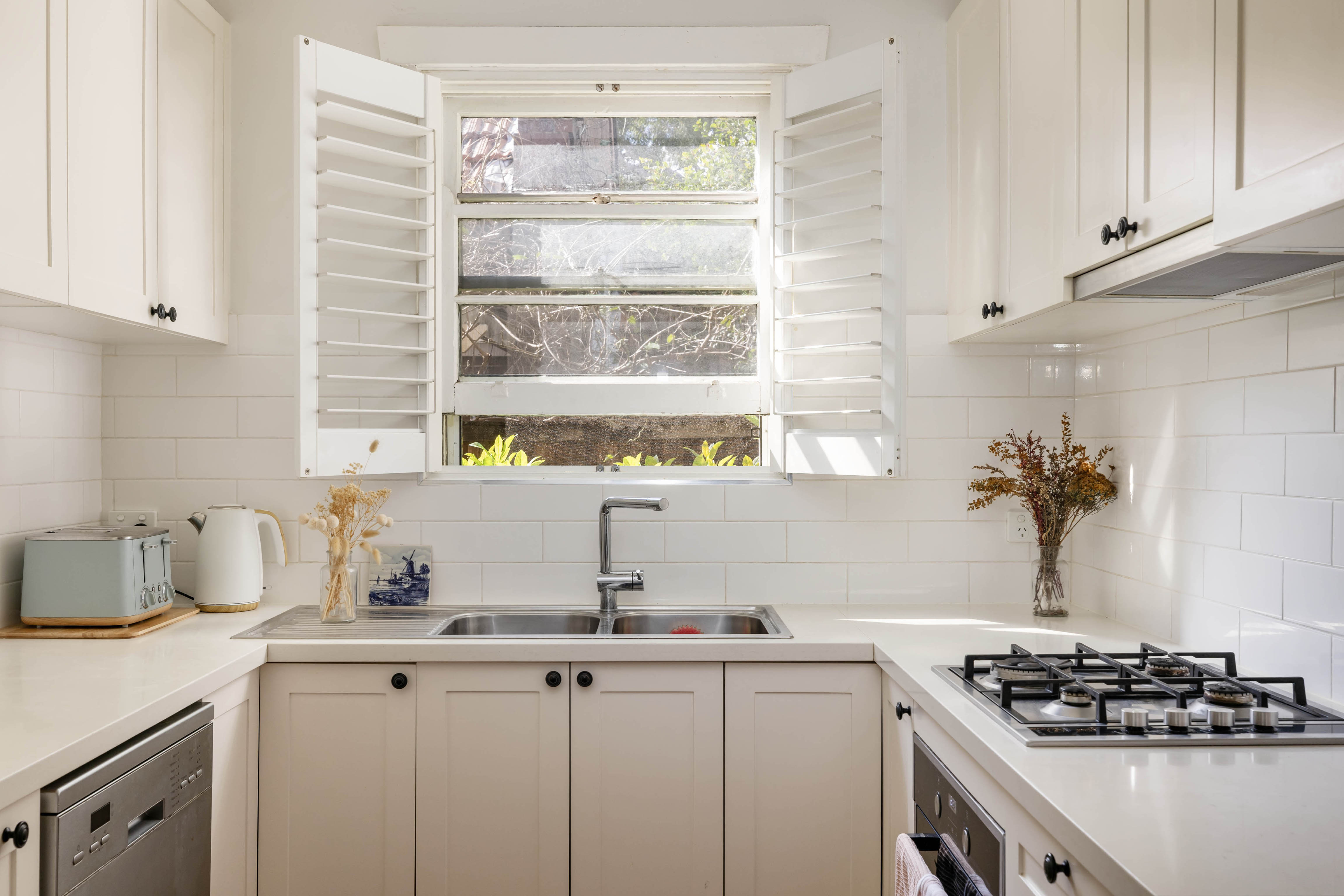 - Leafy green outlooks, plantation shutters