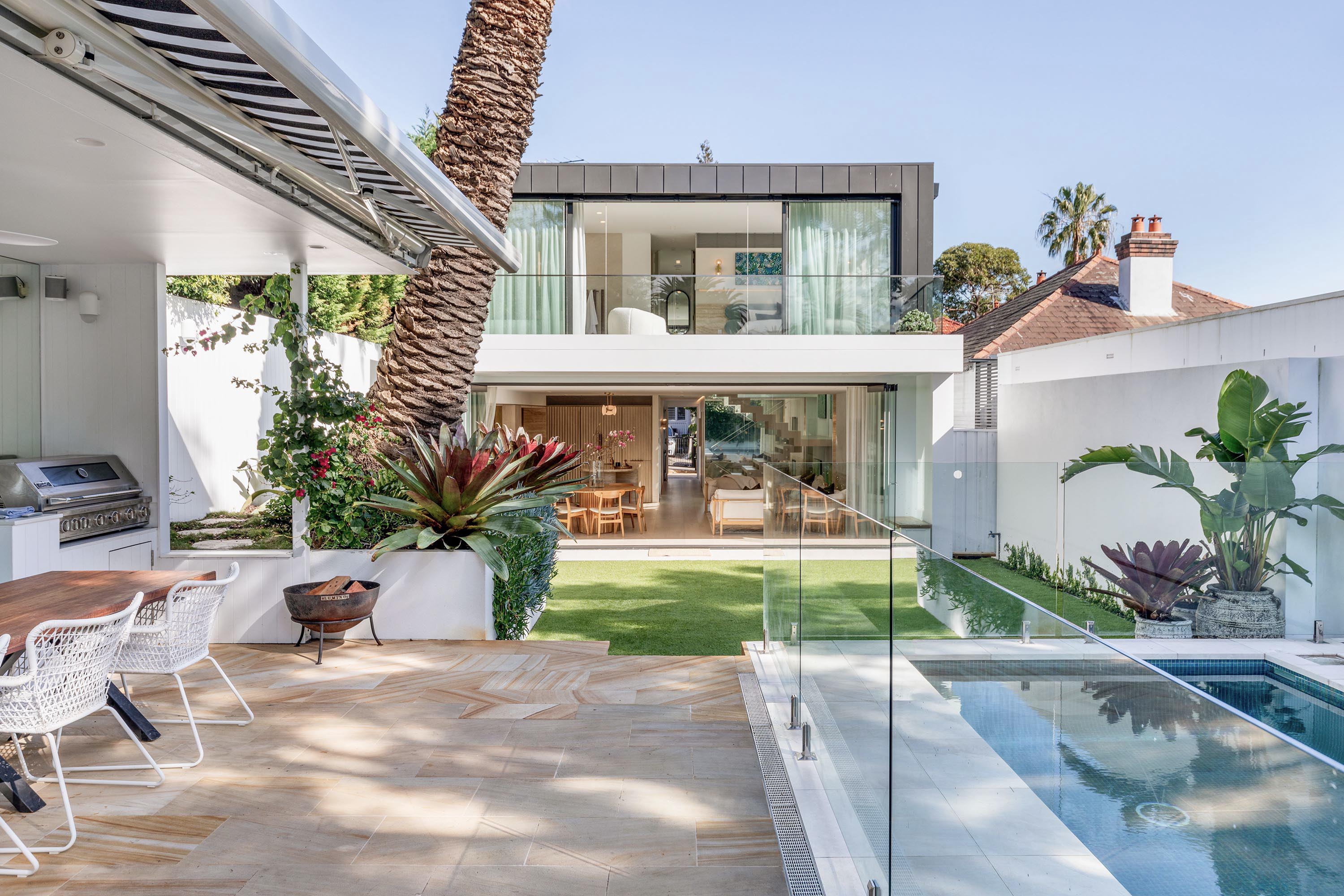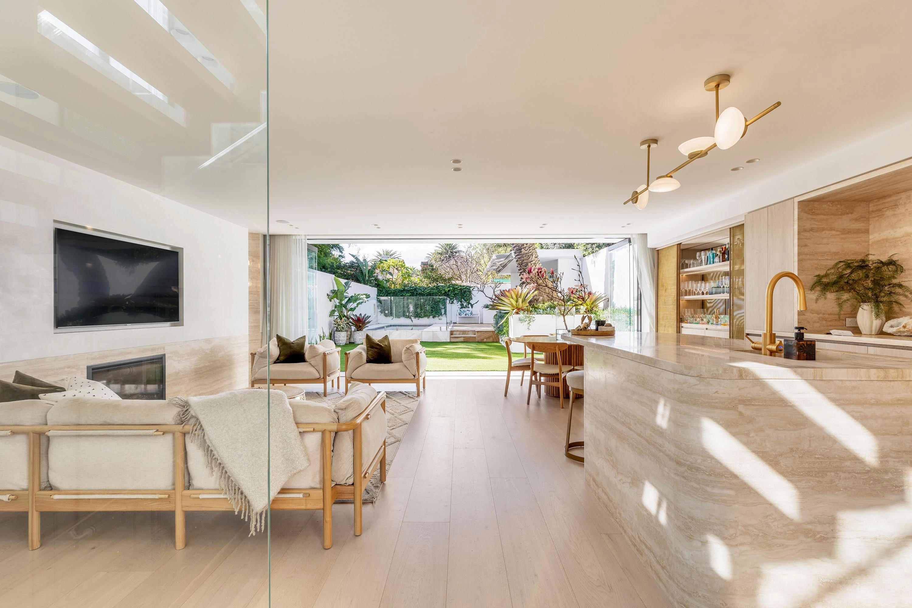 A family retreat from TW Architects and interior designer Nina Maya, this home has been devised to bring a beach house feel into the heart of Balmain. With luxe but pared-back finishes, it’s a beautifully curated space of travertine, timber, plastered walls and bronze highlights. Generously proportioned, the 3-level residence is well appointed for relaxed entertaining, with leisure-inspired inclusions from a gym and steam room, to a home theatre and bar.