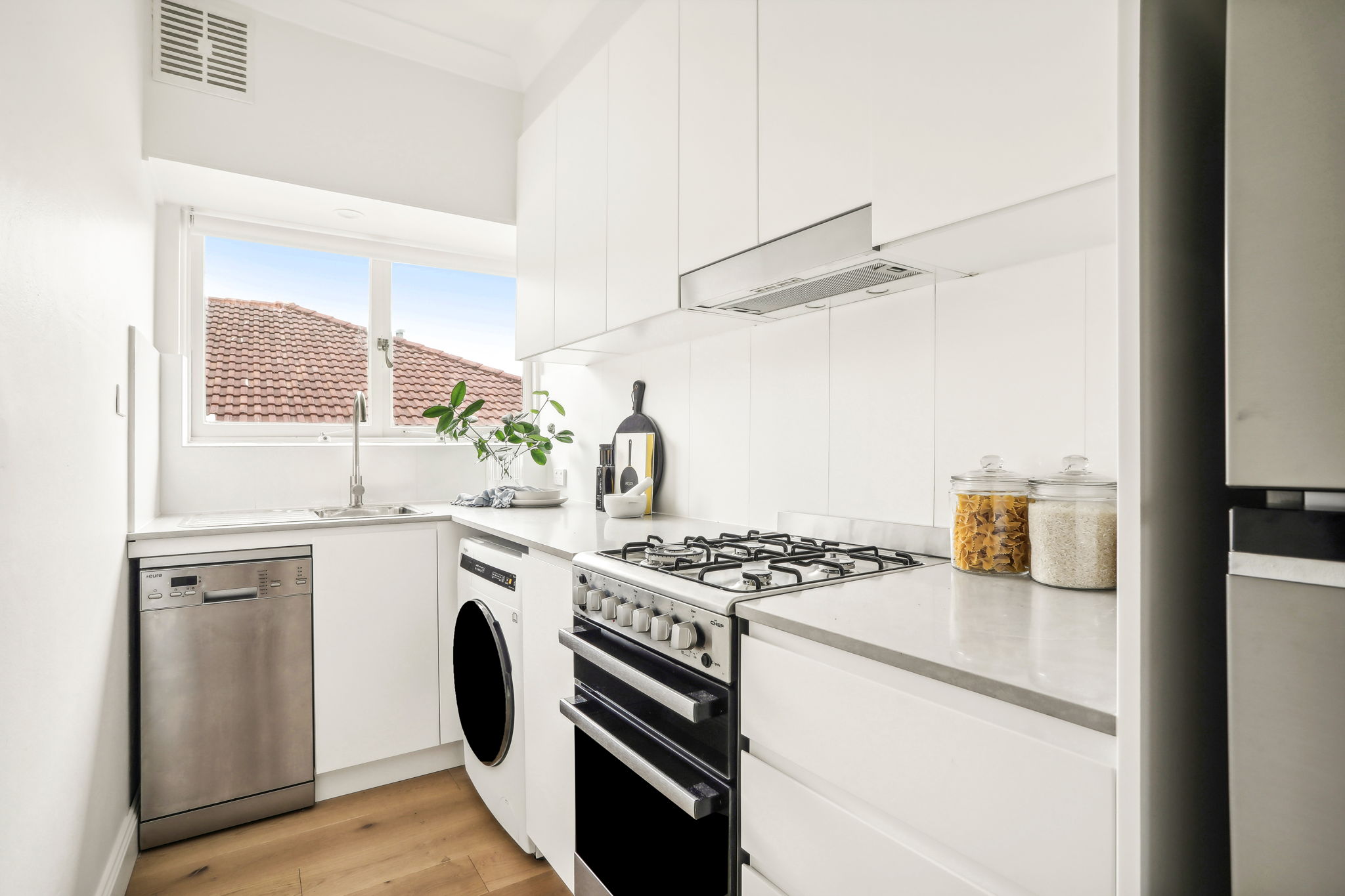- Kitchen equipped with Caesarstone benchtops & a stainless steel gas stove