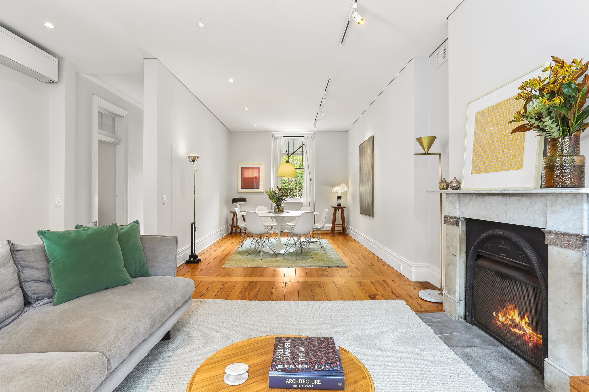 - Living room with Jetmaster fireplace and air conditioning