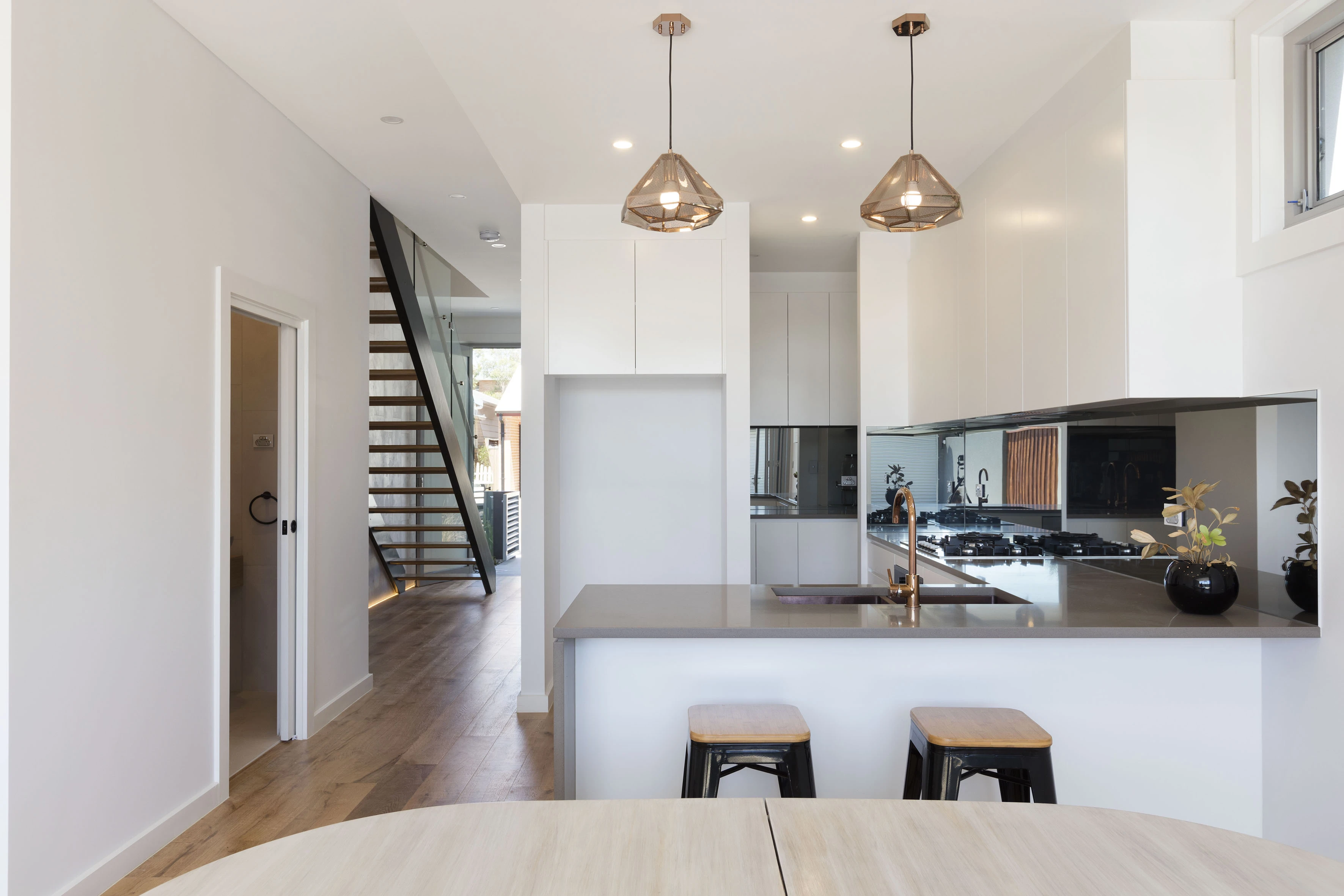 - Rose-gold tapware/lighting, attic store
