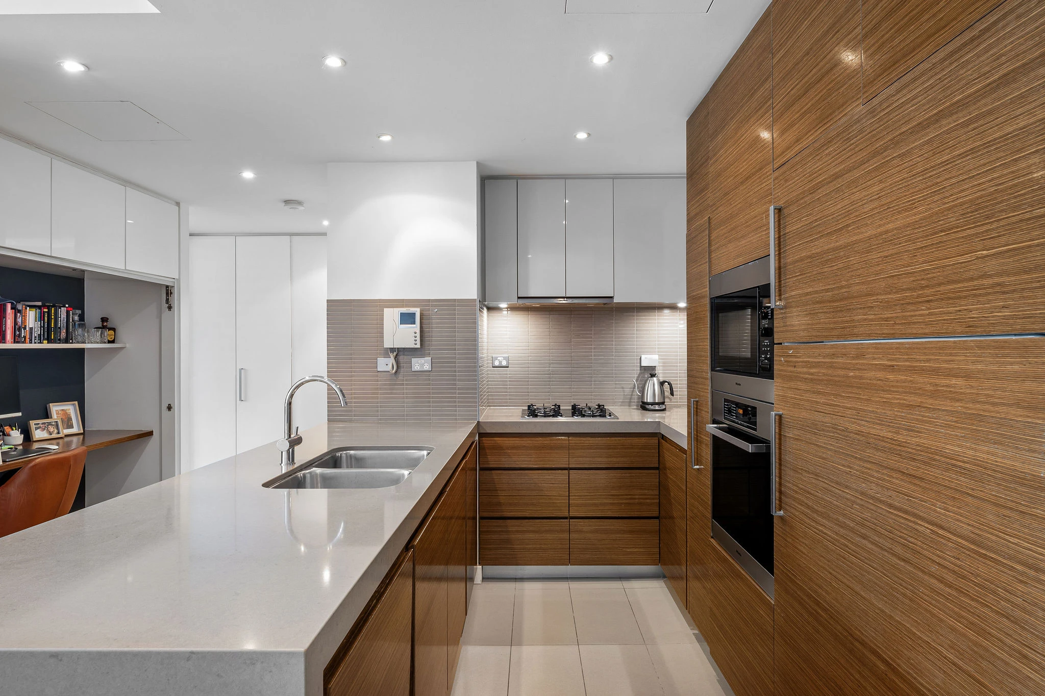 - Sleek kitchen with stone benchtops, gas cooking, and integrated appliances