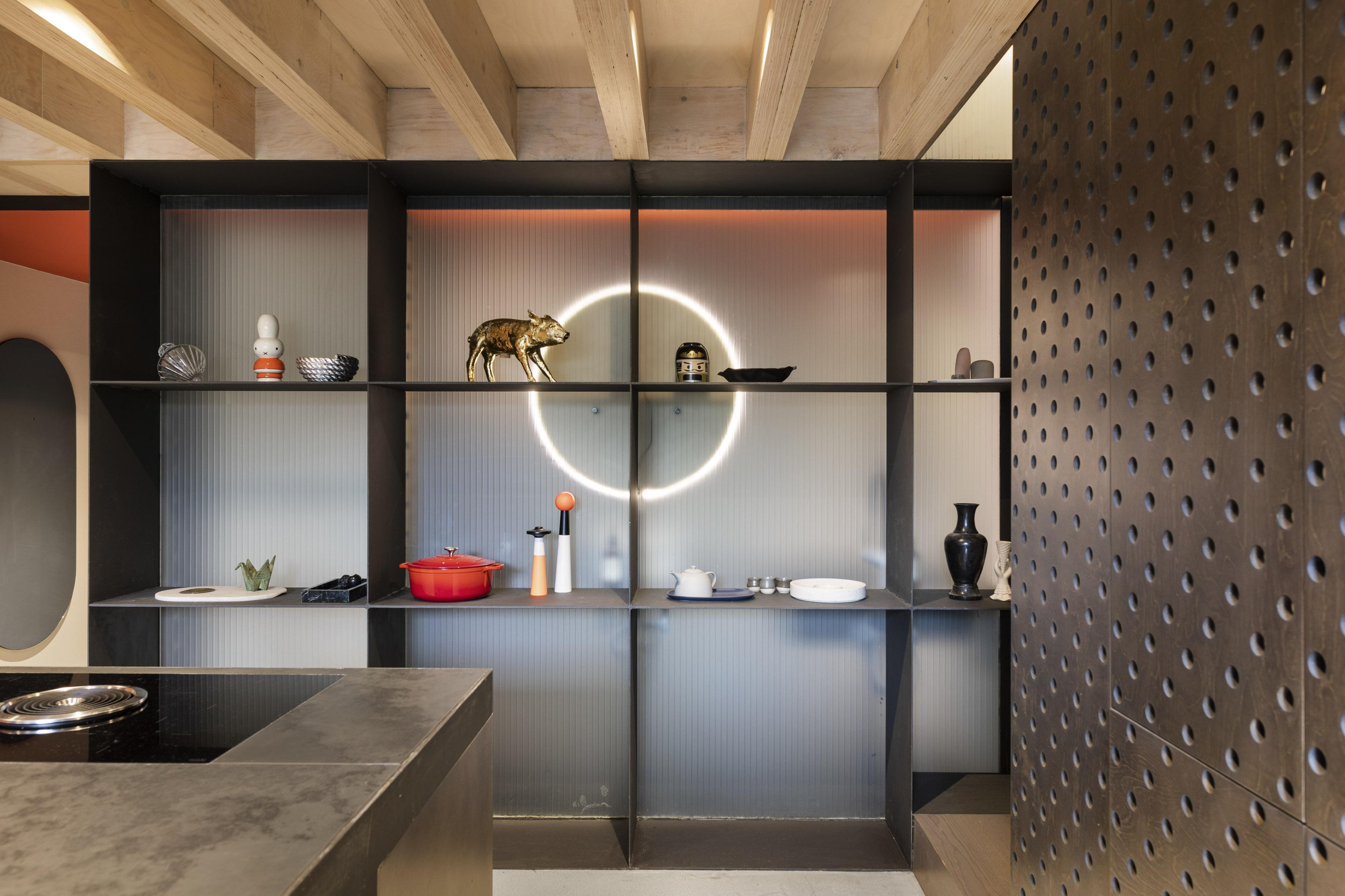 - Perforated kitchen doors, concealed fridge