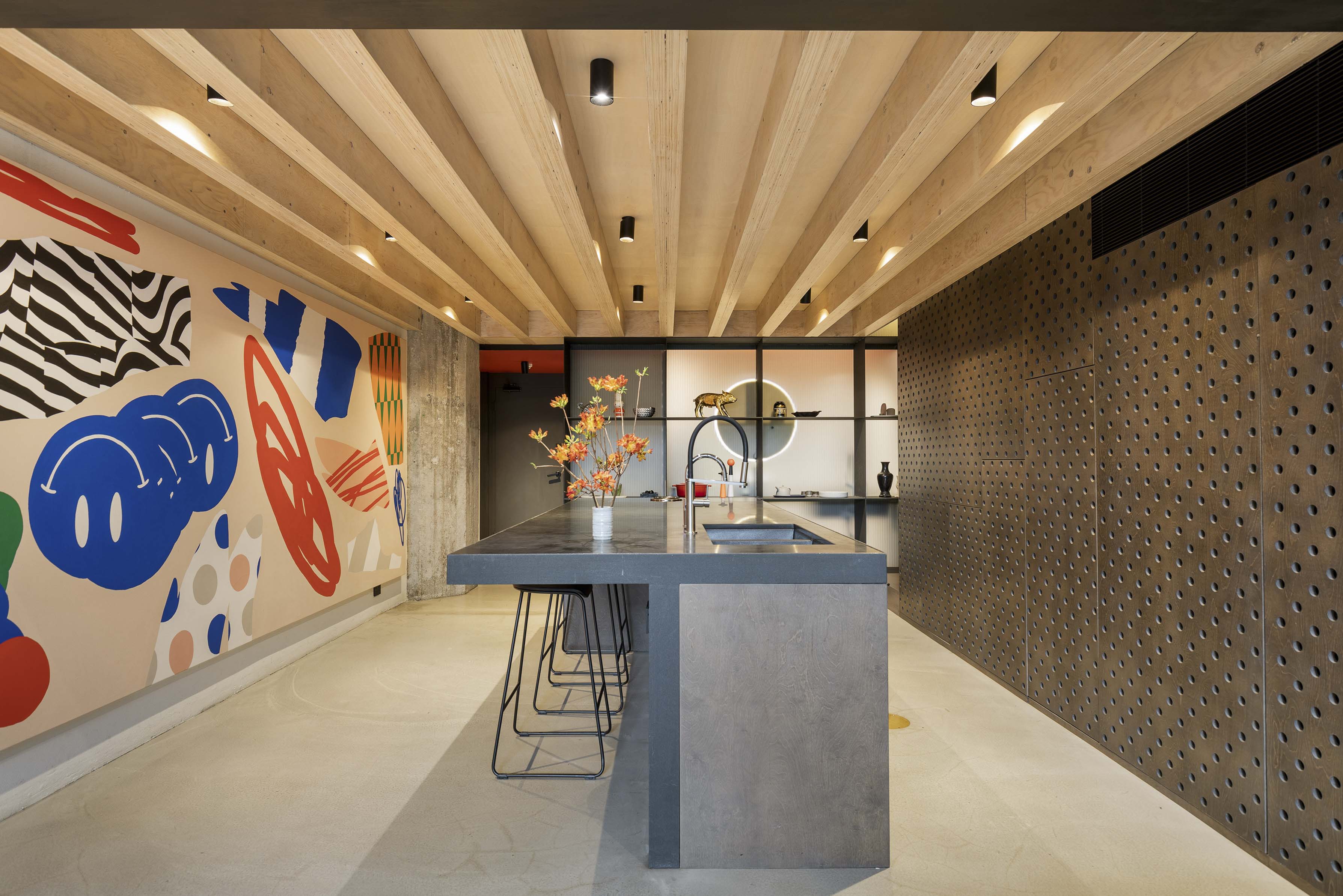 - Raw concrete, steel, glass, timber beams