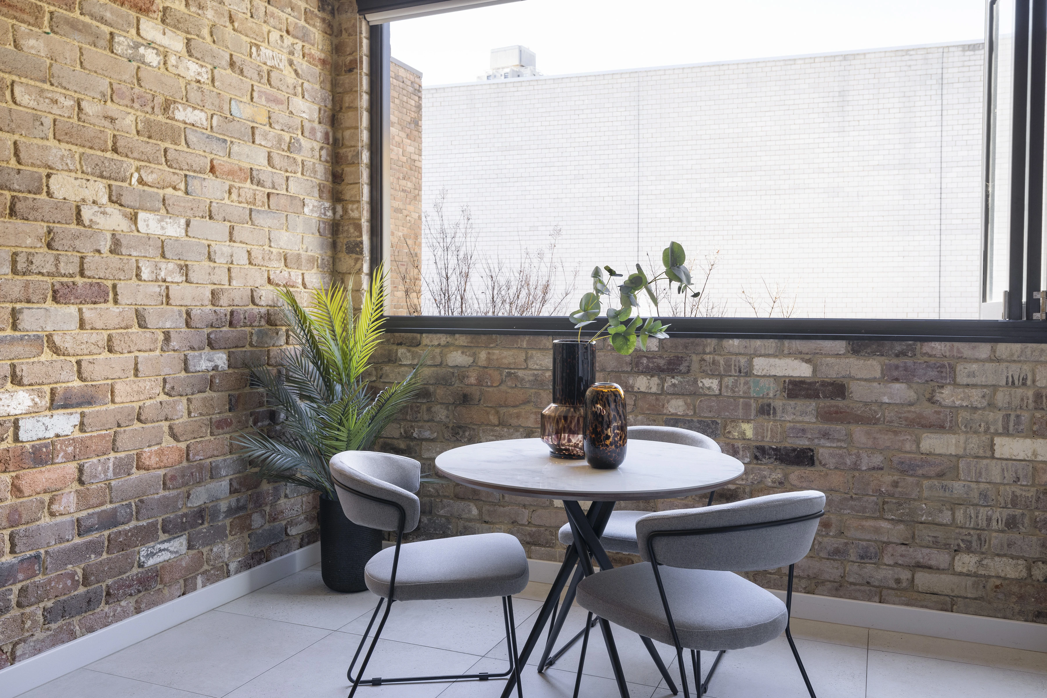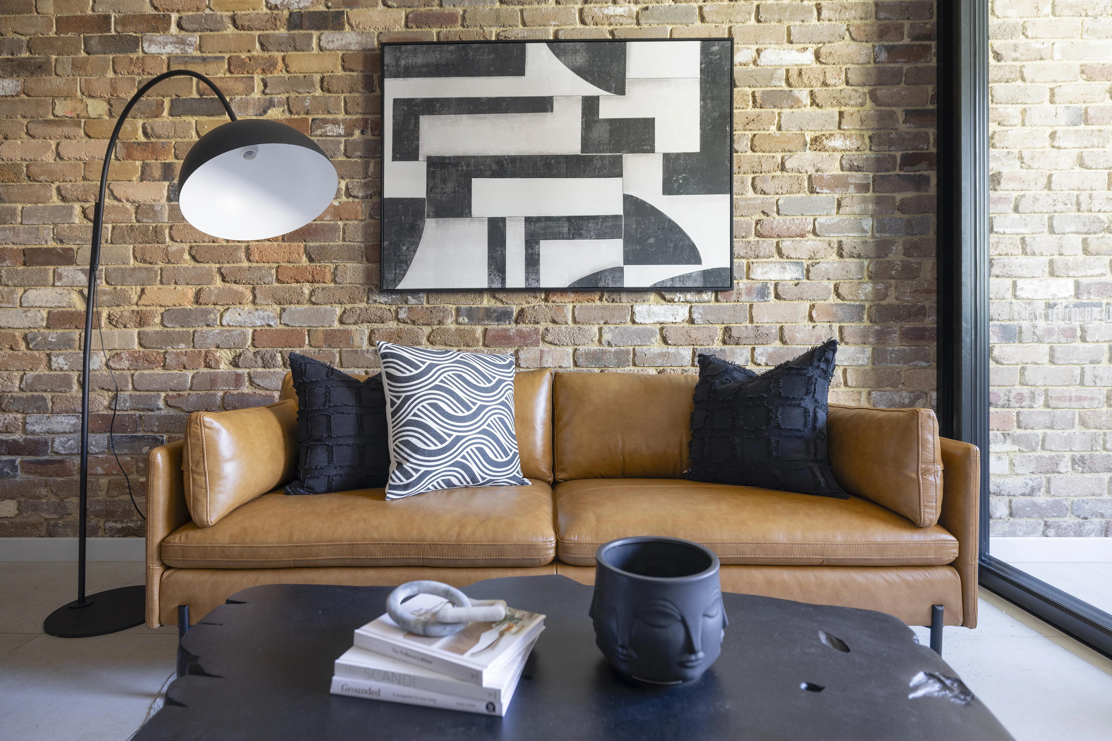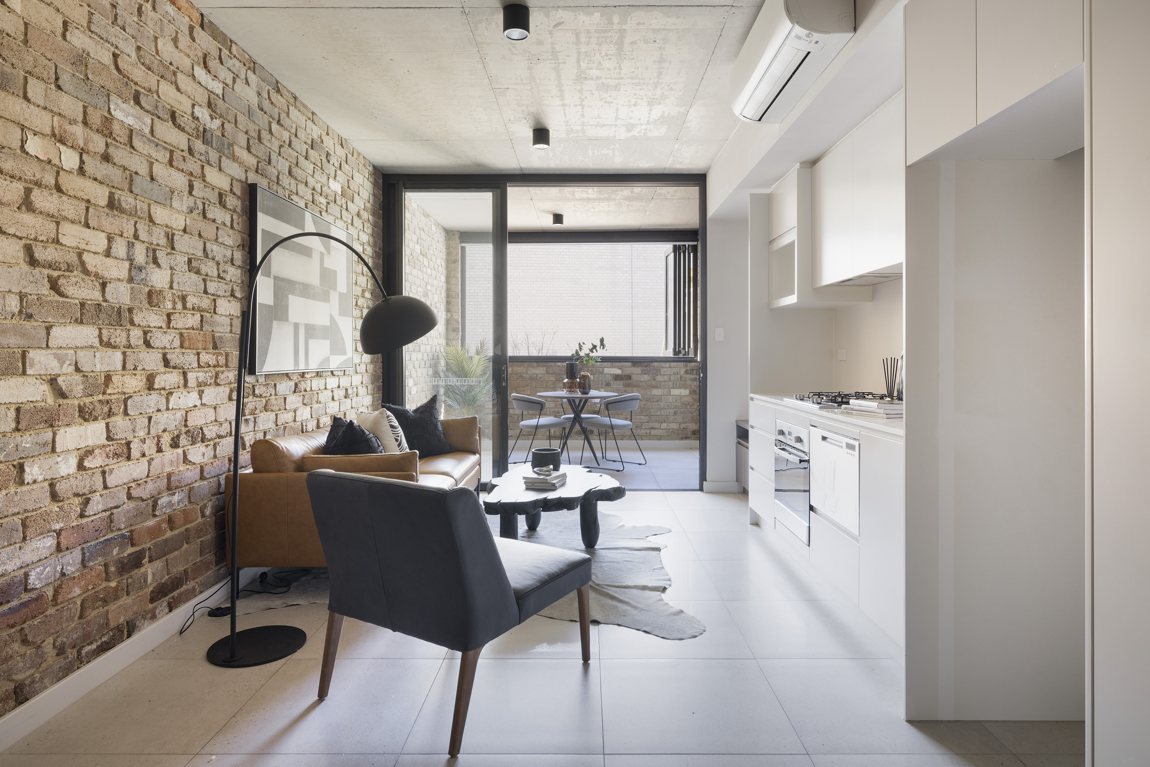 - Brick & concrete accents, industrial feel