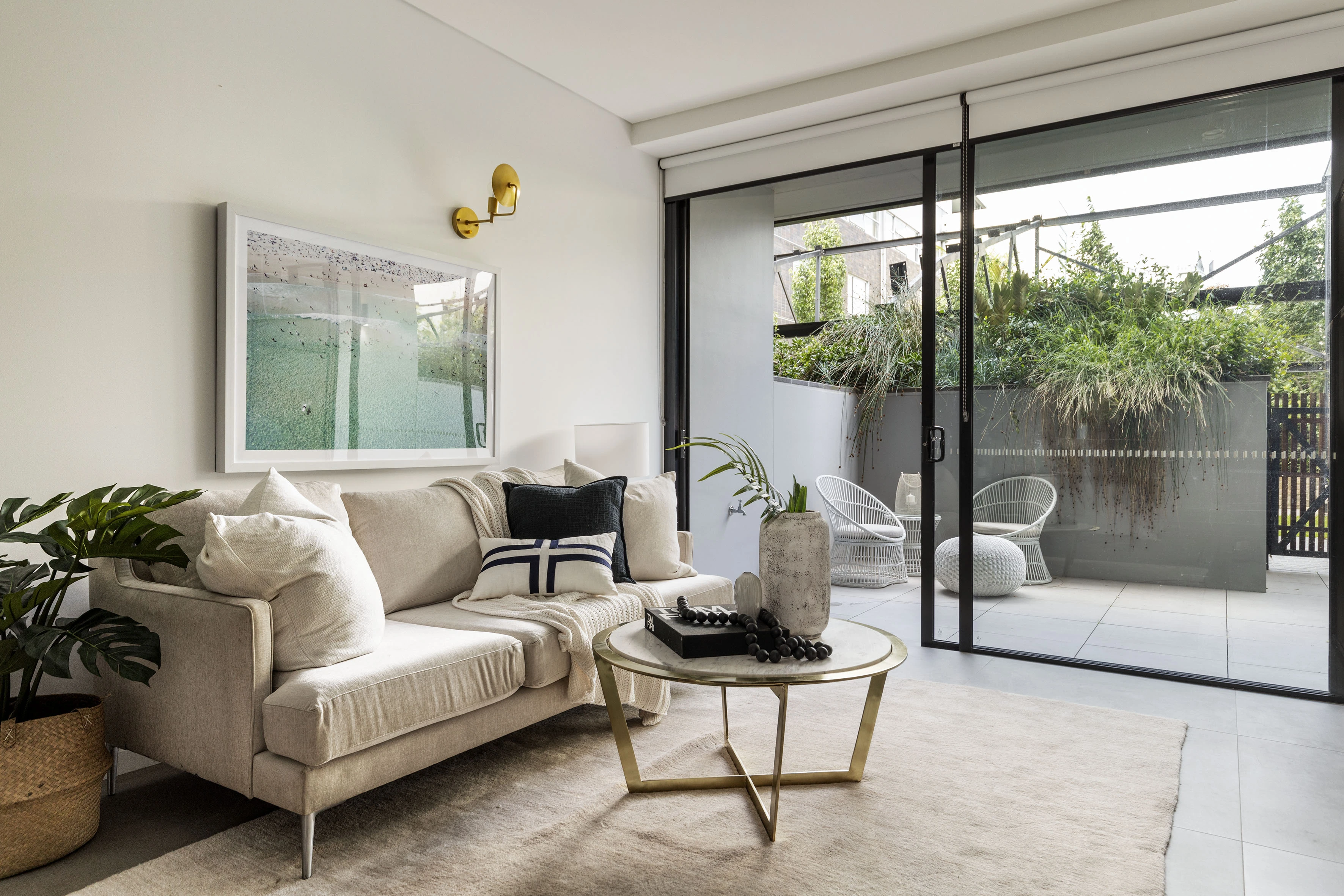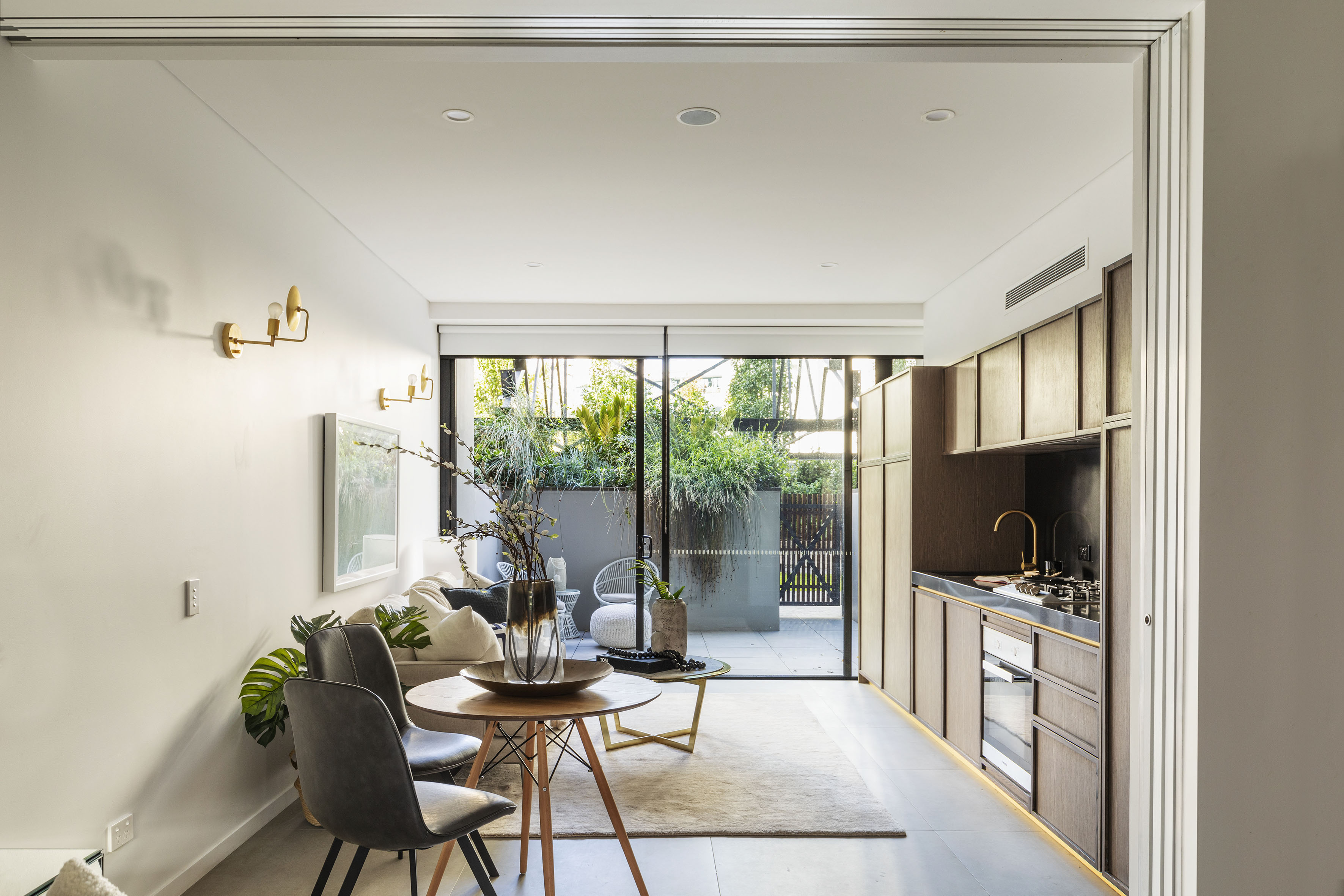 - Full-wall glass opens to garden courtyard