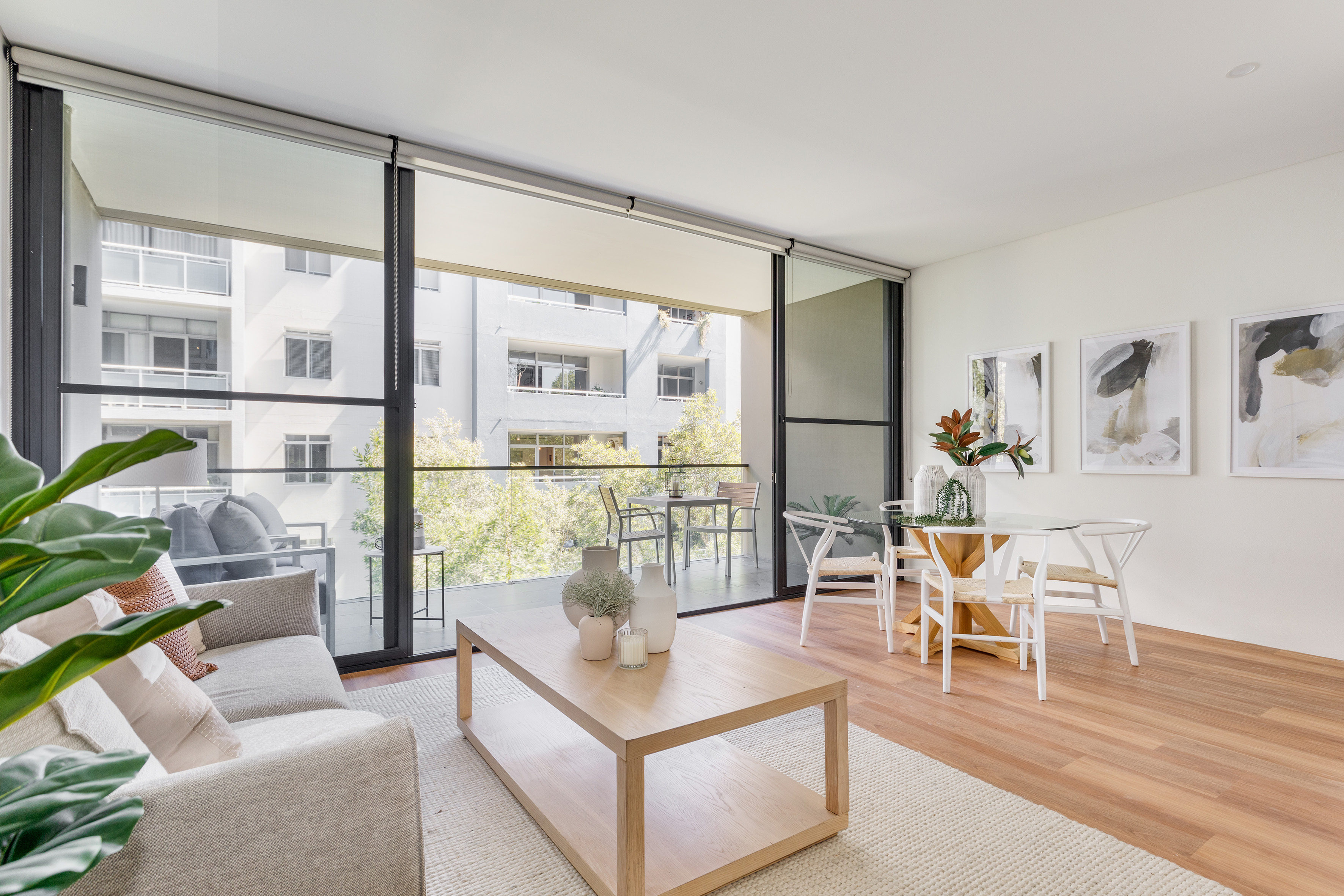 In a perfect treetop position, this large apartment has an impressive outlook, defined by great natural light and green backdrops. An open-plan design with an oversized balcony, it has a great connection to the outdoors and the village below.