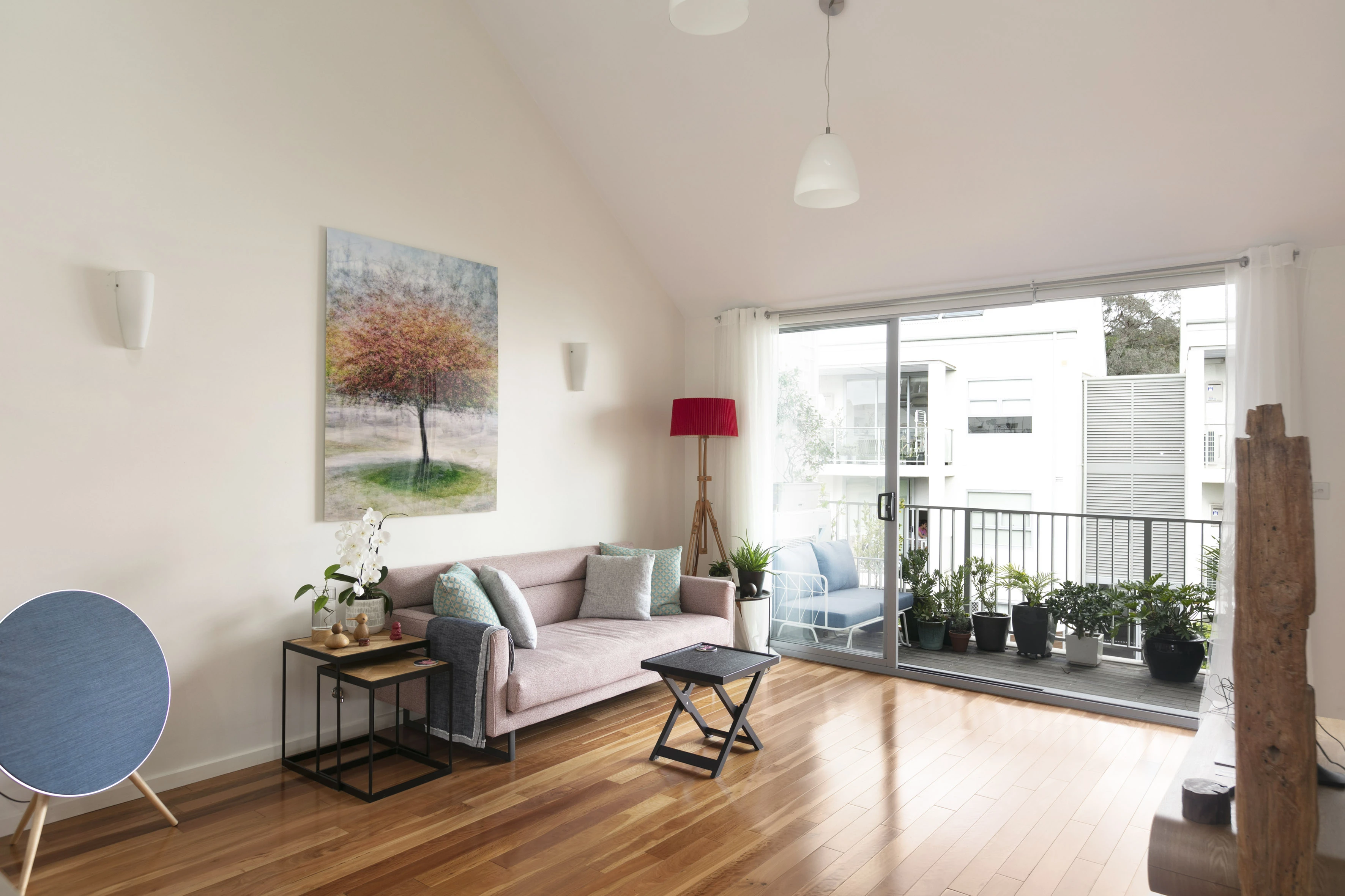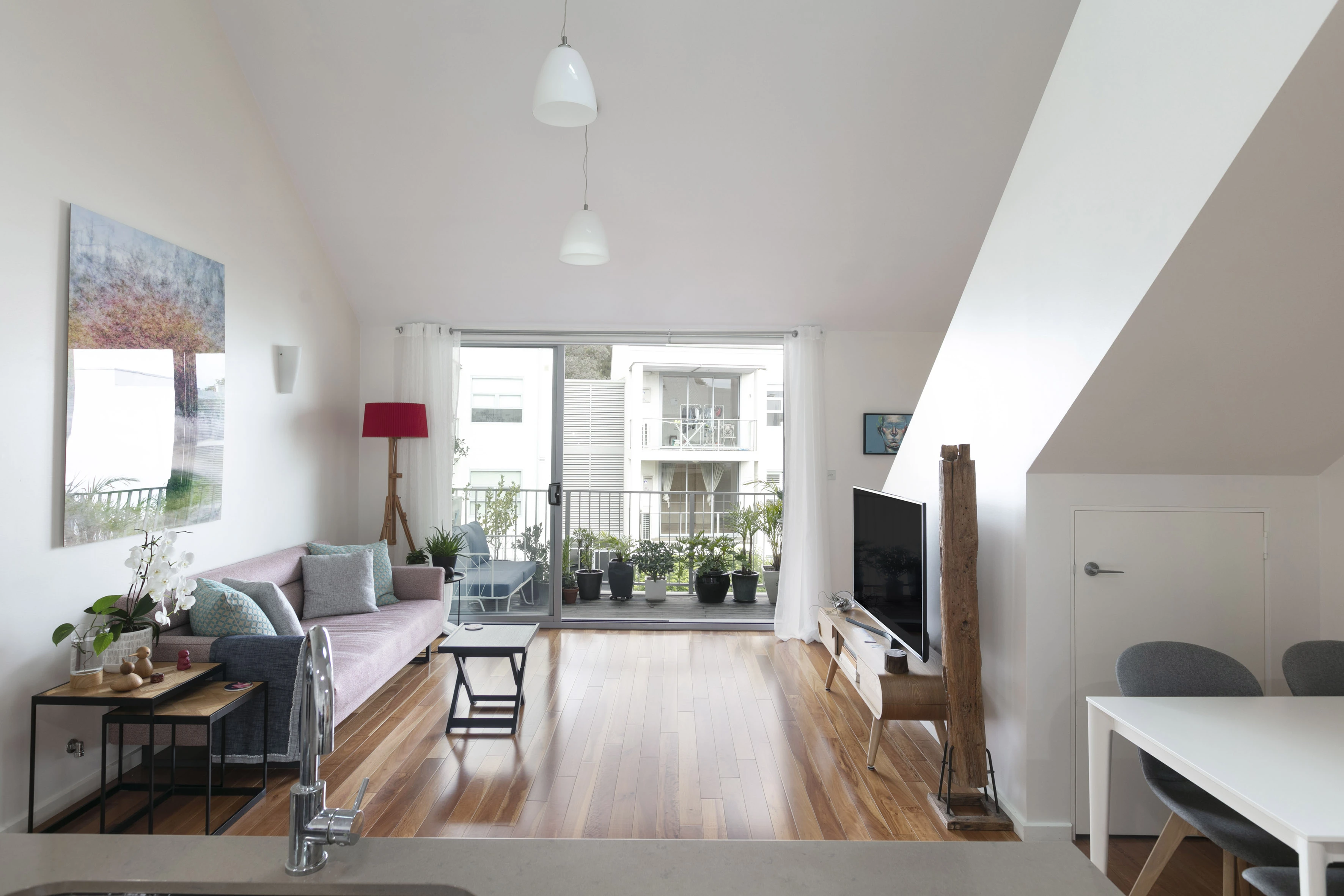 - Open double-height living plus balcony
