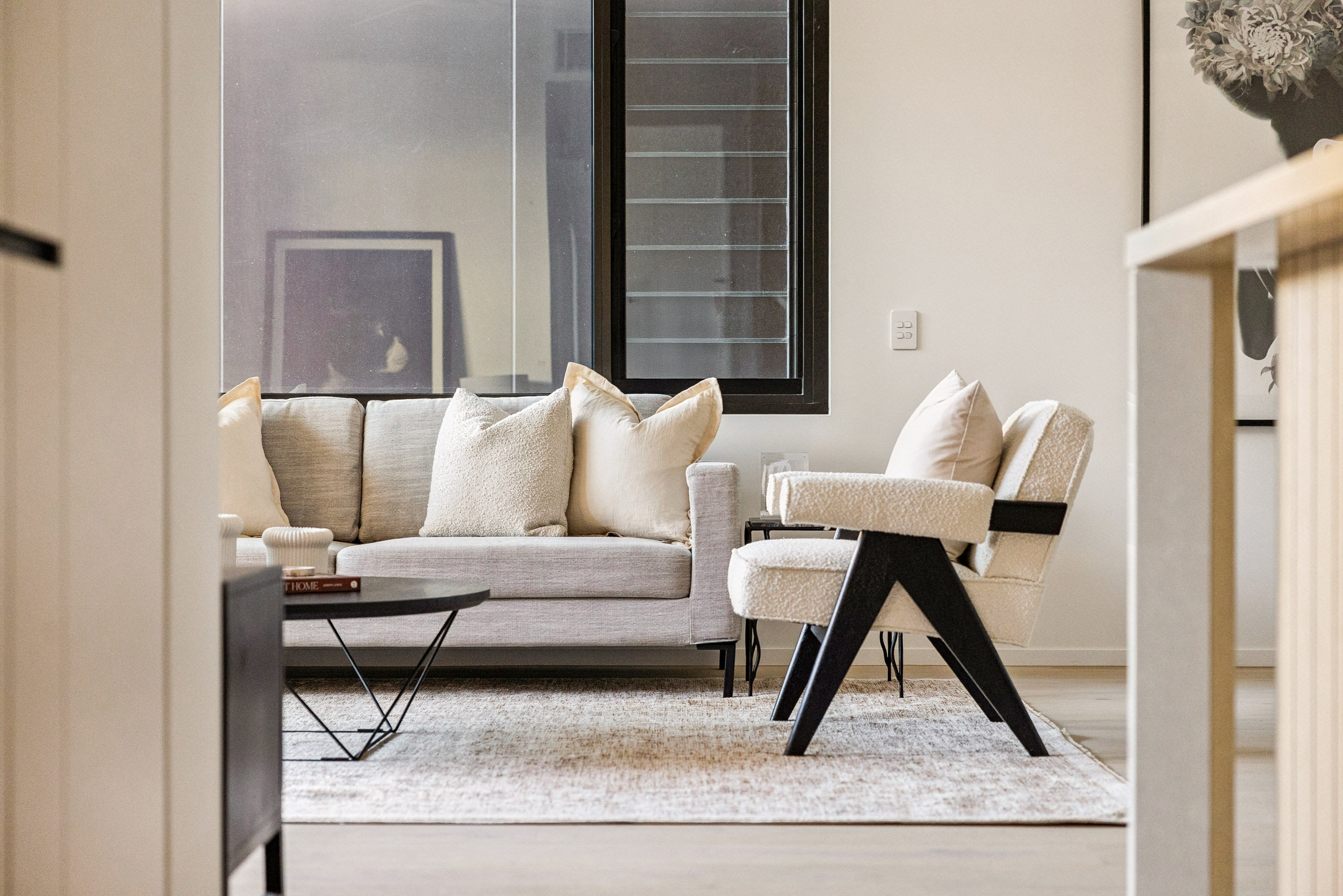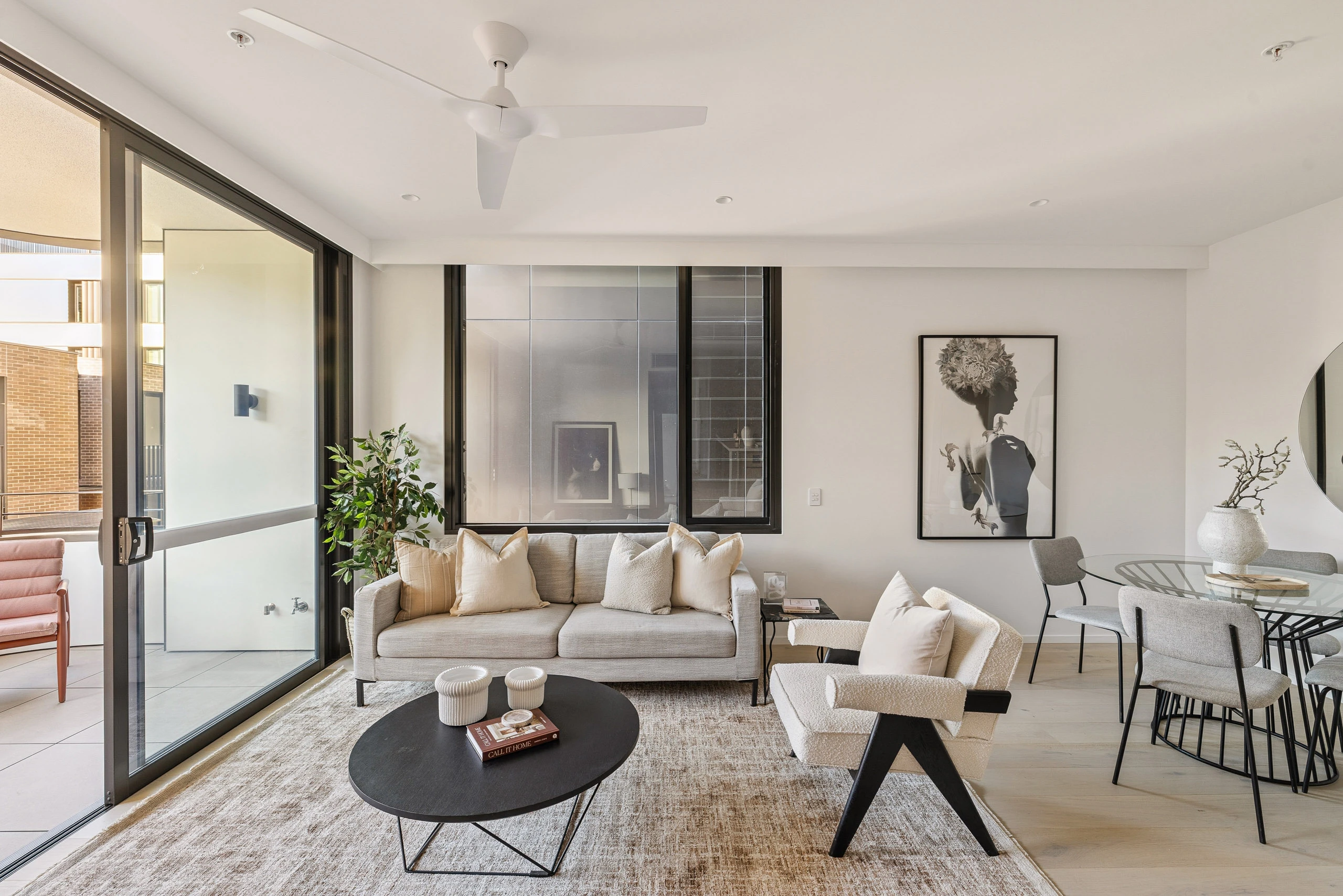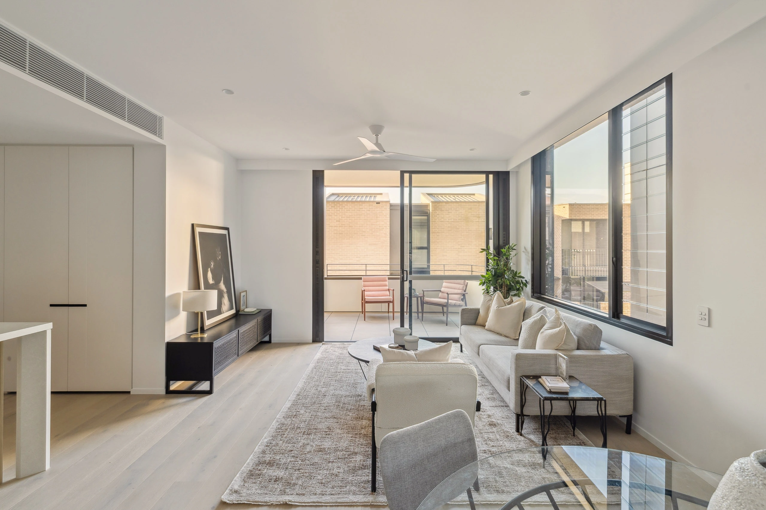 - Open living flows to balcony, wood floors