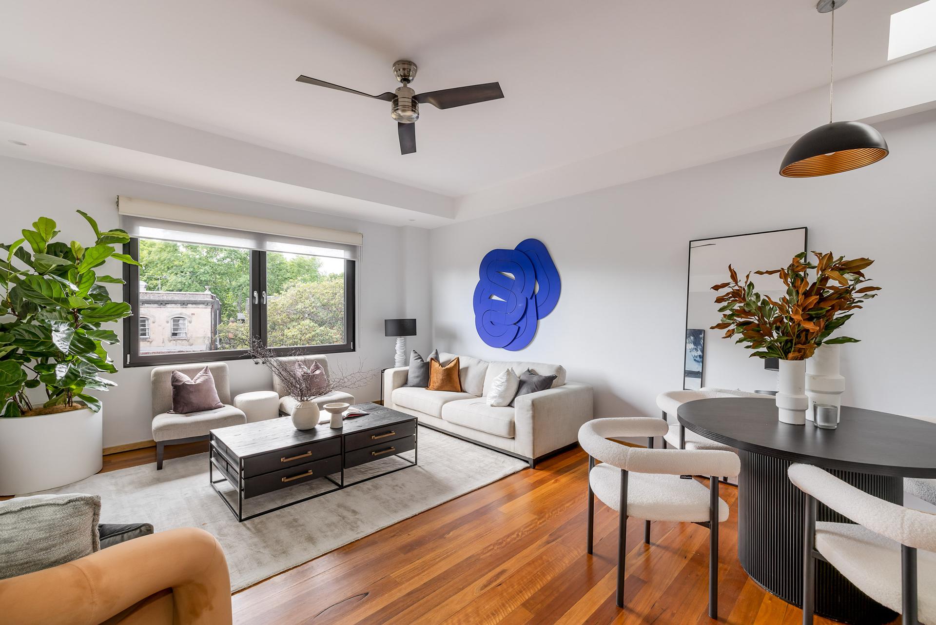 Exuding the quality and character expected of a prominent warehouse conversion, this superb apartment (104sqm + parking) occupies a prime position on the corner of Hutchinson and Flinders Streets. A meticulously designed interior showcases hard timber floors throughout, double-glazed windows for quiet and comfort, and north-east orientation that fills the apartment with morning light while keeping it cool in the afternoons. The apartment offers a thoughtful layout across two levels, with bi-fold doors connecting the upstairs bedroom to a sunlit terrace, a skylit living area, and fully renovated kitchen and bathrooms featuring high-end appliances including integrated fridge/freezer. In a boutique complex of 20 apartments with lift access, impressive common foyer entry and lockable car park storage, it has dual street access city and Harbour Bridge views from the roof terrace, and easy access to Crown Street, Woolworths, and local parks and cafes.