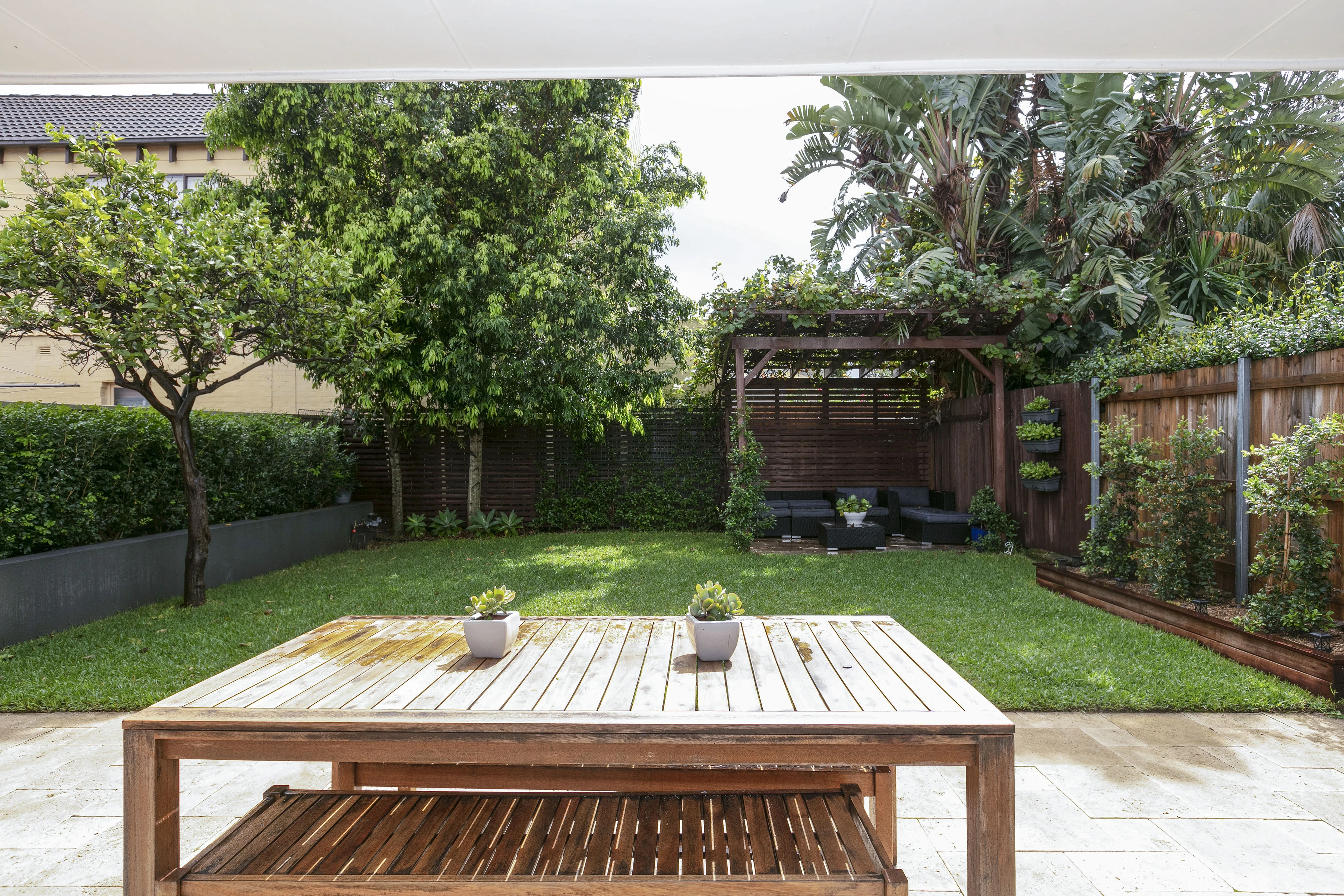 - N-facing yard, lawn, patio + pergola