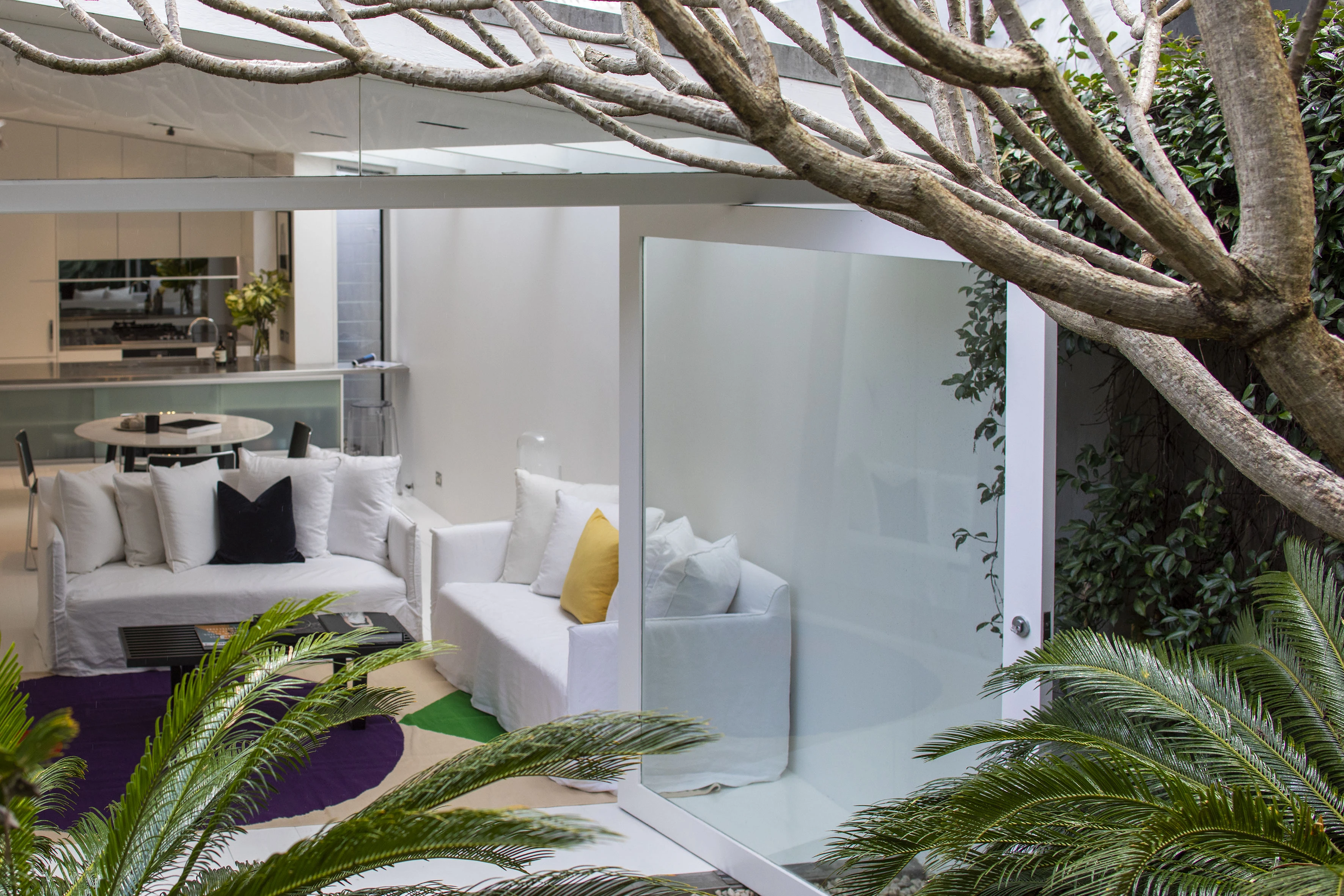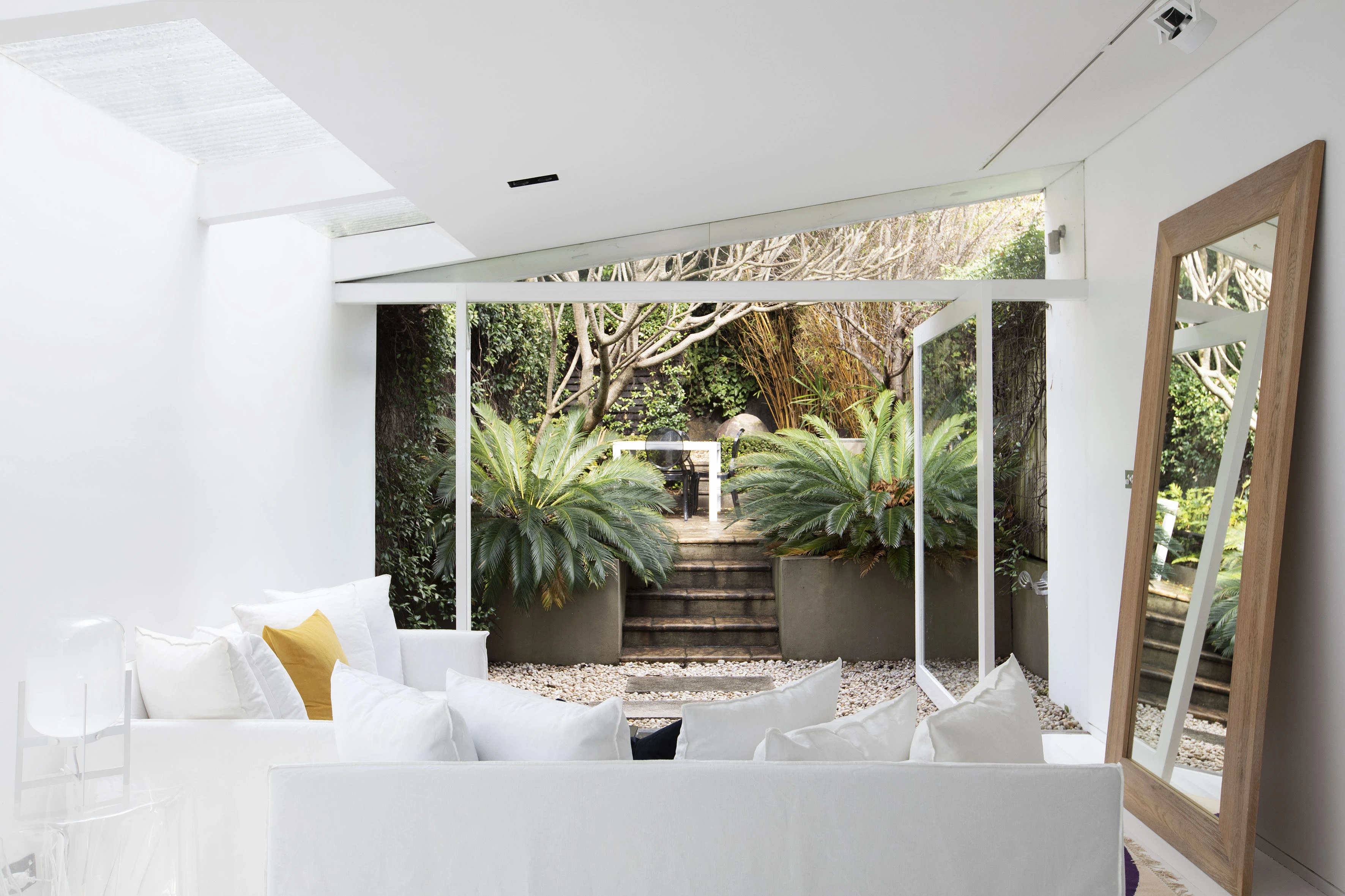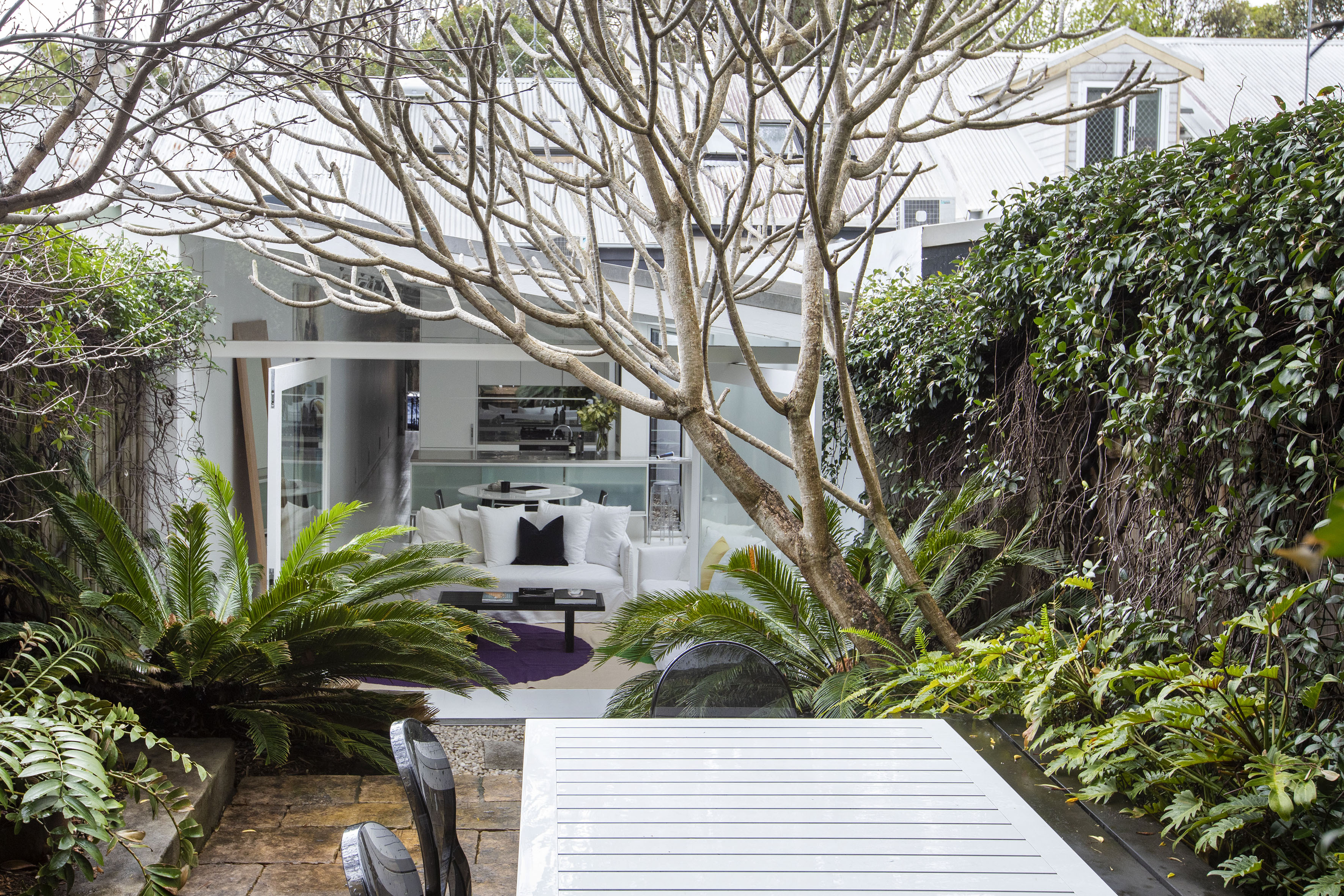 Renovated with precision & flair, this home is an impressive reinvention of a terrace. With skylights & pivot doors to a green garden scene, it lives & breathes throughout its clean white interiors.