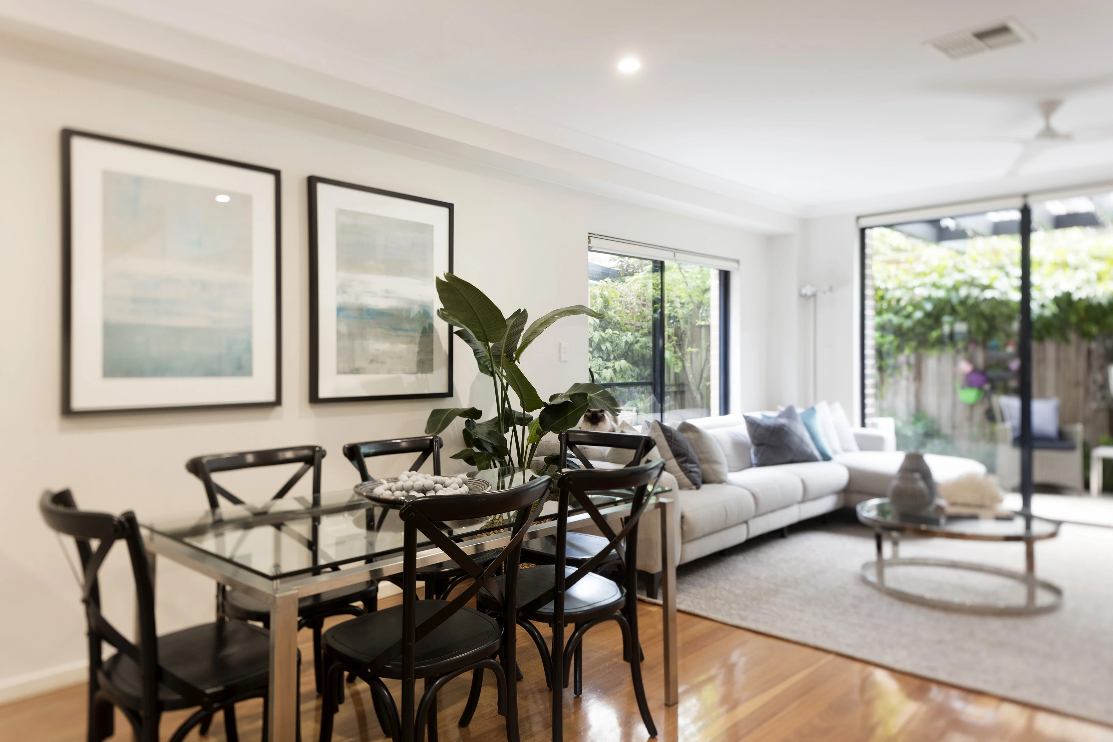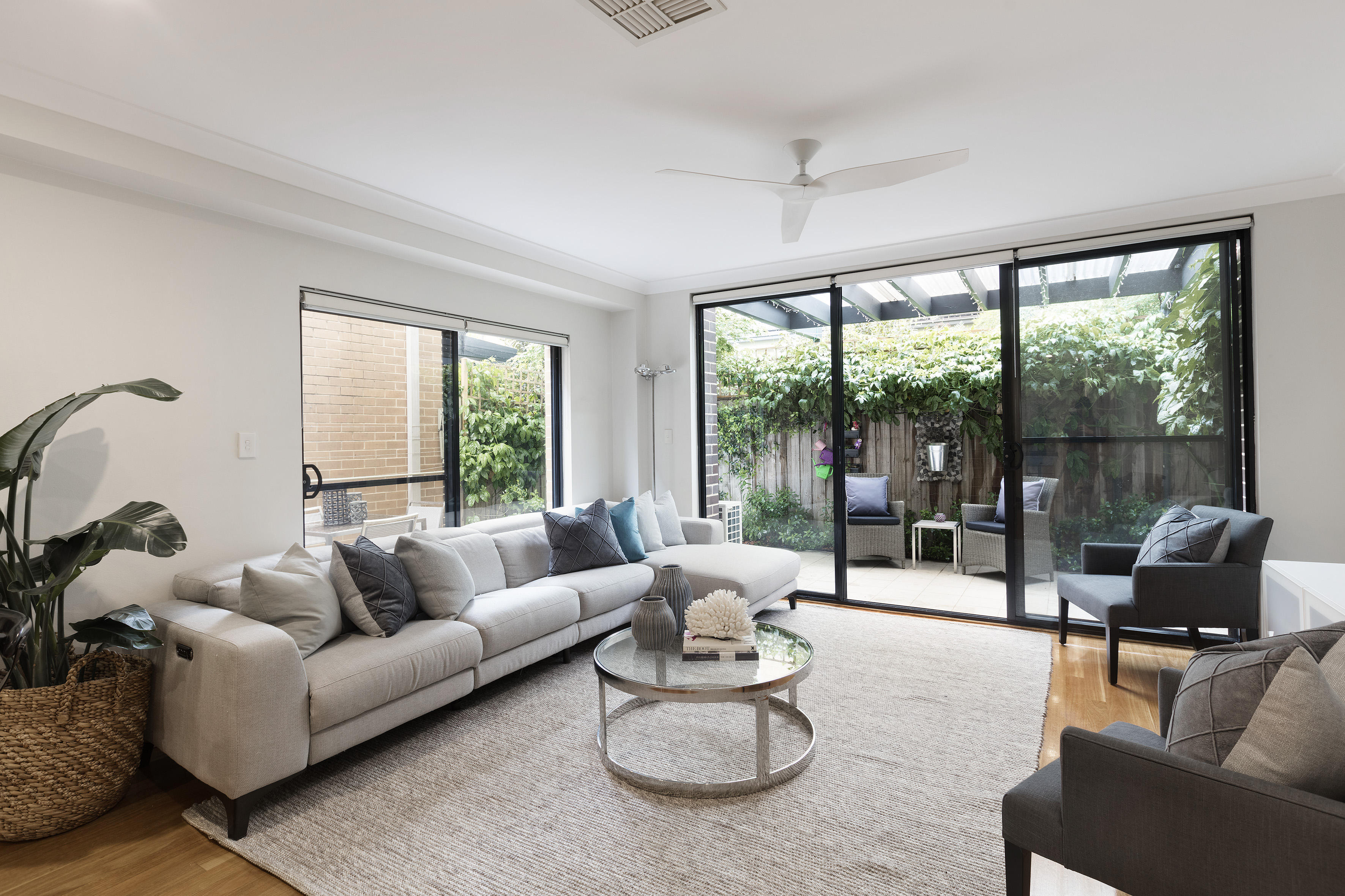 With contemporary space across three levels this townhouse opens to a wrap-around courtyard & private green backdrops. In a modern security building, a village lifestyle is at your door.