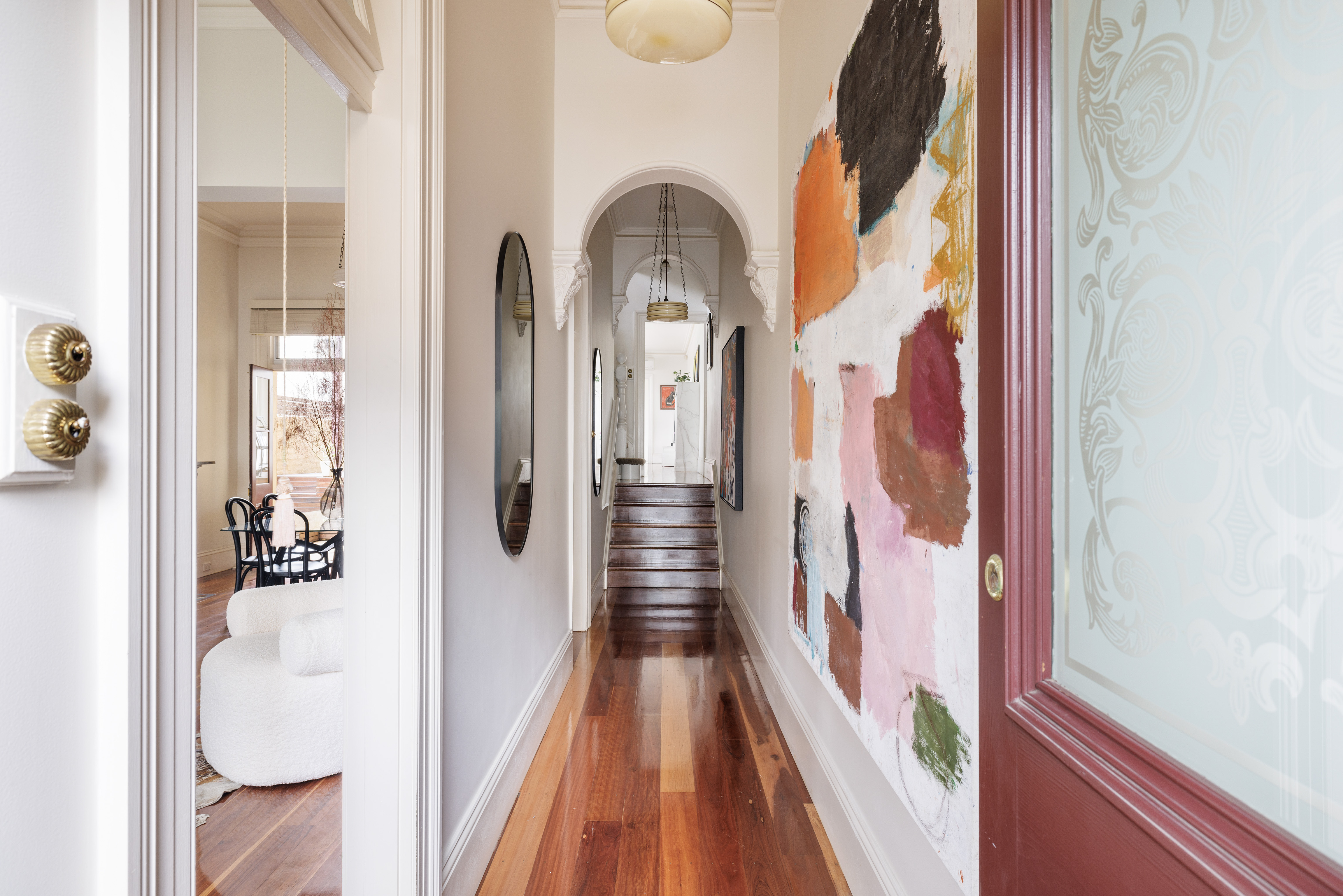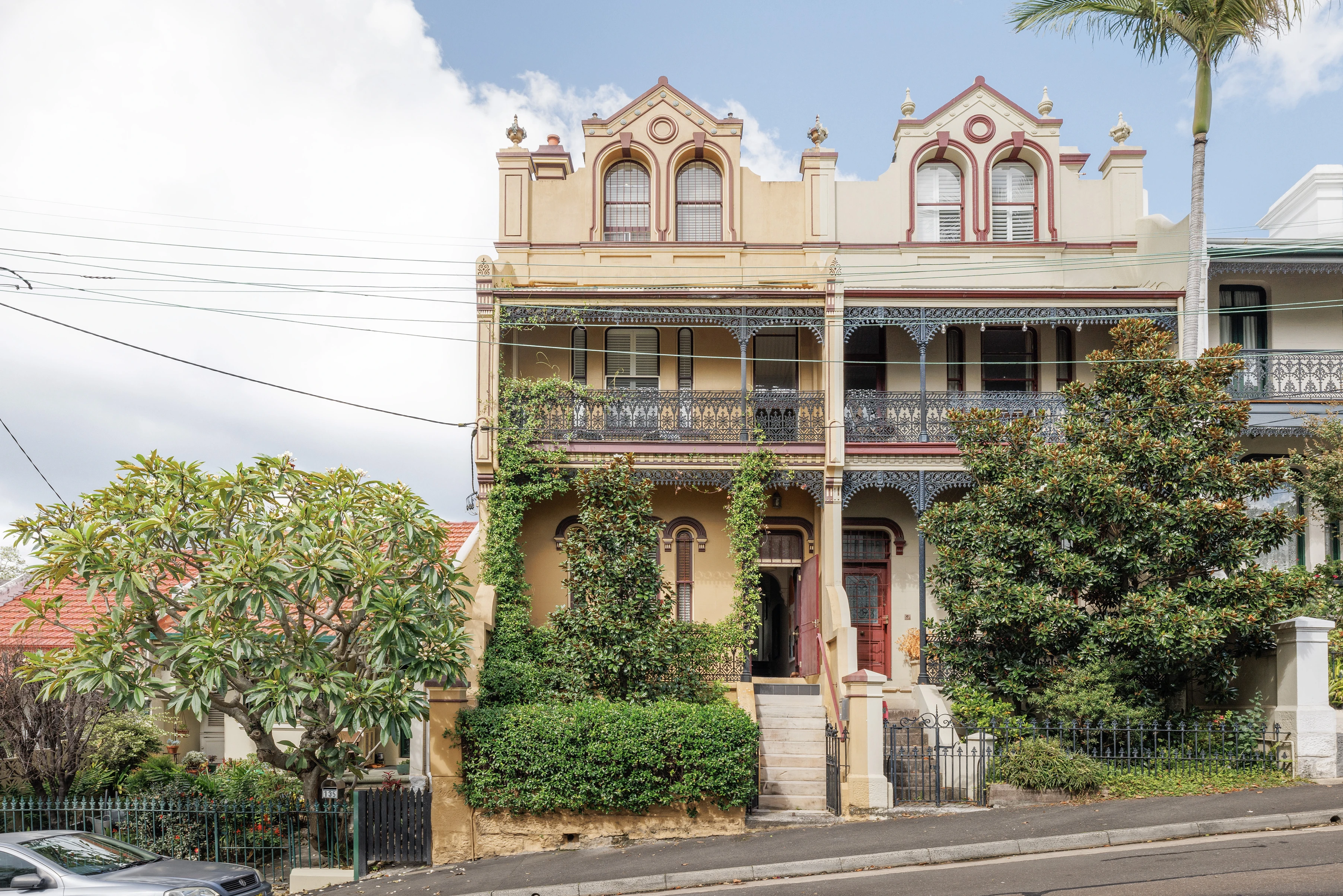 One of the area’s substantial landmark terraces, this residence was designed to be freestanding on the NE side, ensuring an impressive level of natural light for a Victorian home. Set on a block of more than 6m wide, it delivers separate family living spaces and unique oversized sensations across three levels, along with city panoramas from the upstairs balcony.