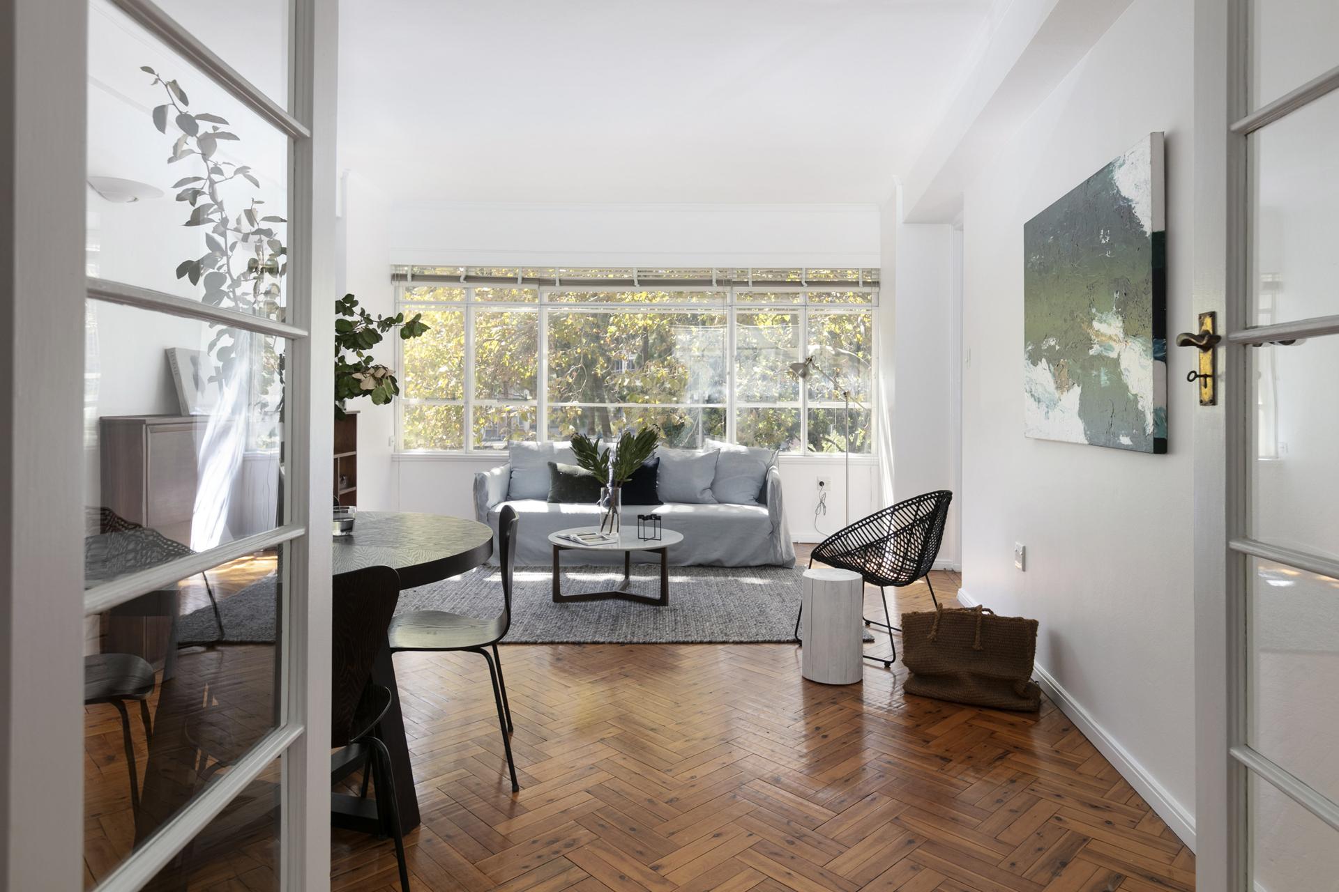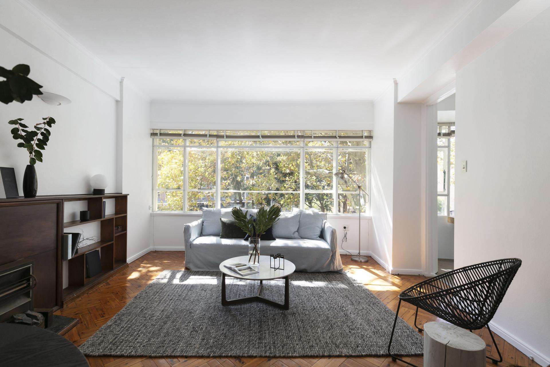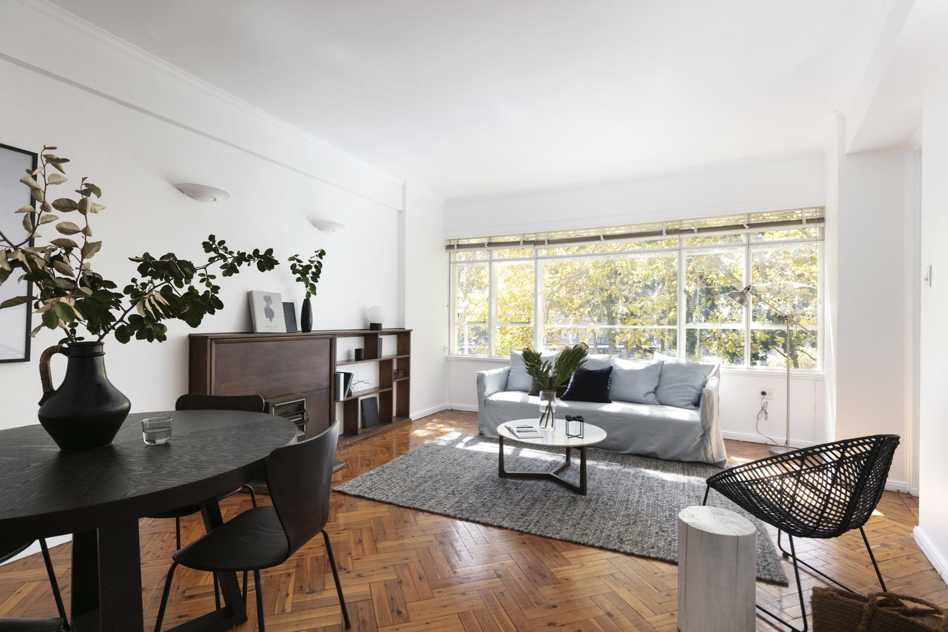 In a spectacular & prominent 1951 building, this updated apartment enjoys full-width windows wrapping its north side and a generous scale. Aaron Bolot architectural cred + lifestyle at the gateway to Macleay St village.