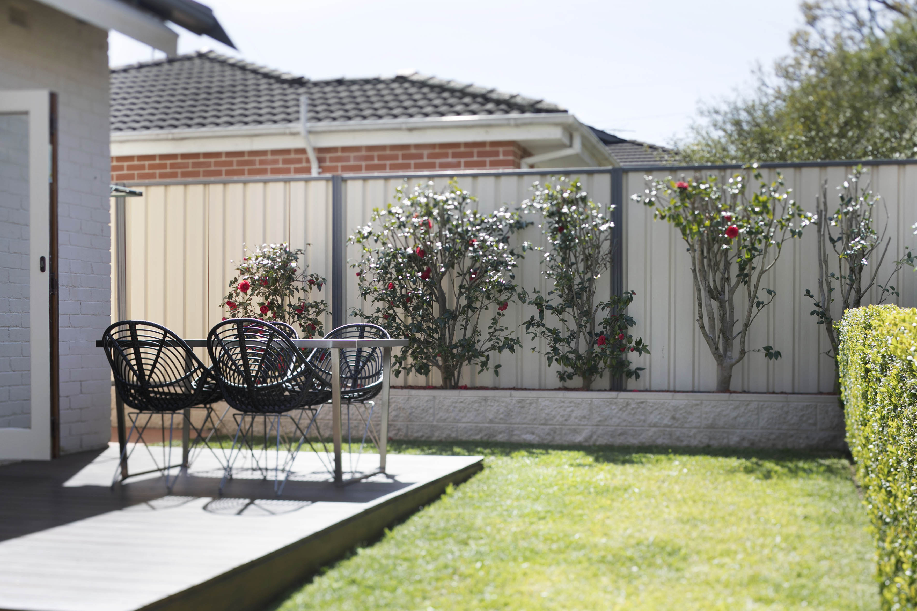 - Sandstone front fence, manicured garden