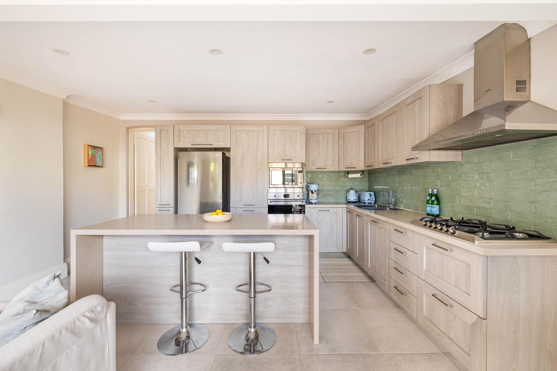 - Stone kitchen, stainless steel gas cooktop