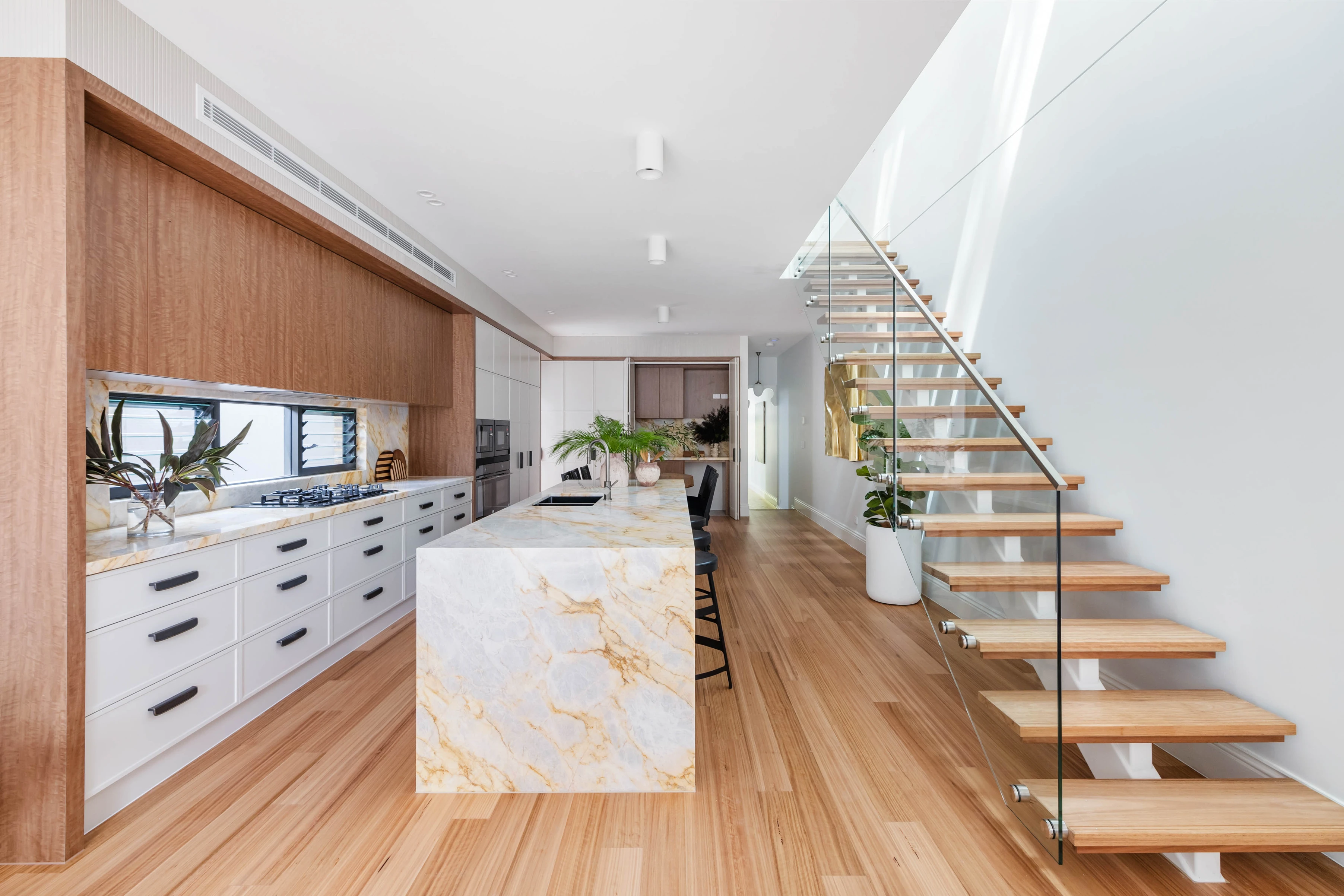 - Gas, marble island, integrated appliances