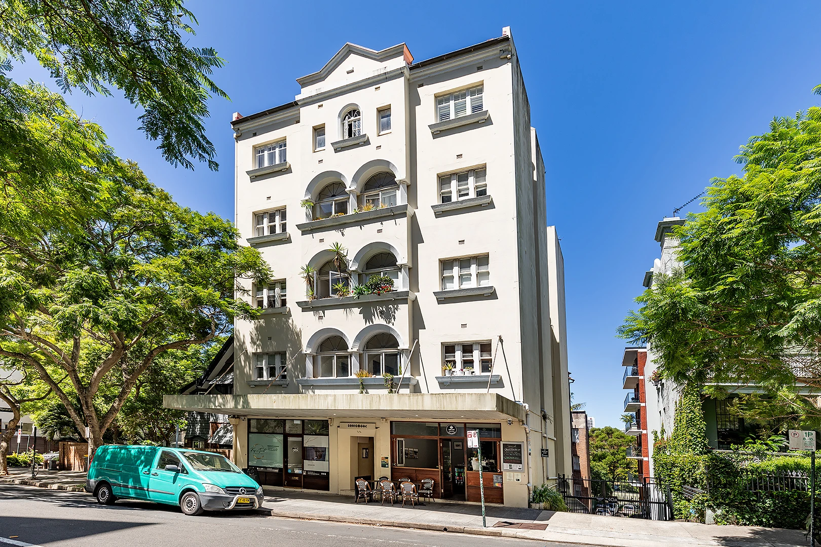outlook to Darling Point. Wander downstairs for coffee at Café C&M on the building's entry