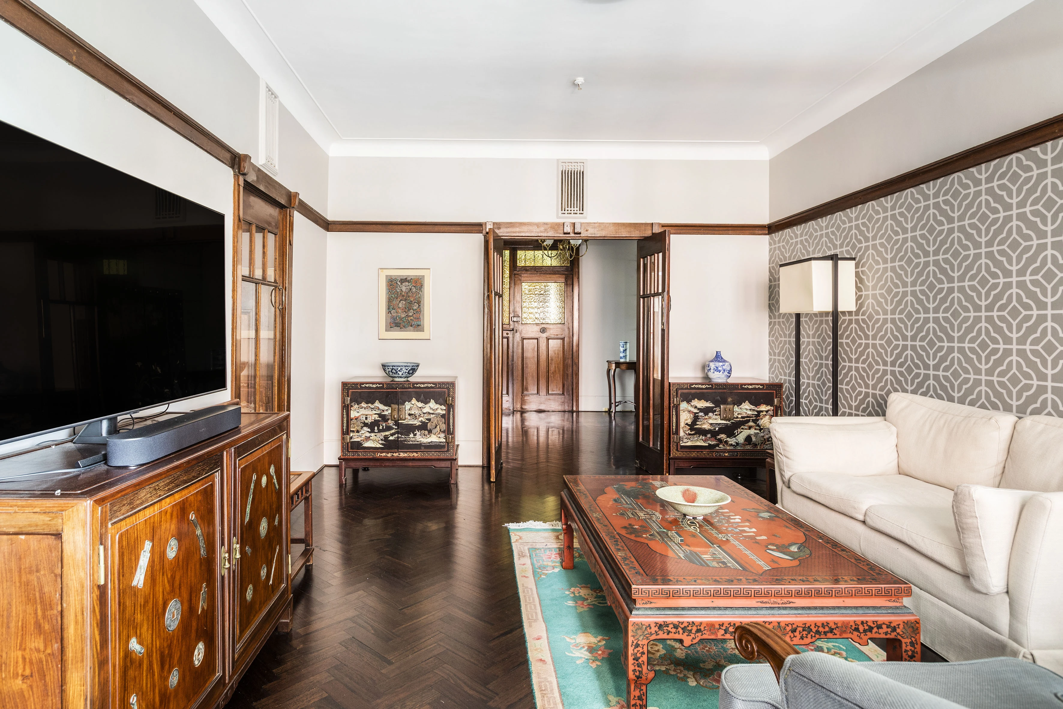 - Herringbone parquetry, timber accents