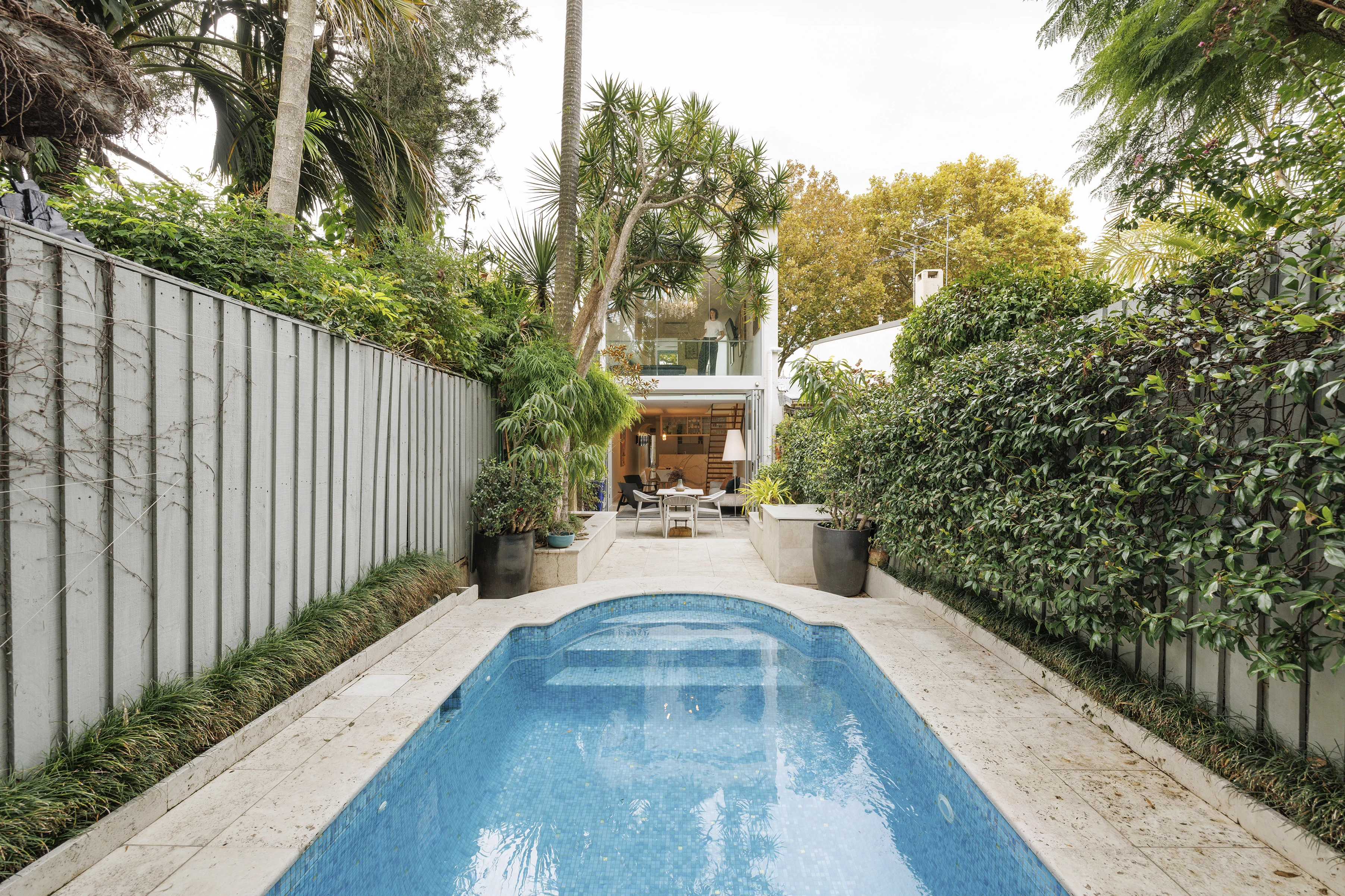 - Double-height glass overlooks pool/garden