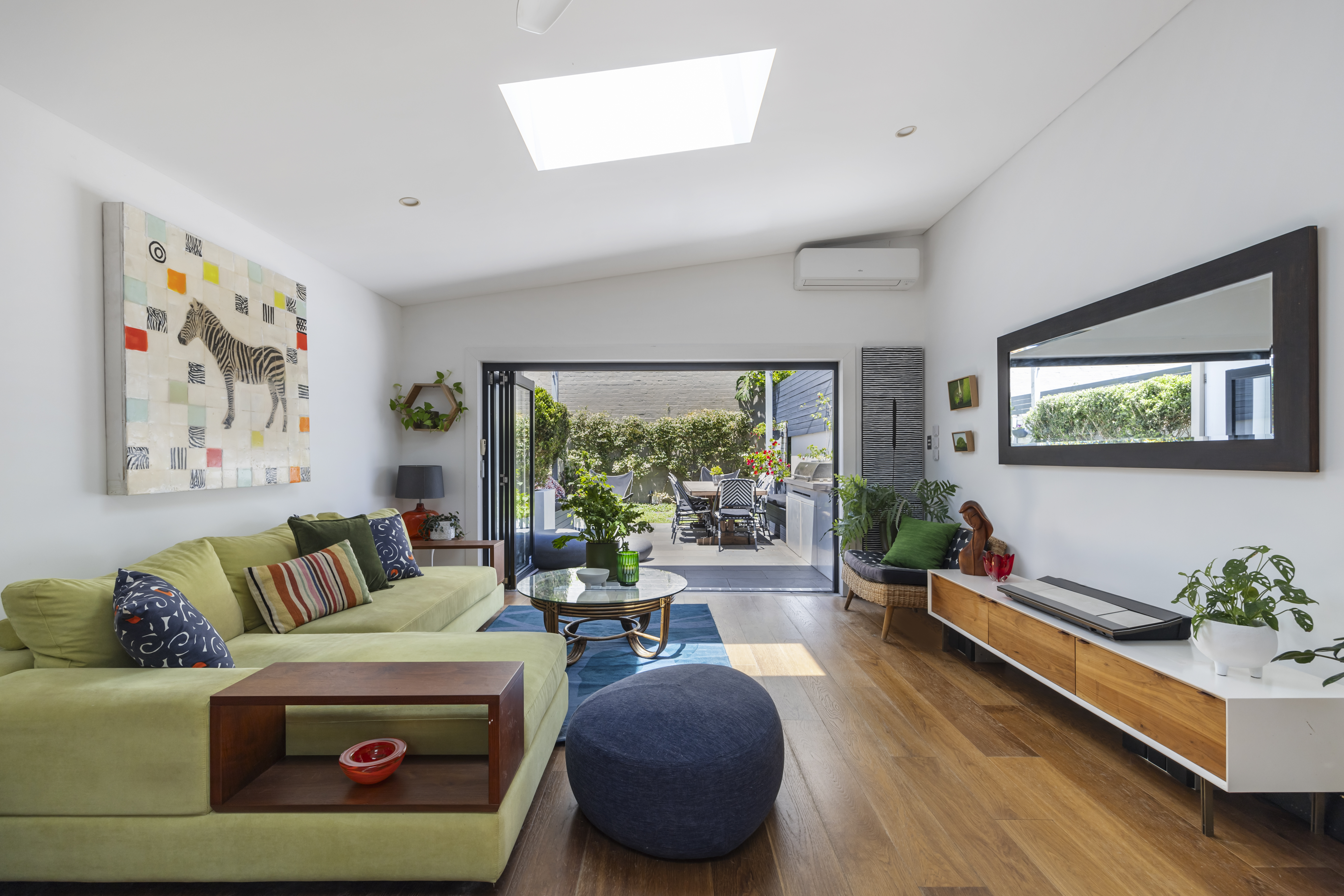 - Living opens outdoors via bi-fold doors