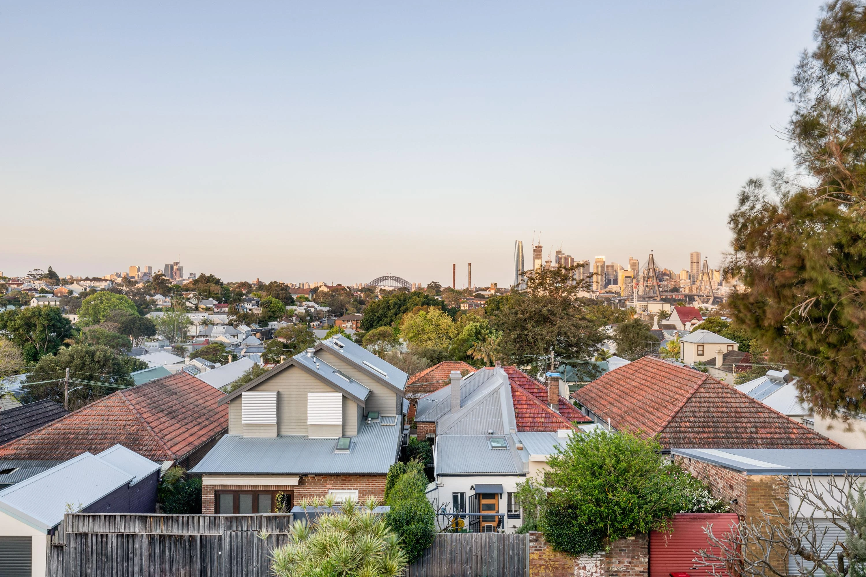 Generous and well-appointed over three levels, this East-facing family residence enjoys spectacular panoramas of the city skyline and Harbour/ANZAC Bridges from its top two levels plus a generous landscaped garden and rear parking.
