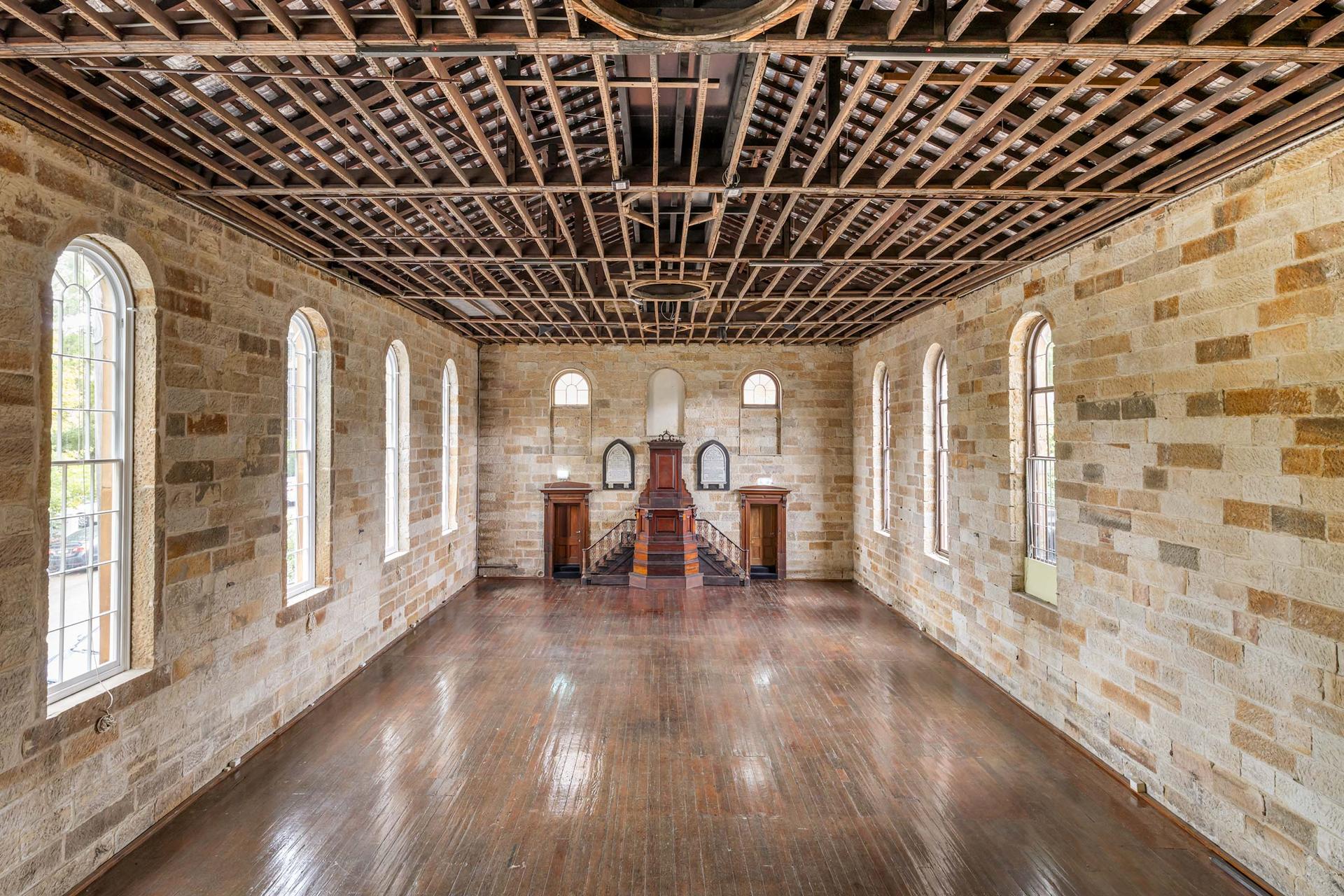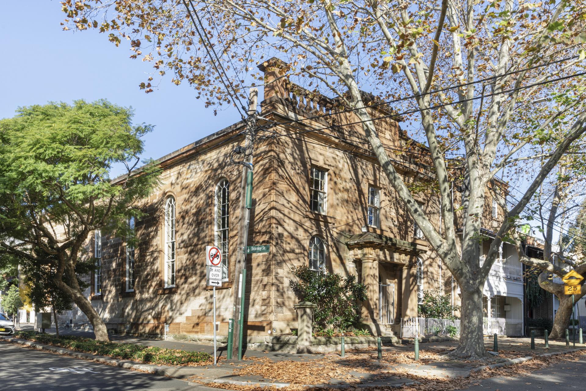 A landmark sandstone building from 1856 on the corner of Palmer and Stanley Streets. The freestanding, single level building offers immense scale and volume, with its rich historical personality still in tact. Original sandstone walls, enormous arched windows, original wide hardwood floors & timber vaulted ceilings.