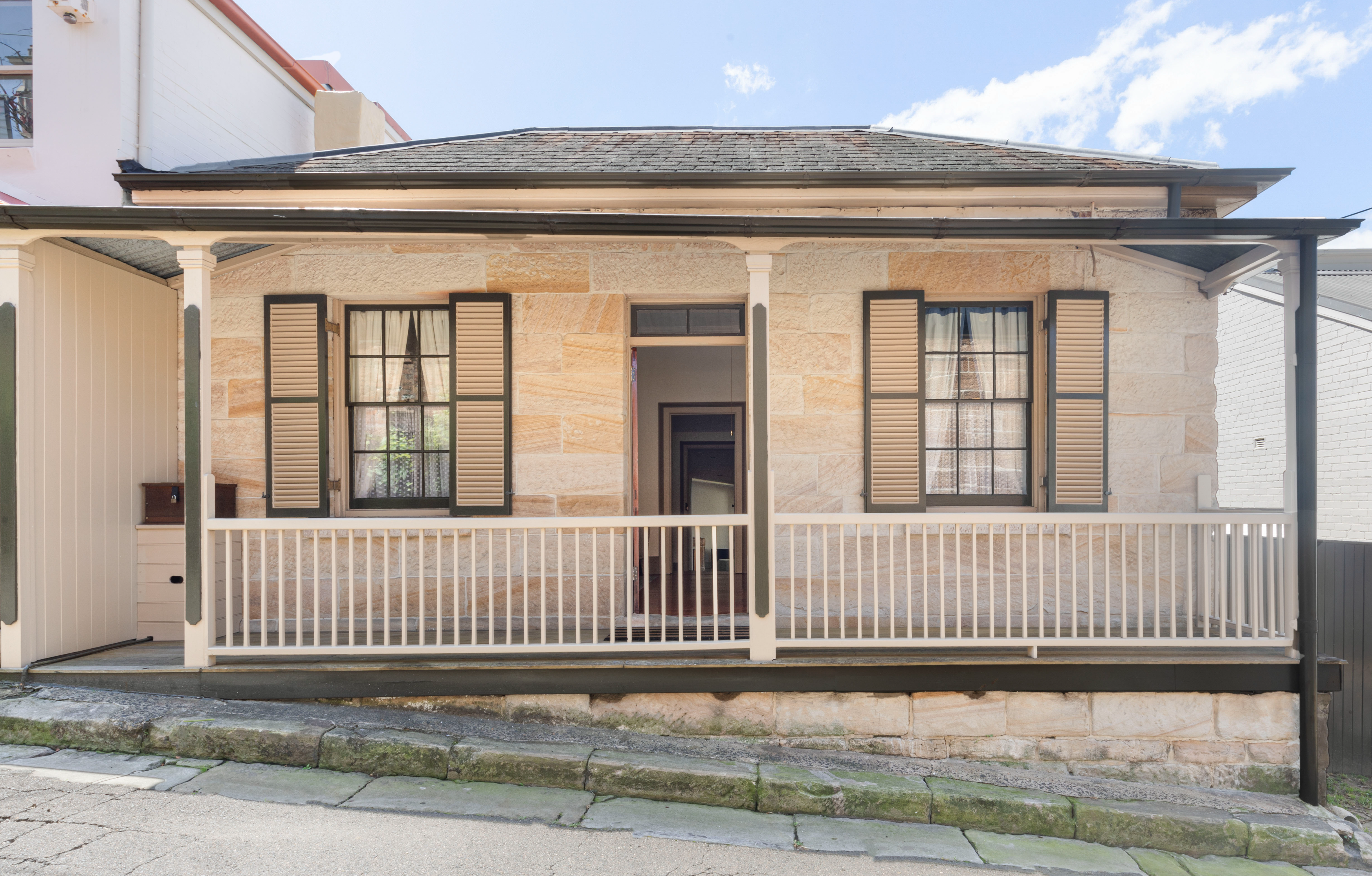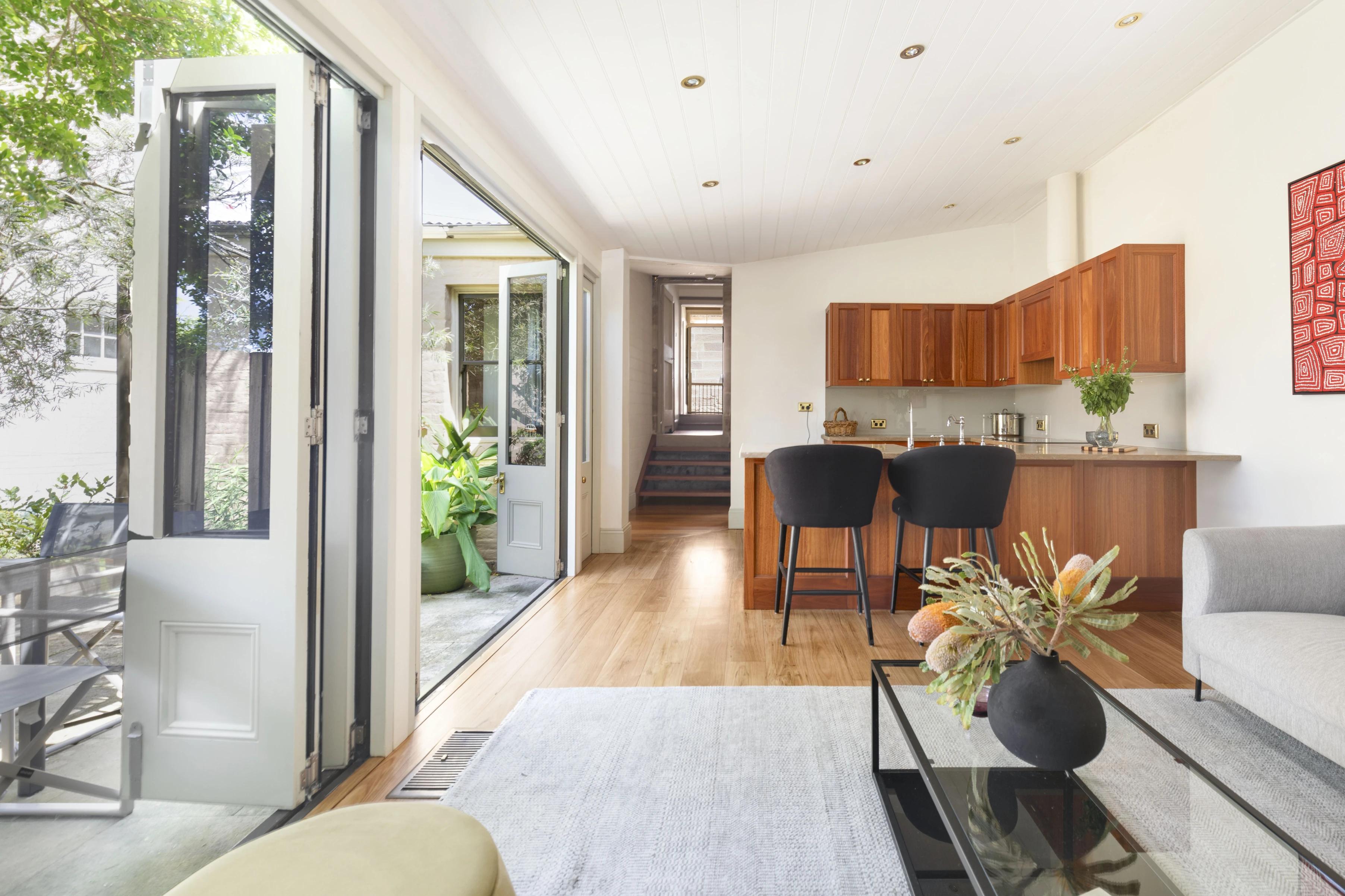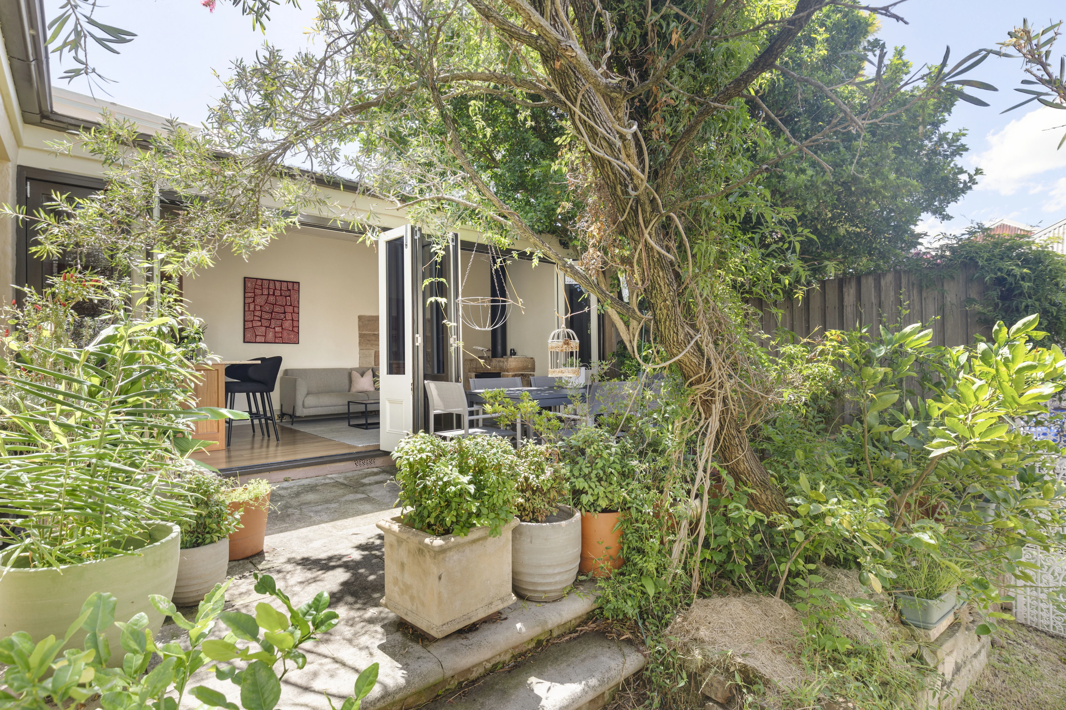 A double fronted sandstone cottage in a central Balmain village location, it's been preserved and extended into a residence of 3 living zones and beautiful alfresco connection. It opens out through bi-folding doors to a secluded north-facing courtyard and grassed side area (not permitted for parking or building, therefore perfectly preserved for children or dogs).