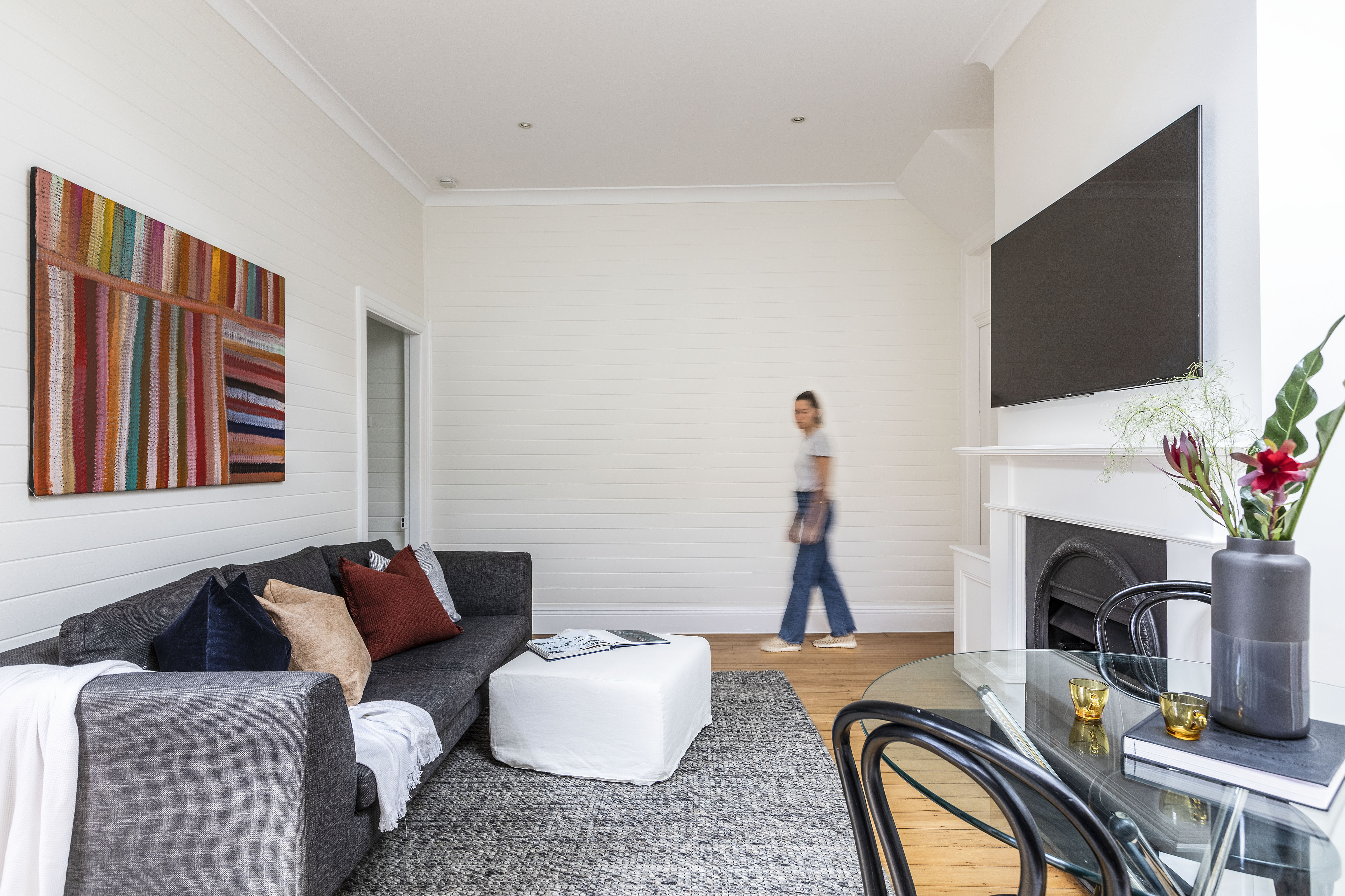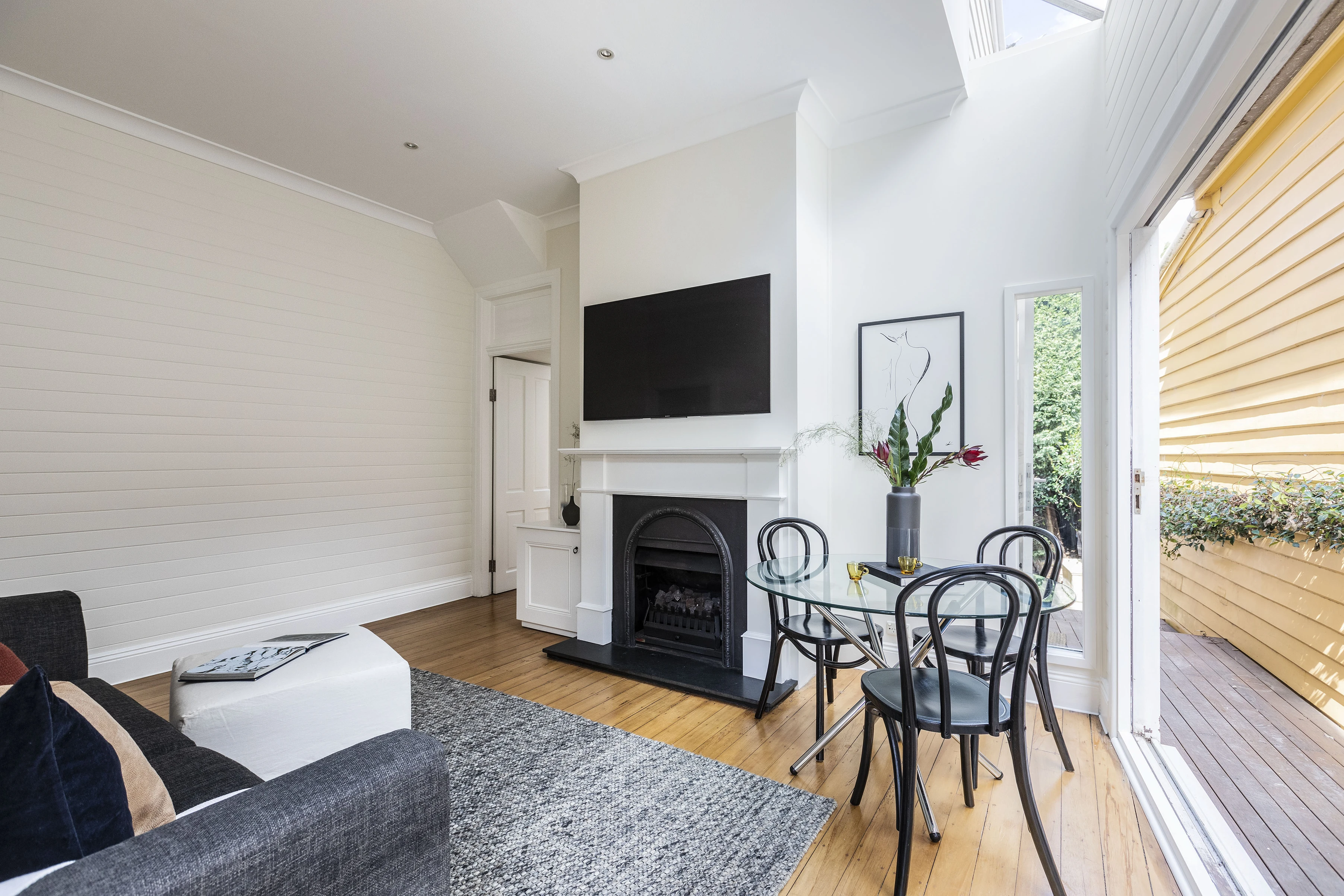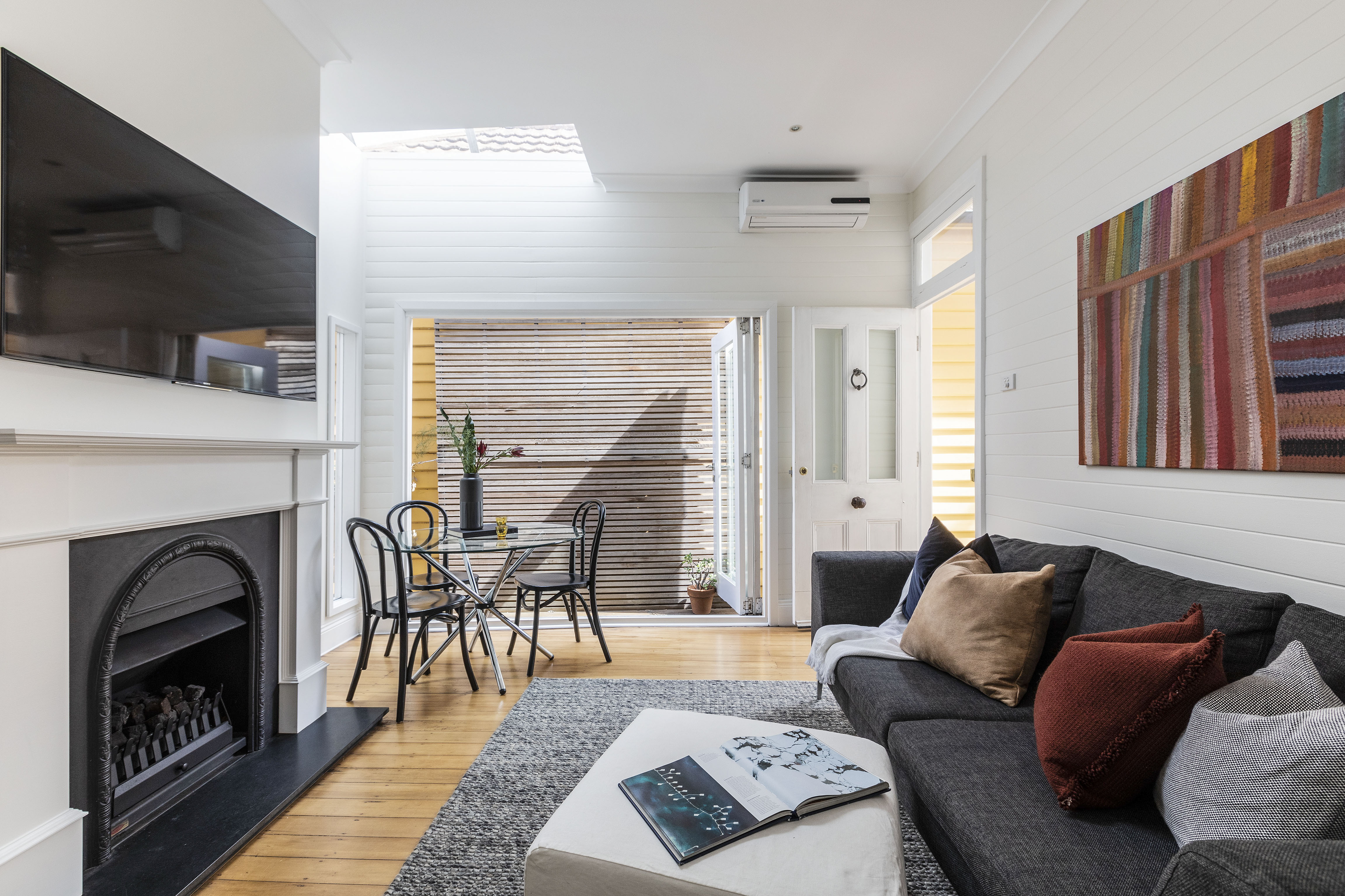 This standalone house has a breezy holiday ambience from its panelled walls, overheight ceiling and glazing bringing natural light throughout. In a peaceful peninsula street, it’s so close to the city here.