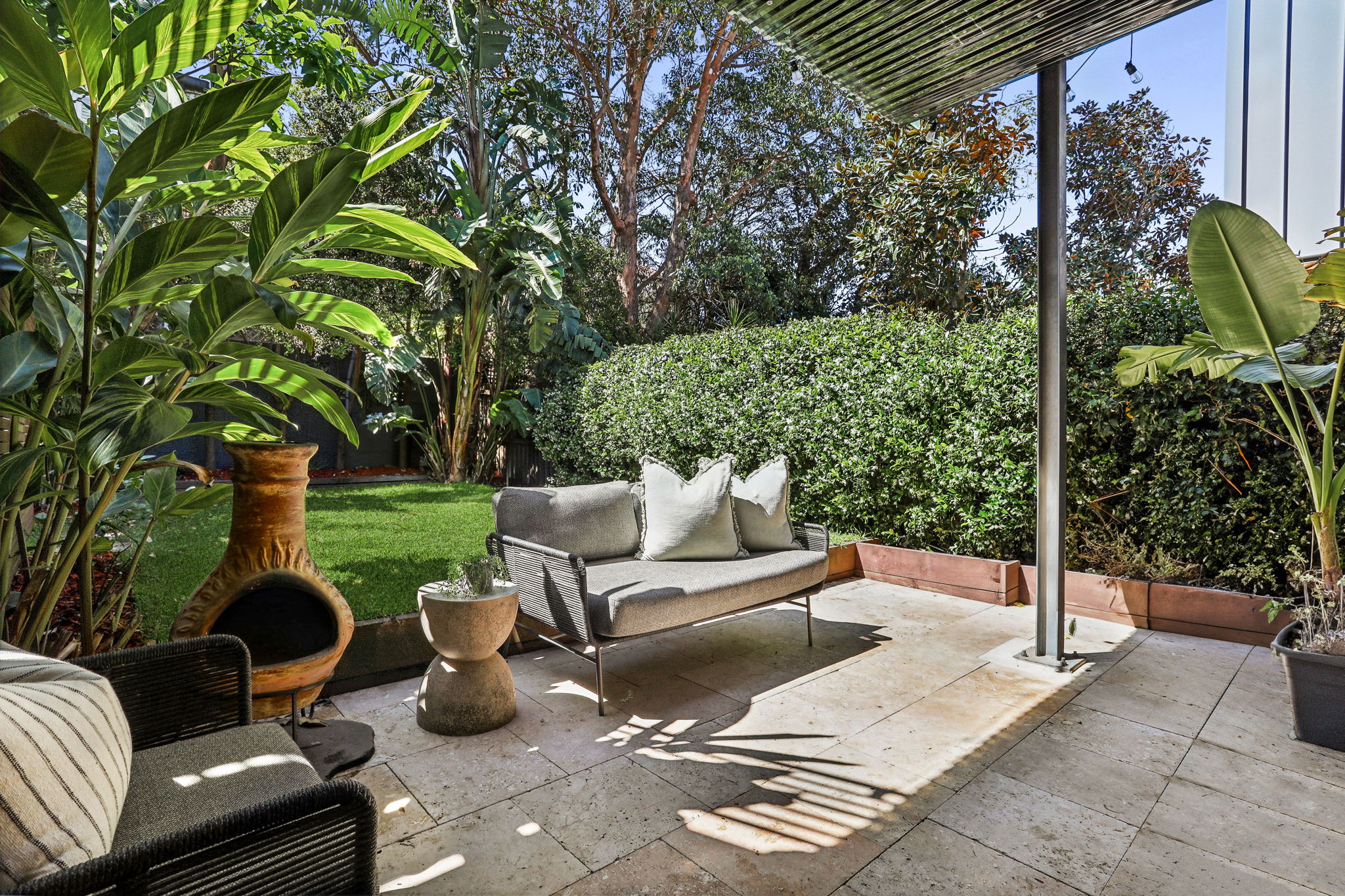 - Child-friendly level backyard amid beautiful established gardens