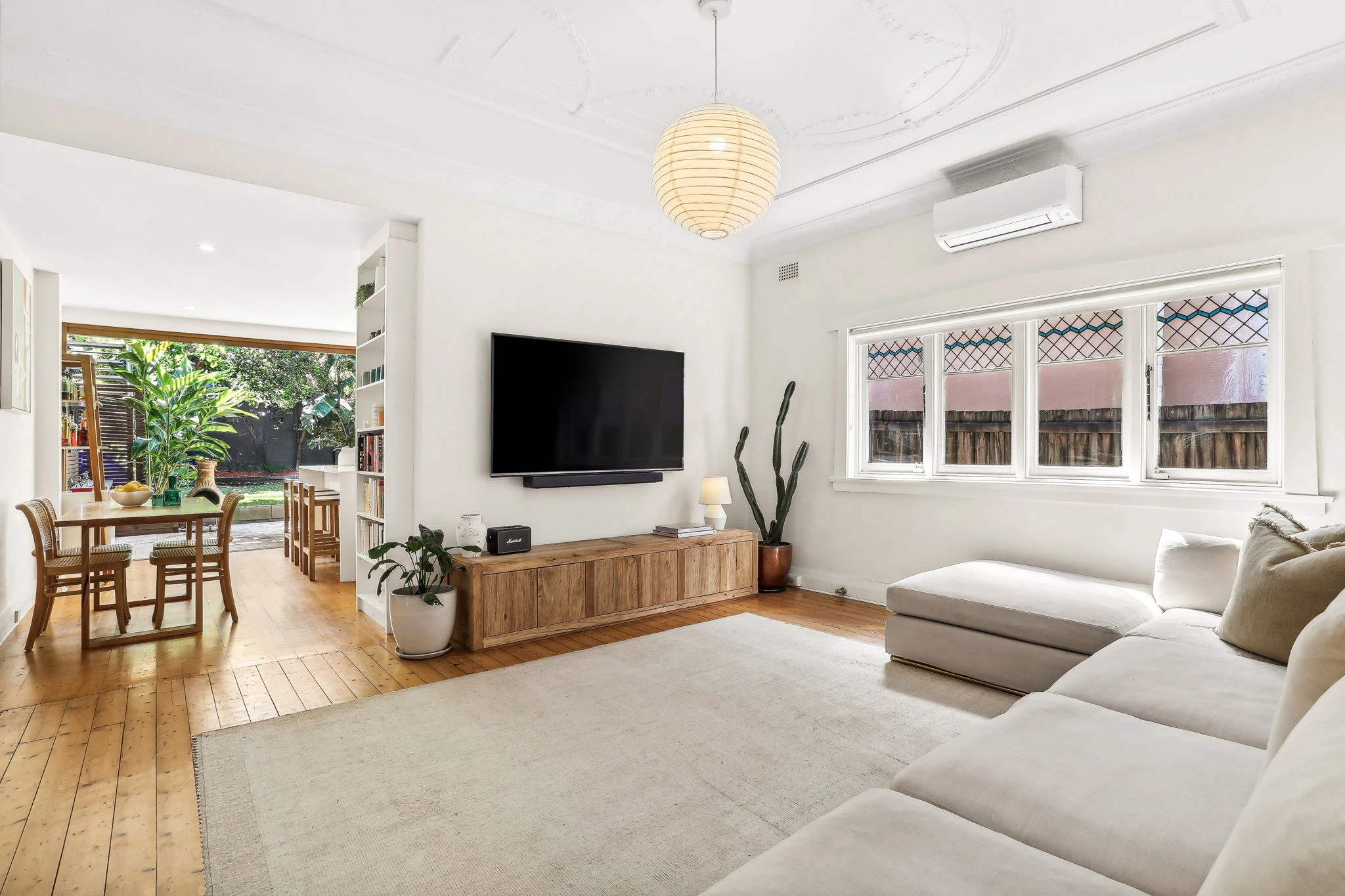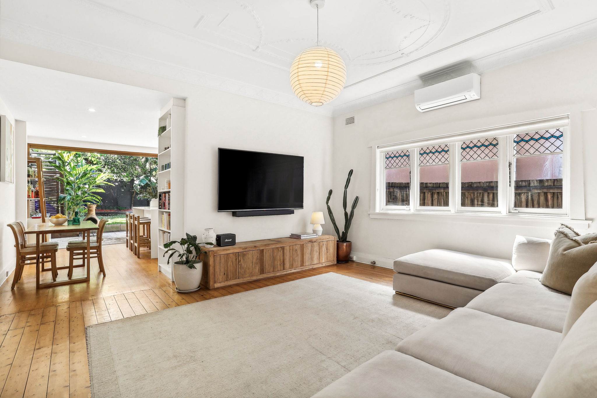 - Timber floorboards, high patterned ceilings, pendant lighting