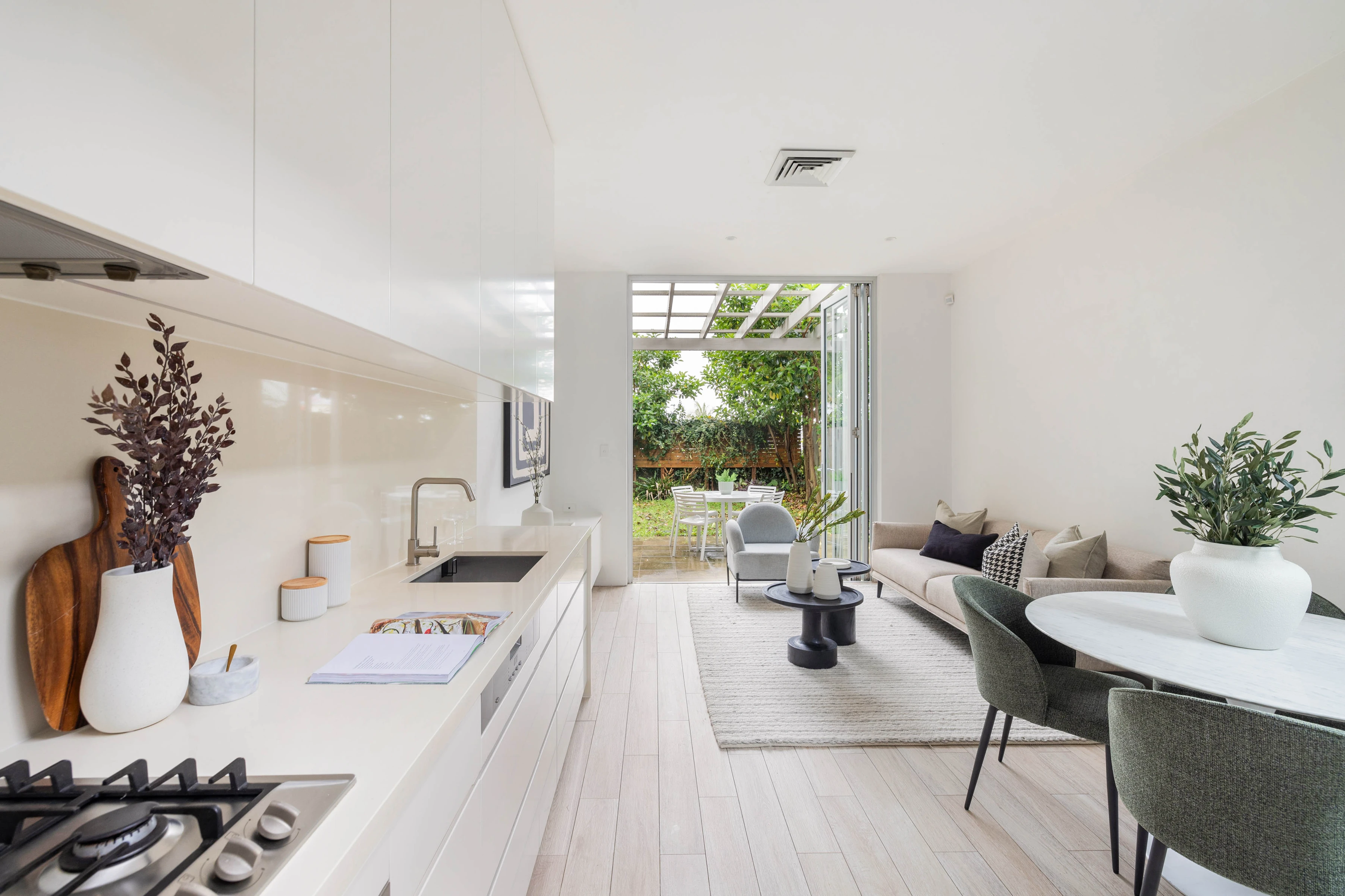 - Separate living spaces, timber flooring