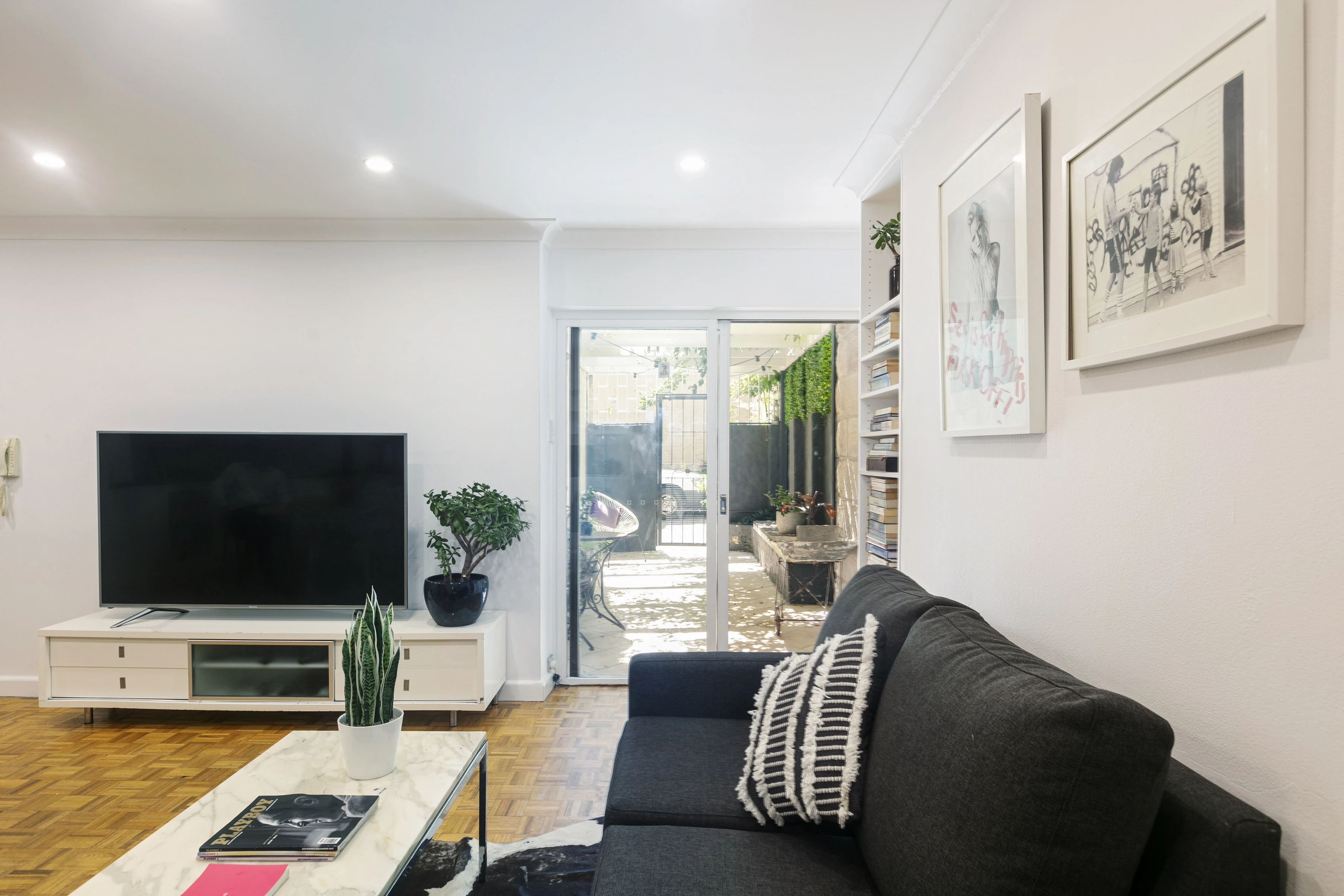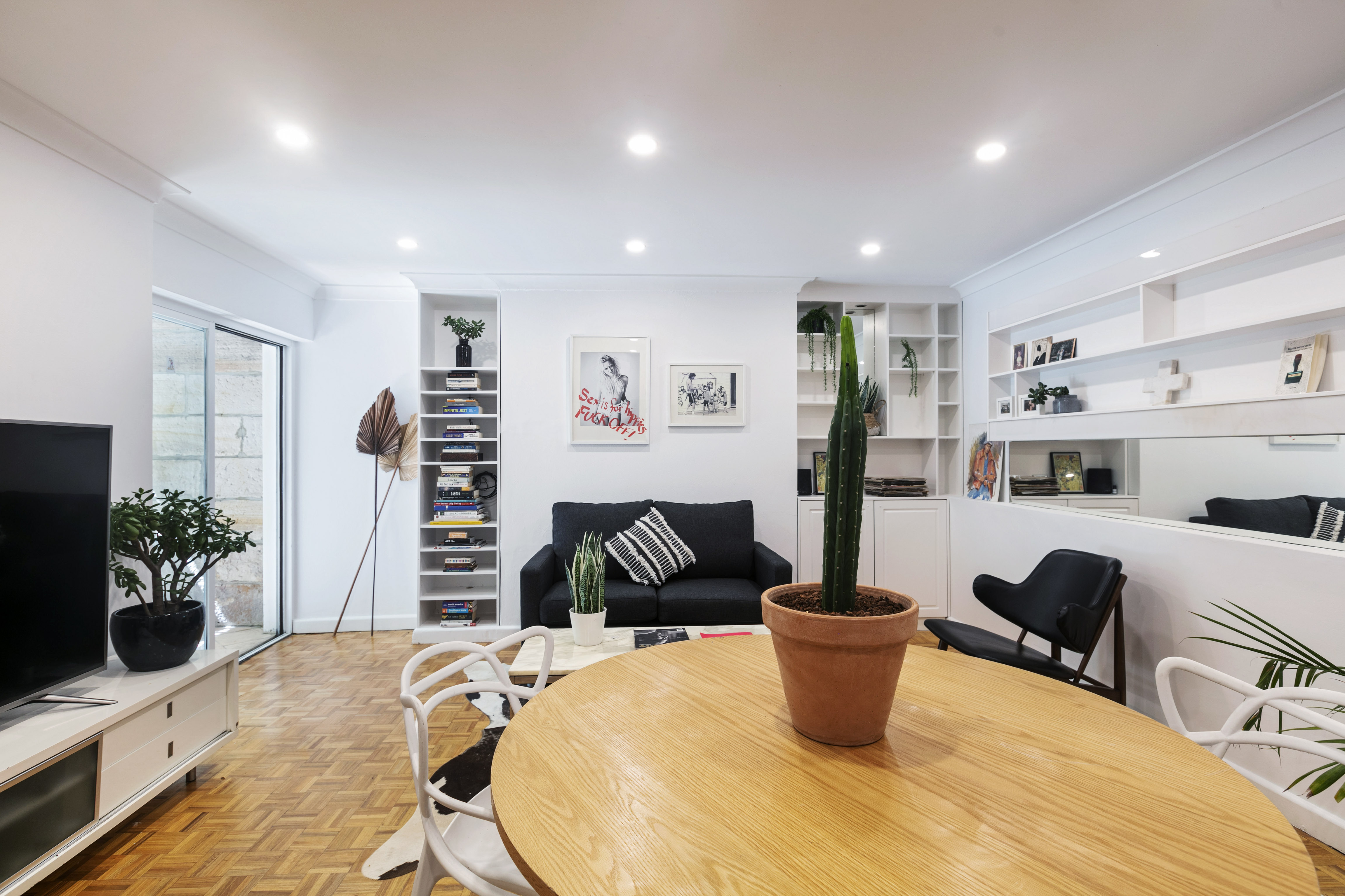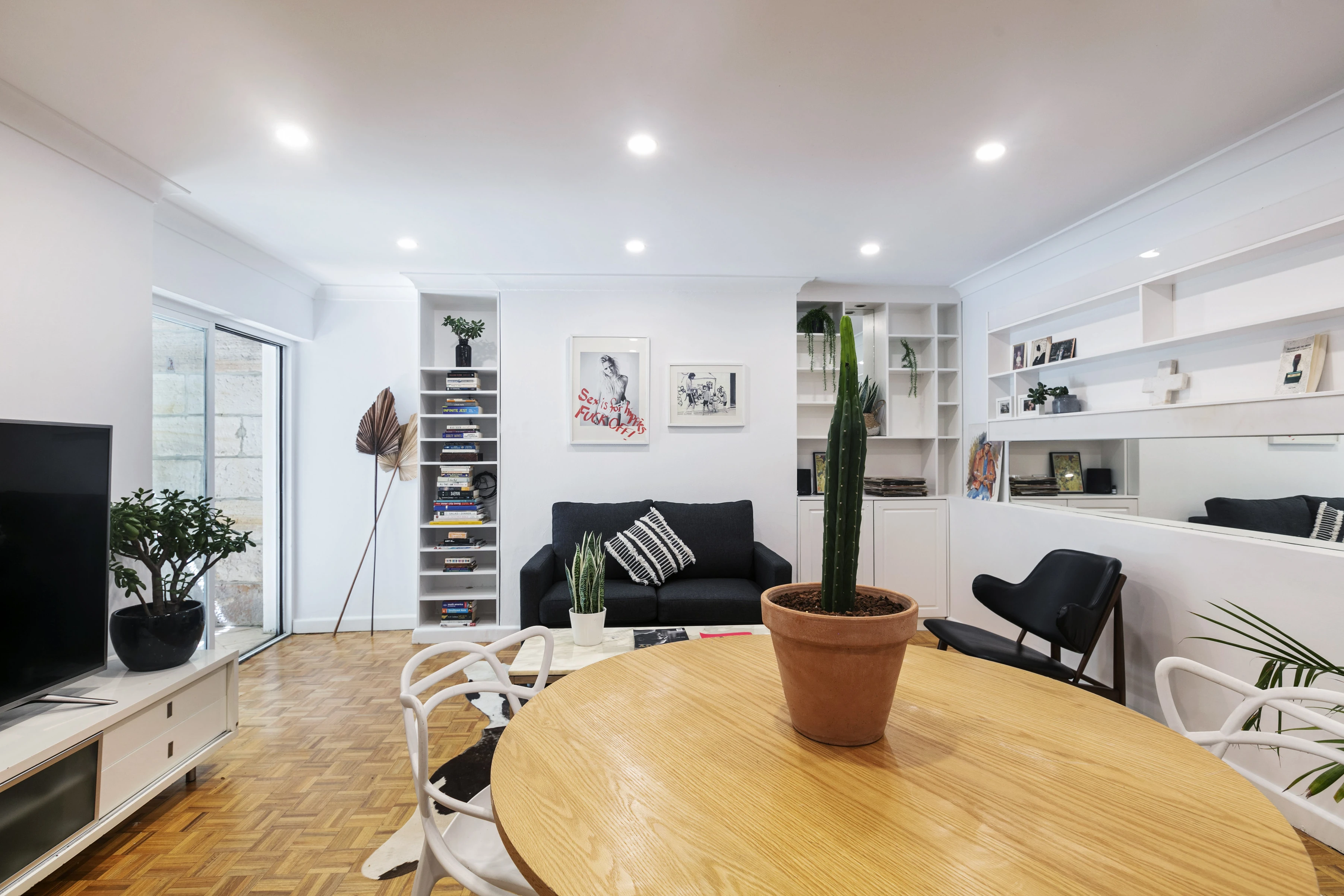 - Open living, parquet floorboards