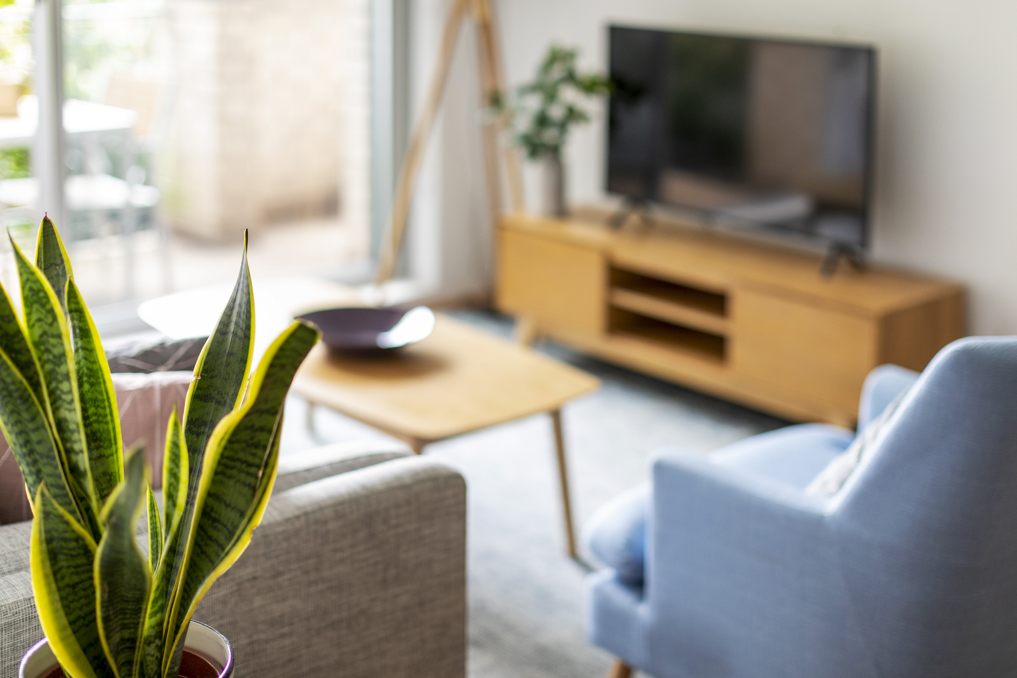 - Open living, sliding glass to balcony