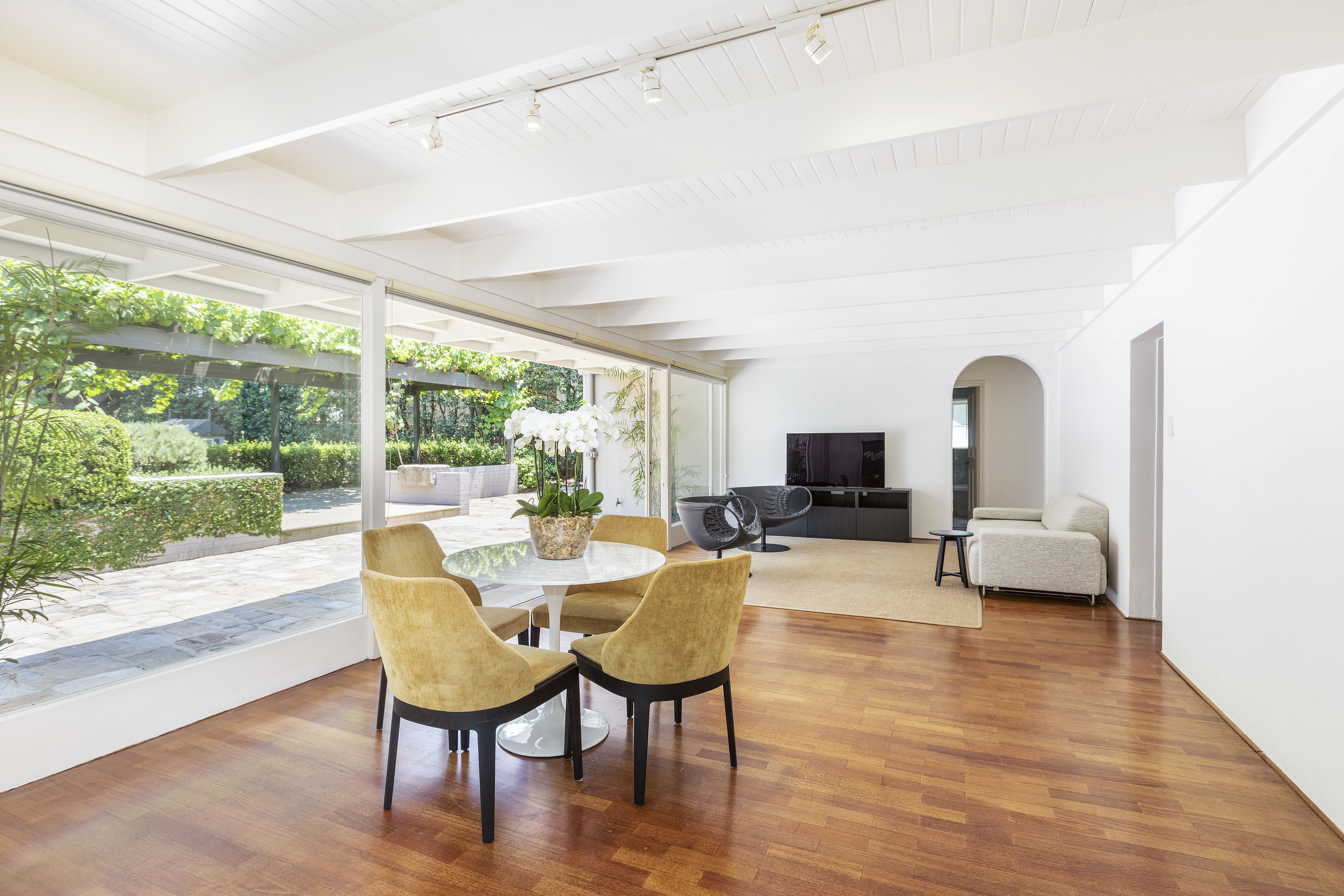 - Vine-covered alfresco entertaining area
