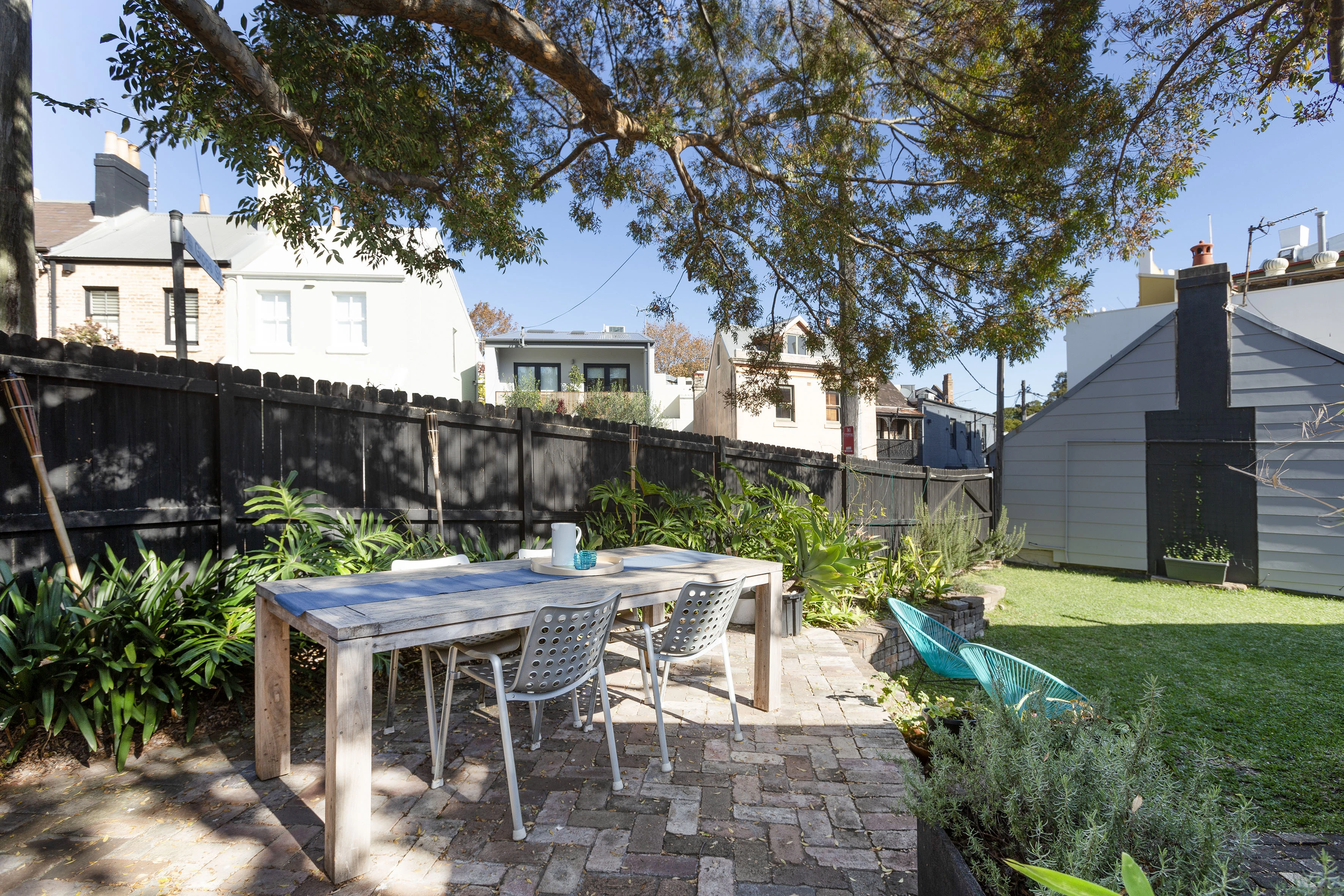 - Rear patio in established garden scene