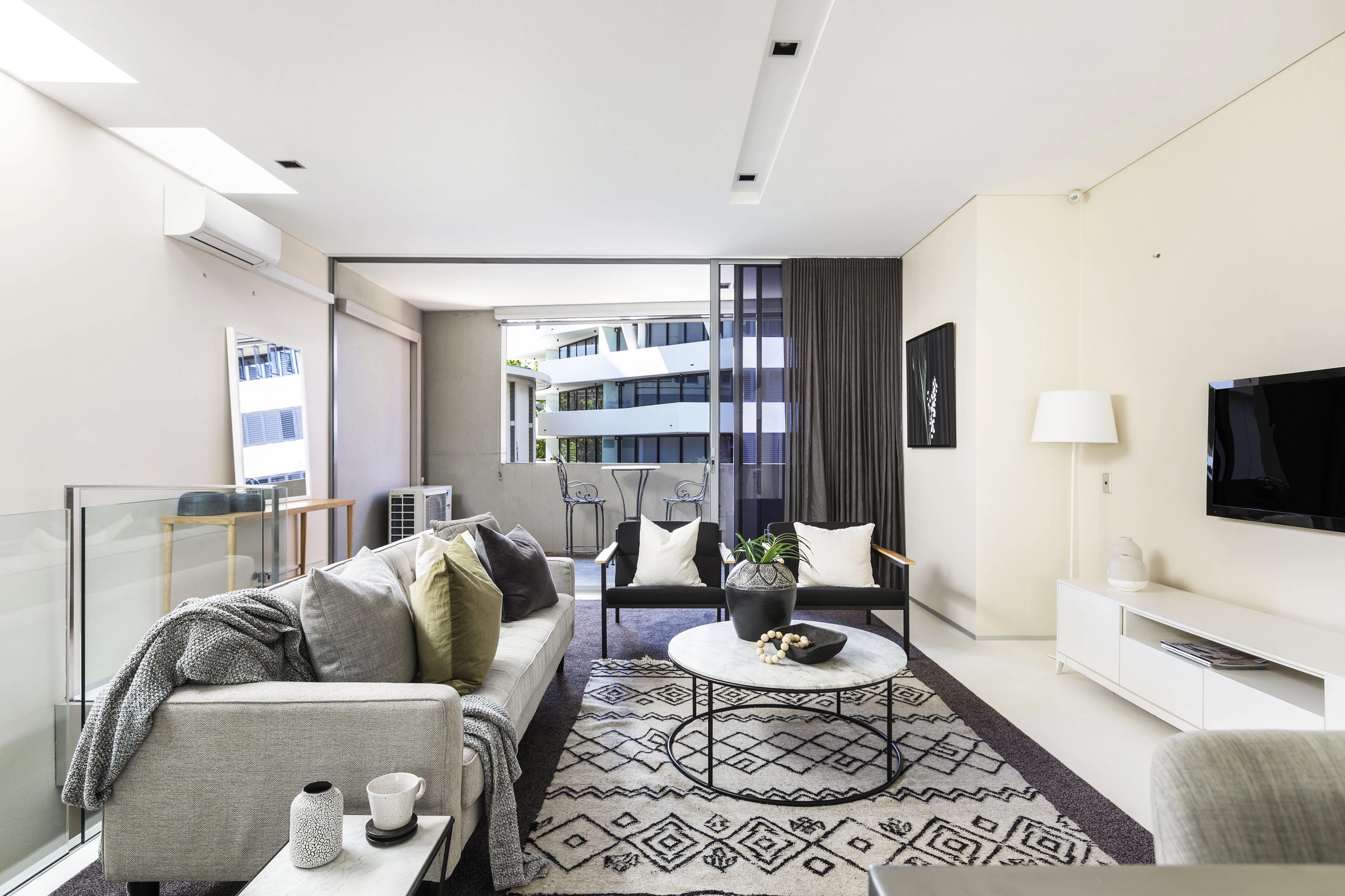 - Wide doors opening onto the balcony