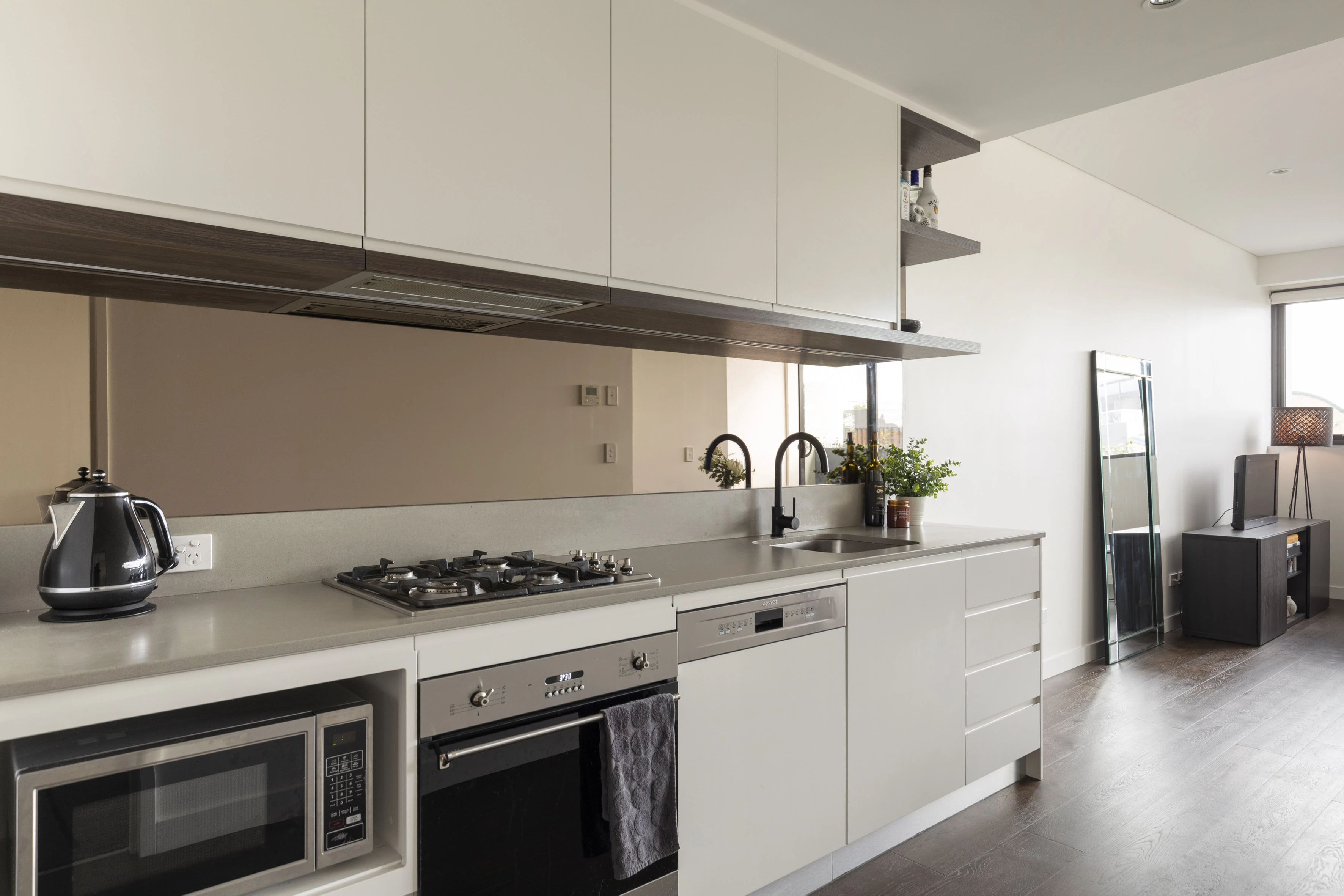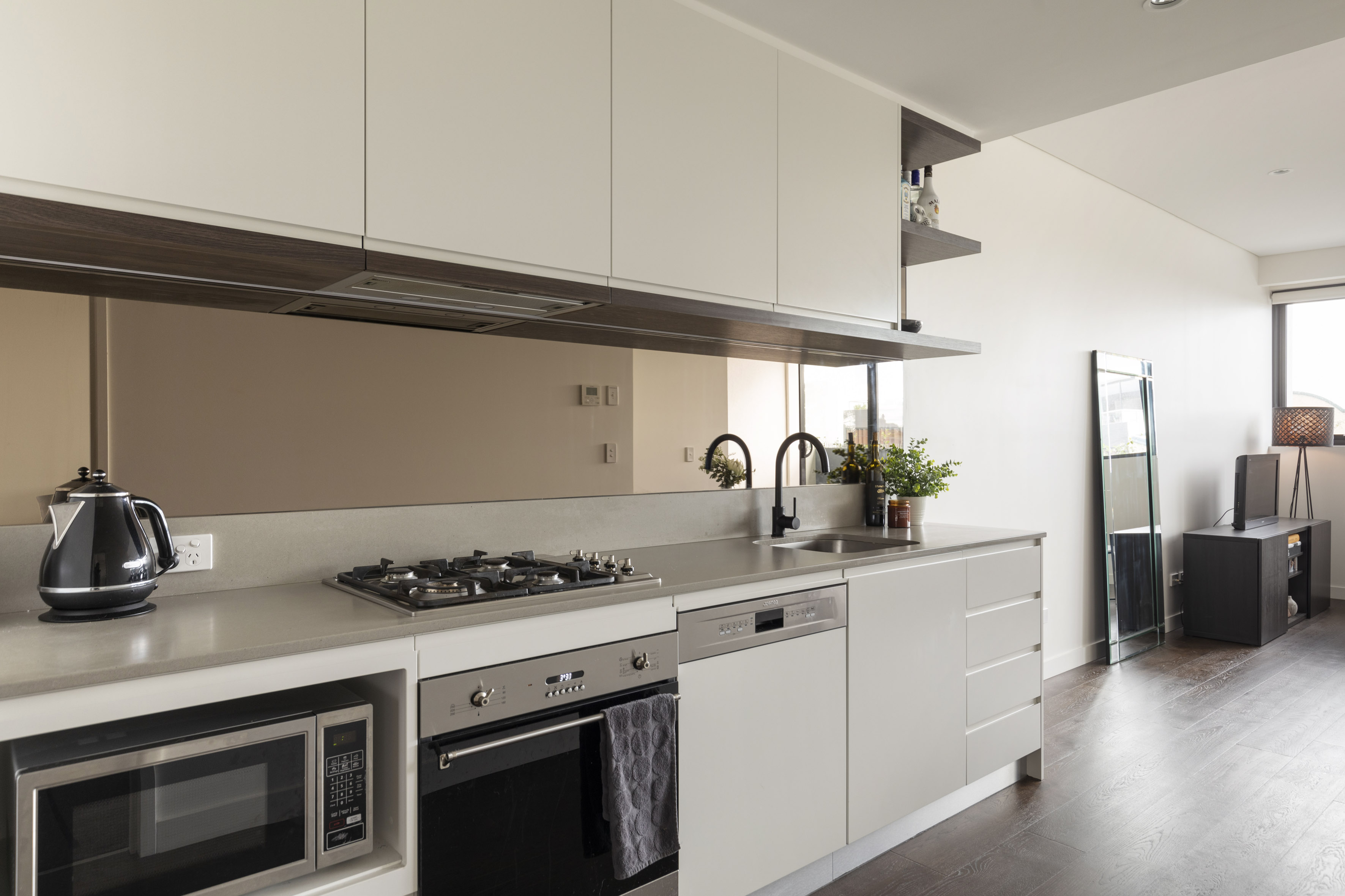 - Smeg gas kitchen, stone, mirror splash