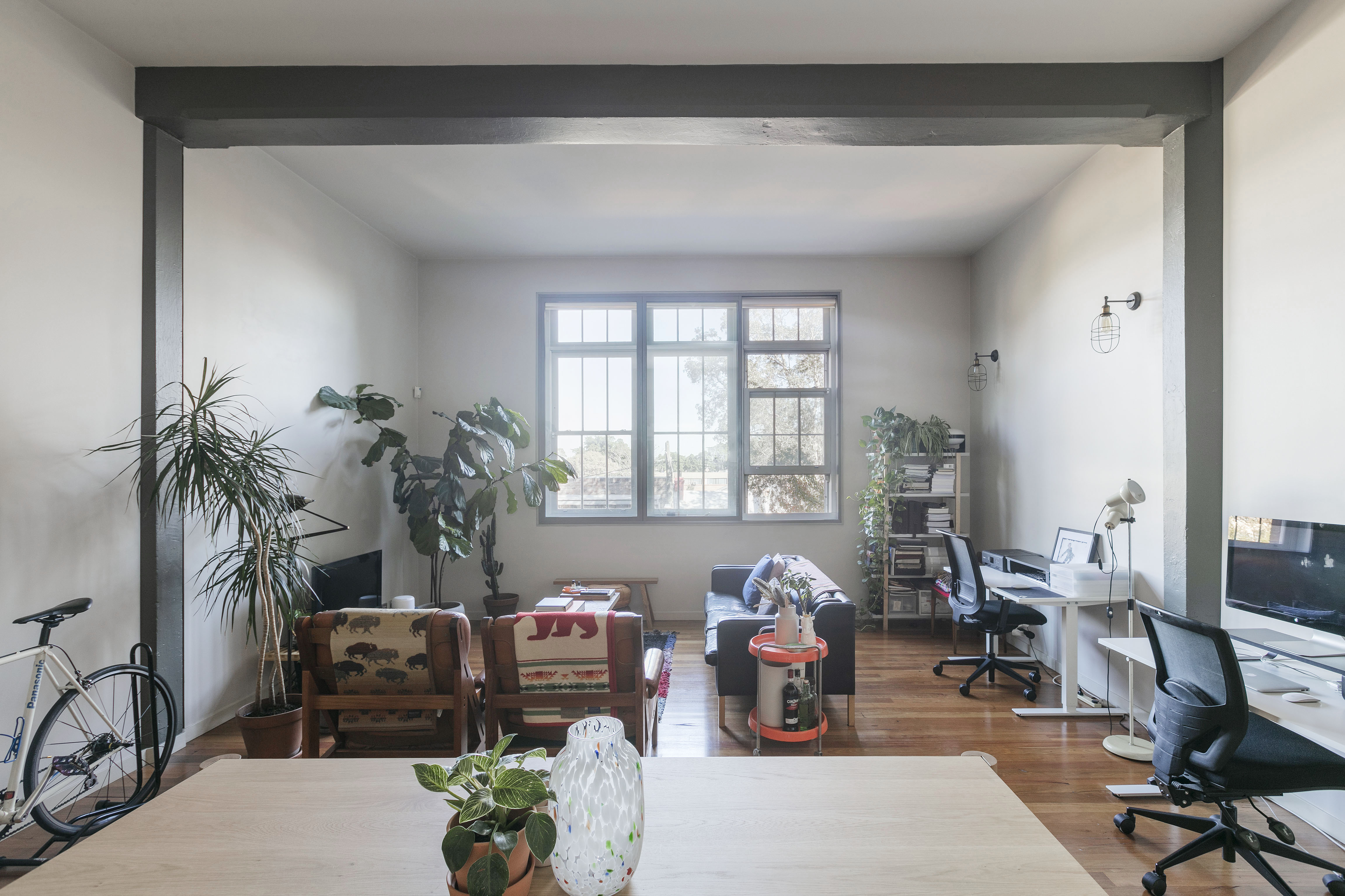 - Oversized windows, exposed timber beams