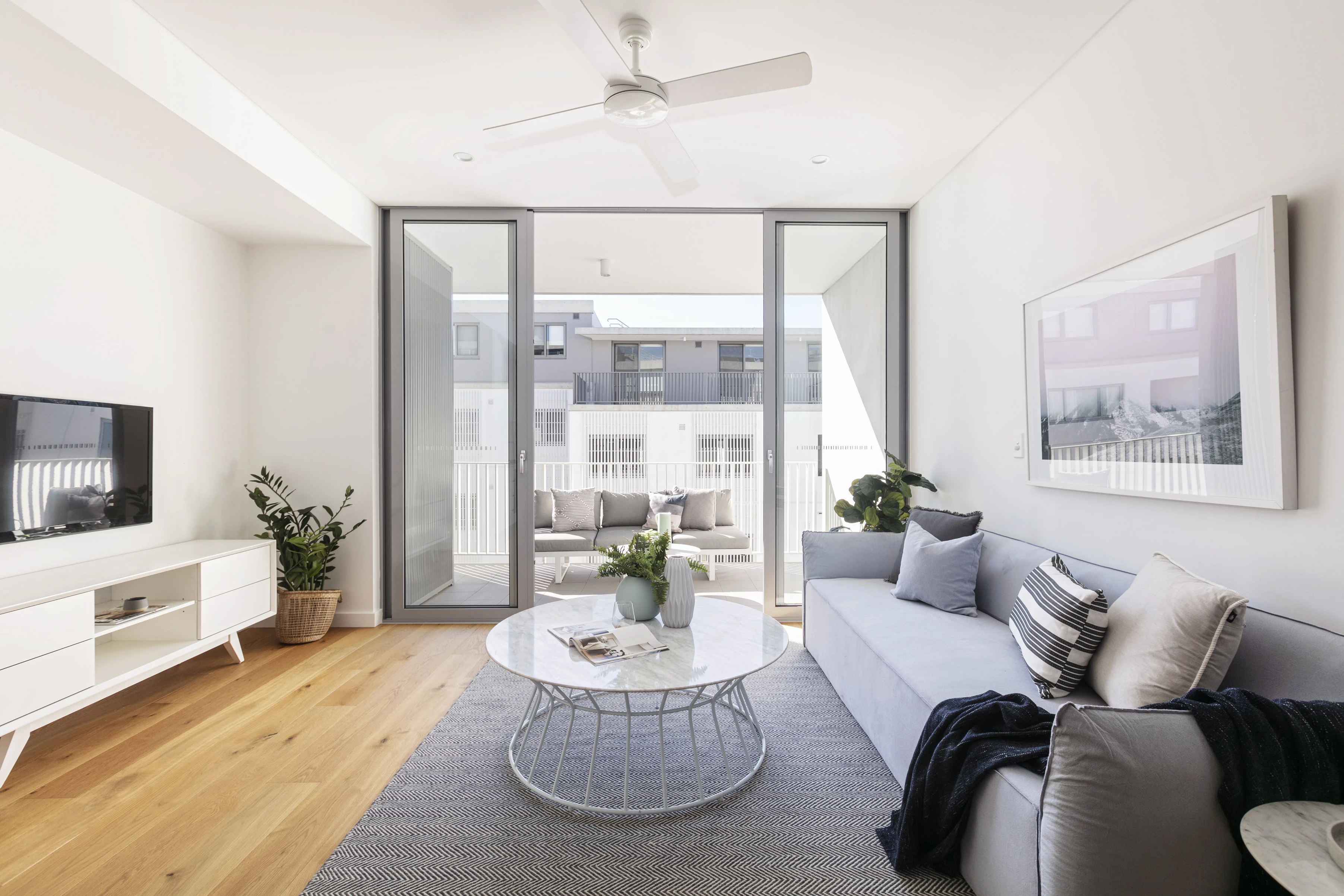 - Balconies off living & bed + district views