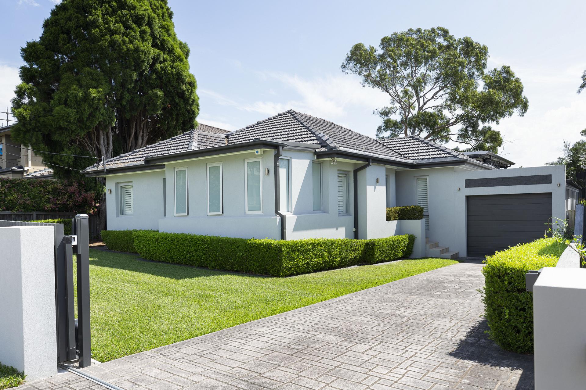 - Large lawns, hedged gardens, garage
