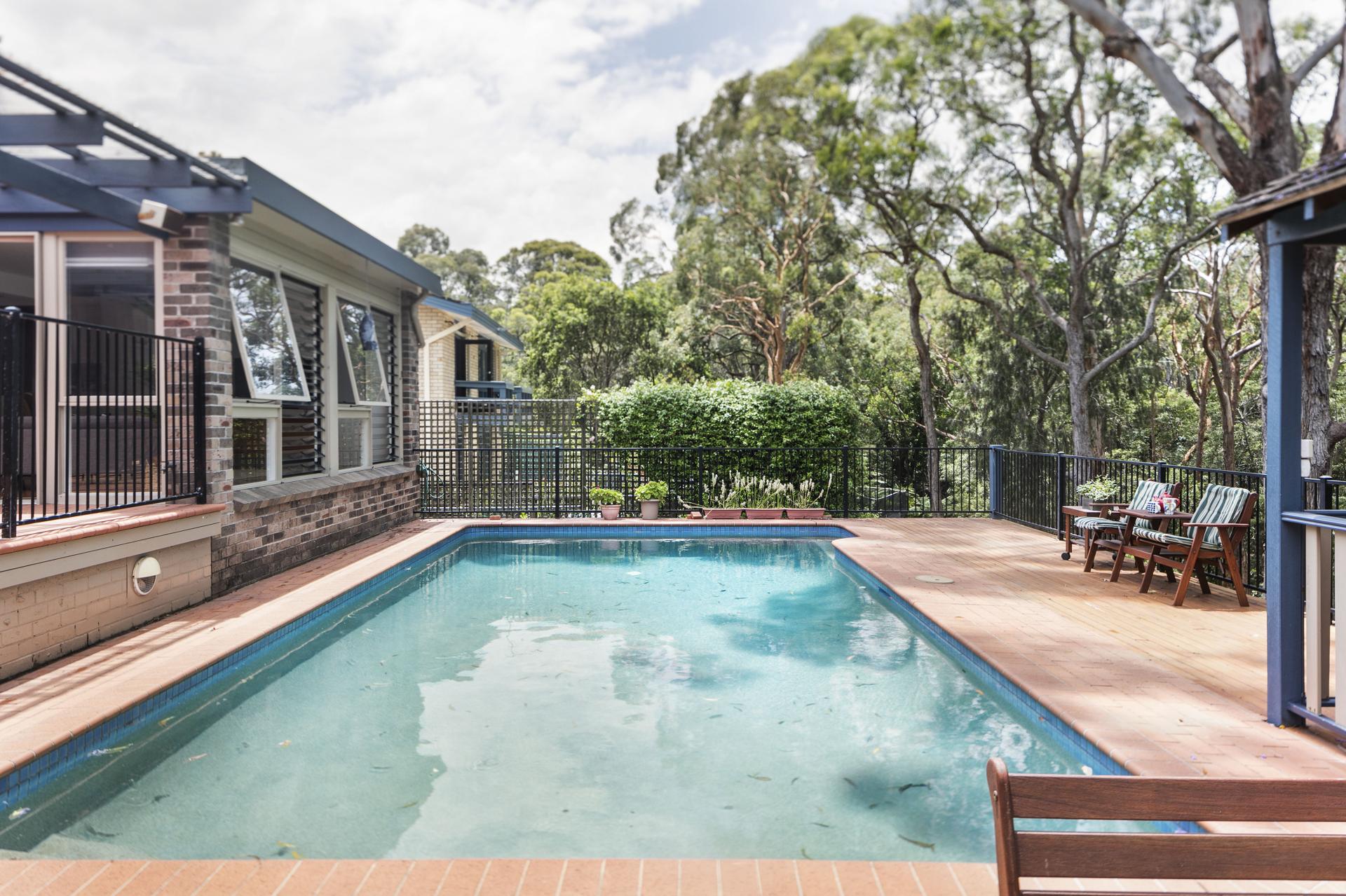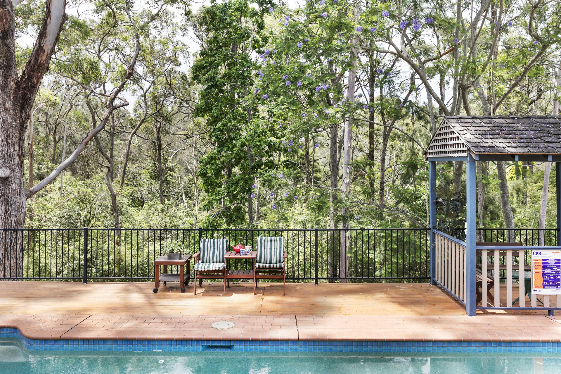 With enviable privacy throughout, this updated home is a green retreat with its bushland backdrop and pool deck to its Mediterranean-style courtyard off the master suite.