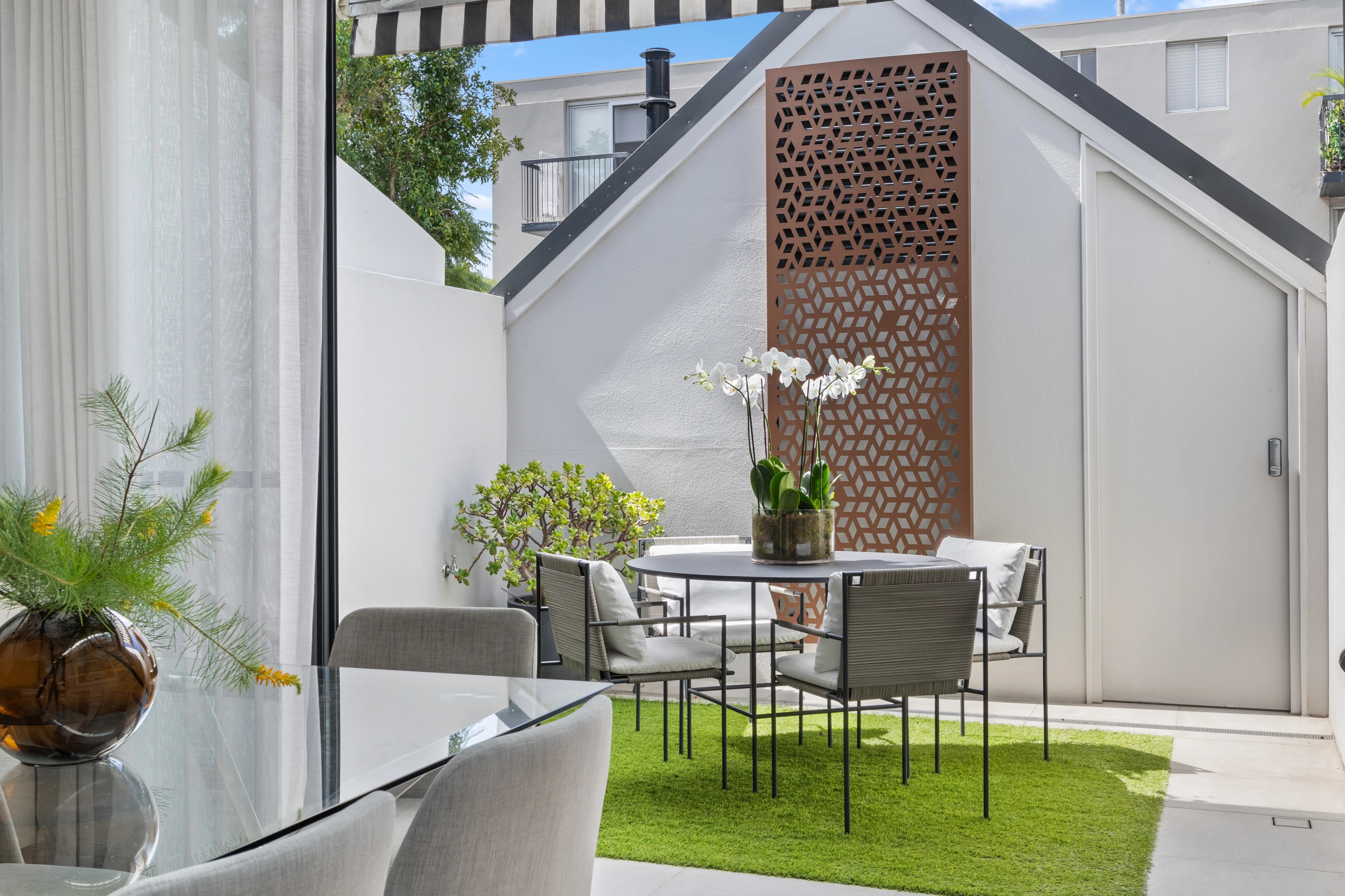 - Automated awning, laser-cut screen