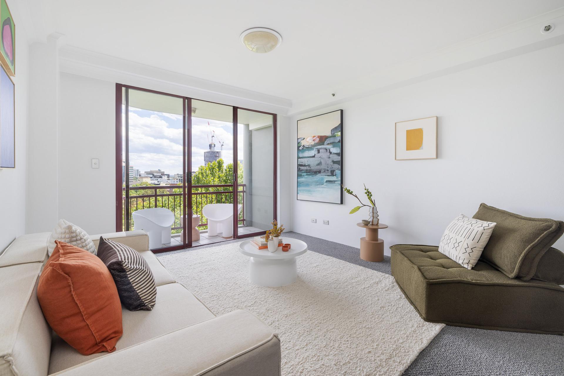 - Sunlit living area flowing to park-view balcony