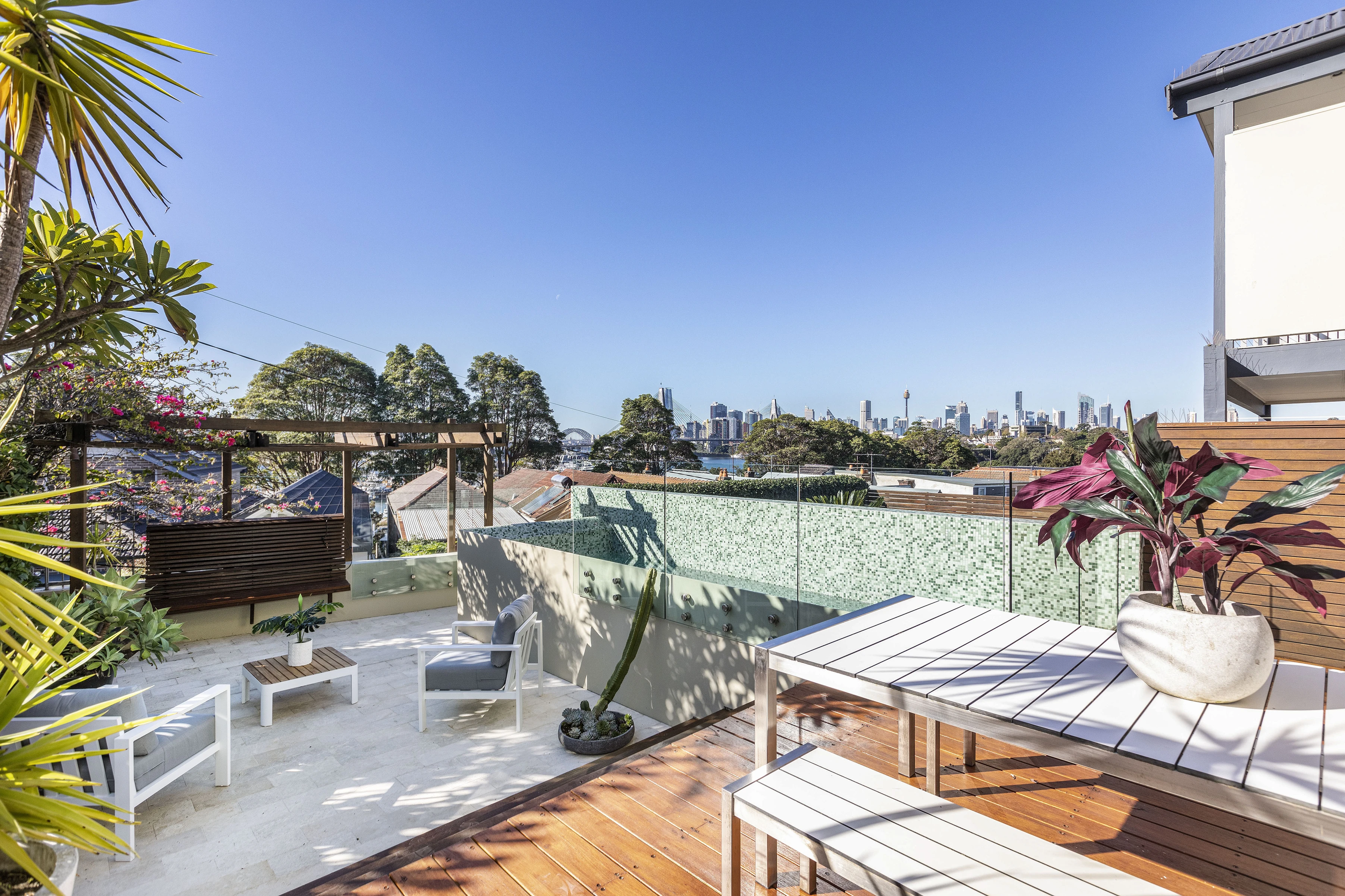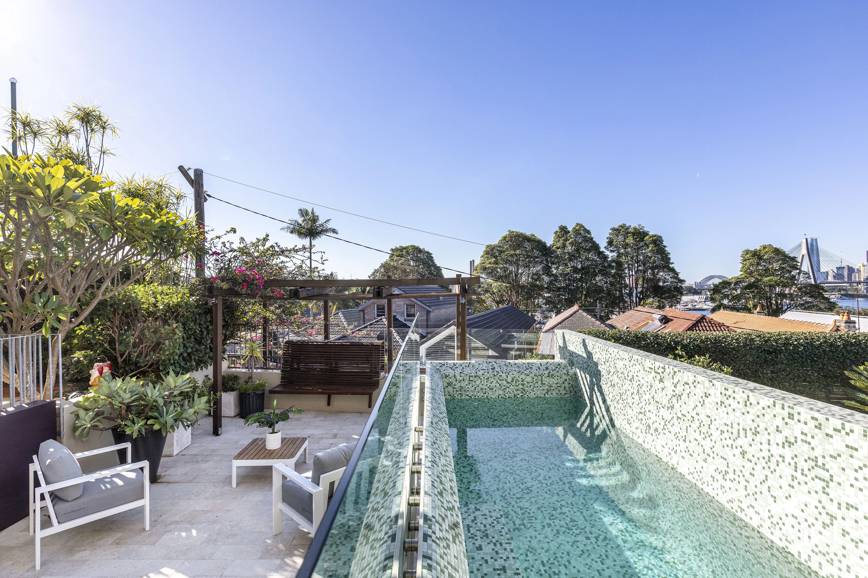 With north-facing outlooks across the harbour, CBD and Harbour Bridge, few Annandale houses would compare for aspect, views and wow factor. An expansive package of separate living areas, poolside alfresco space, it’s a luxury family home, entertainer, and statement residence. This unique property is an amalgamation of two adjoining cottages by award winning architects Lahz Nimmo.
