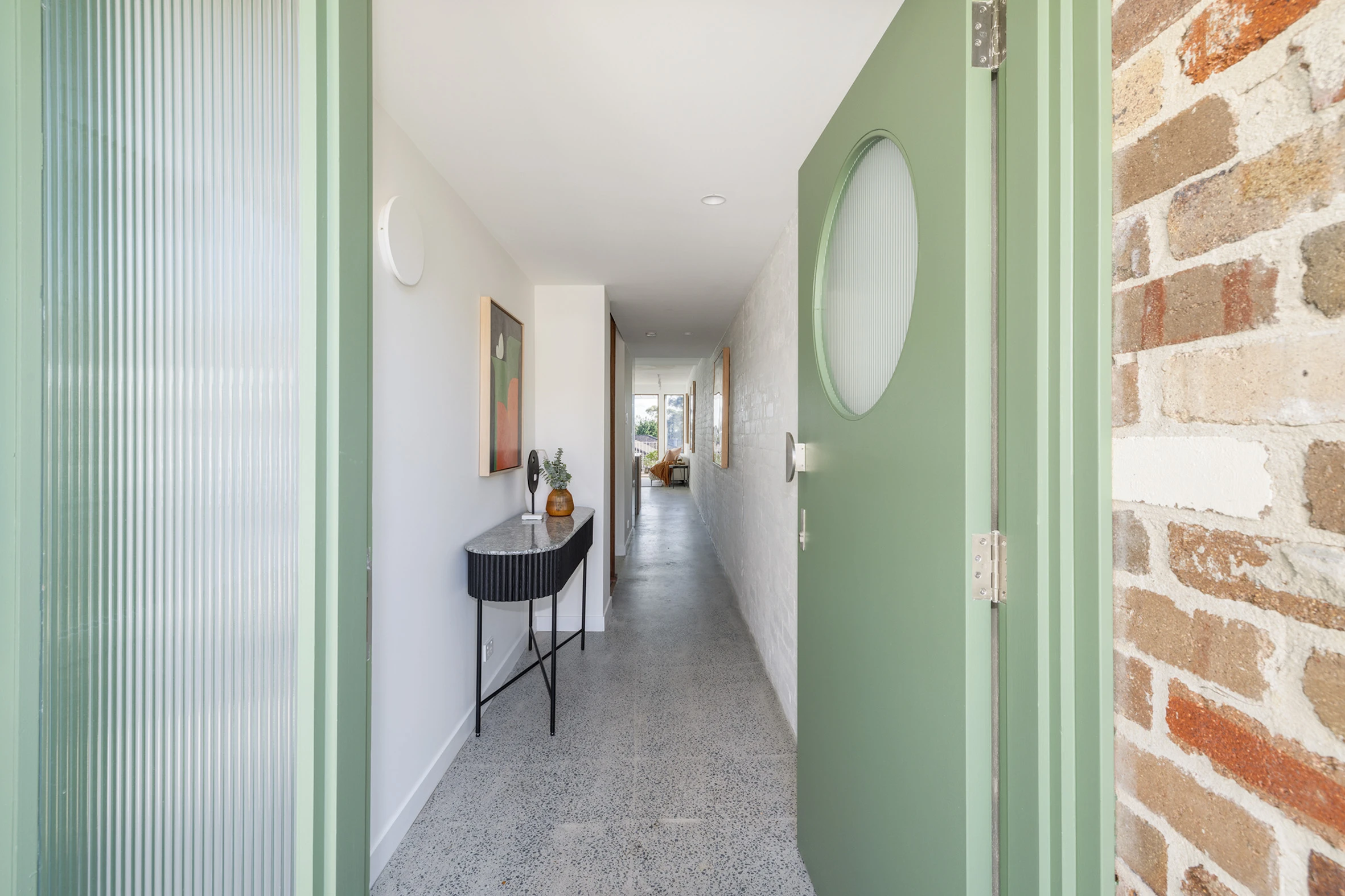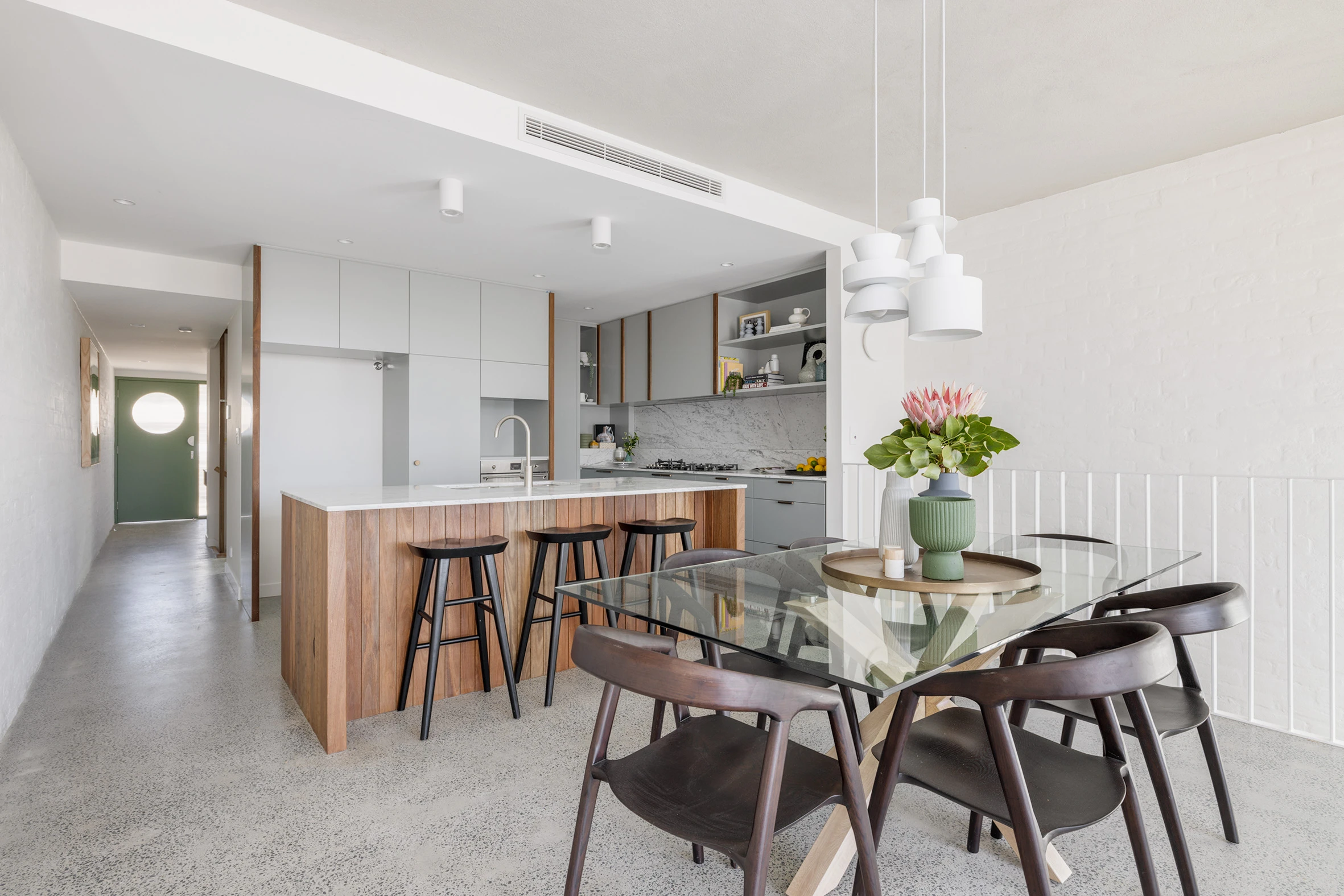 - Open-plan living, concrete floors, skylights