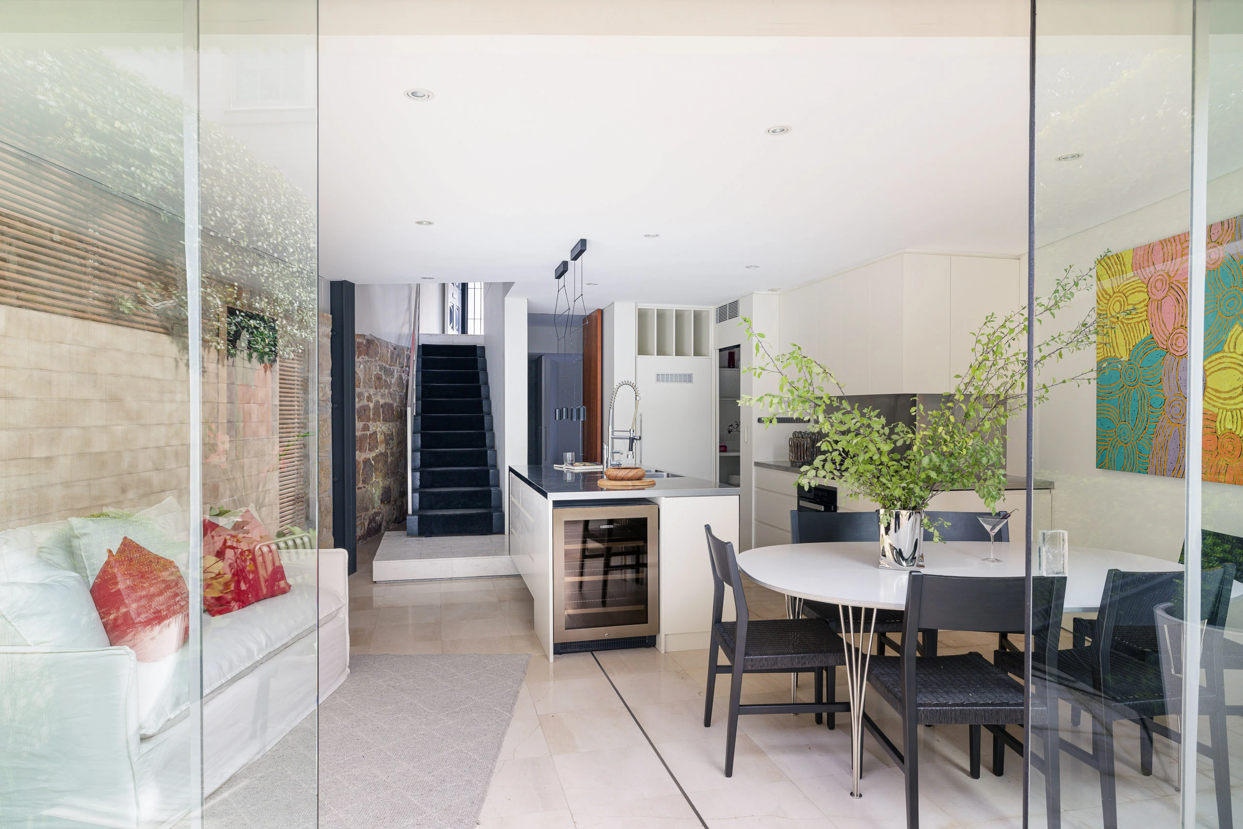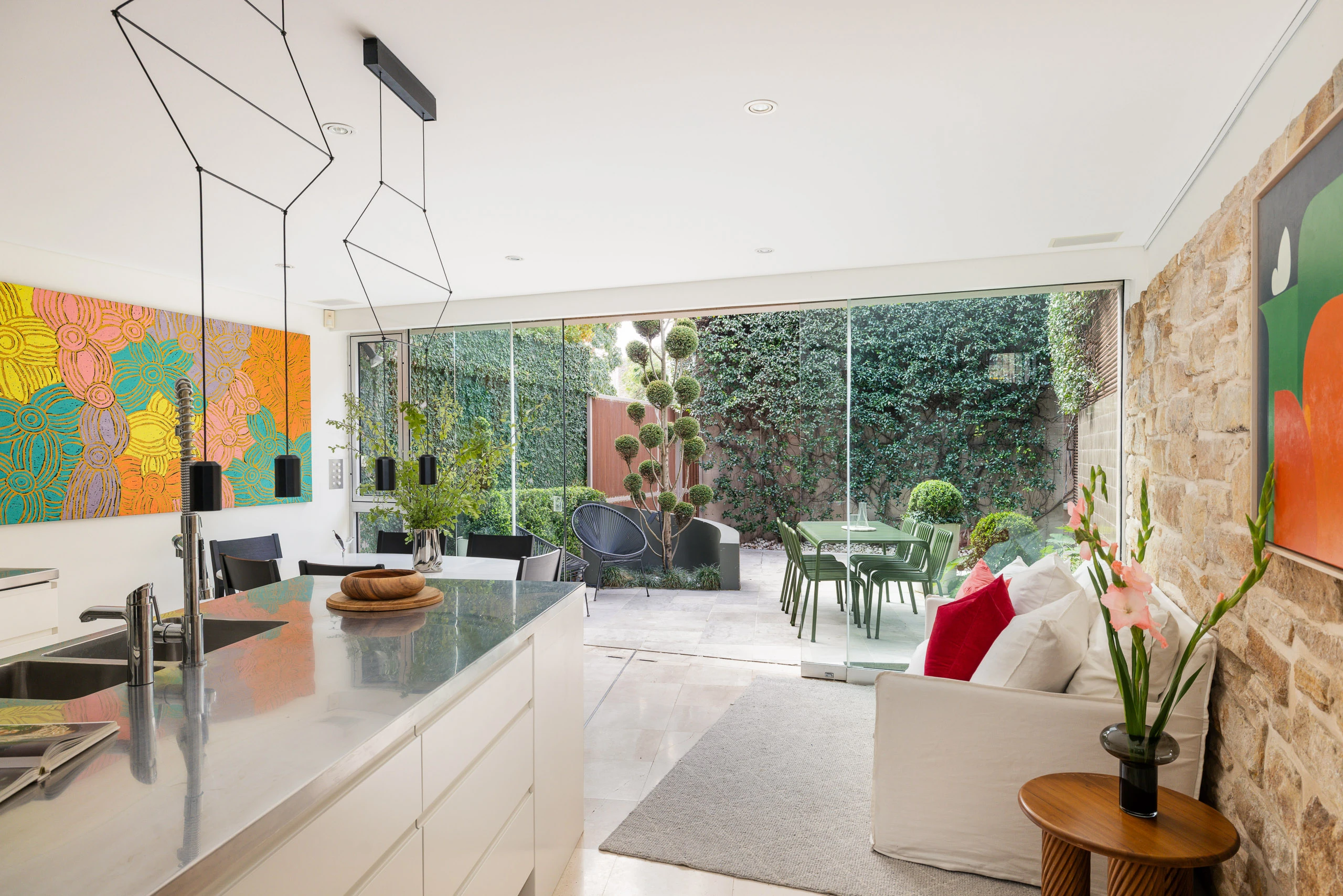 An inspired remodel by acclaimed architect Richard Archer has enhanced the indoor/outdoor harmony and open scale of this multi-level corner terrace, superbly located in a peaceful laneway in Paddington’s village heart. Dual street frontages allow for rare lock-up parking and two distinct outdoor entertaining spaces, each with an ideal north aspect. The exquisite landscape design and natural stone and marble finishes bring a sense of refinement worthy of the outstanding position, just moments to Oxford Street, Glenmore Road boutiques and Royal Hospital for Women Park.