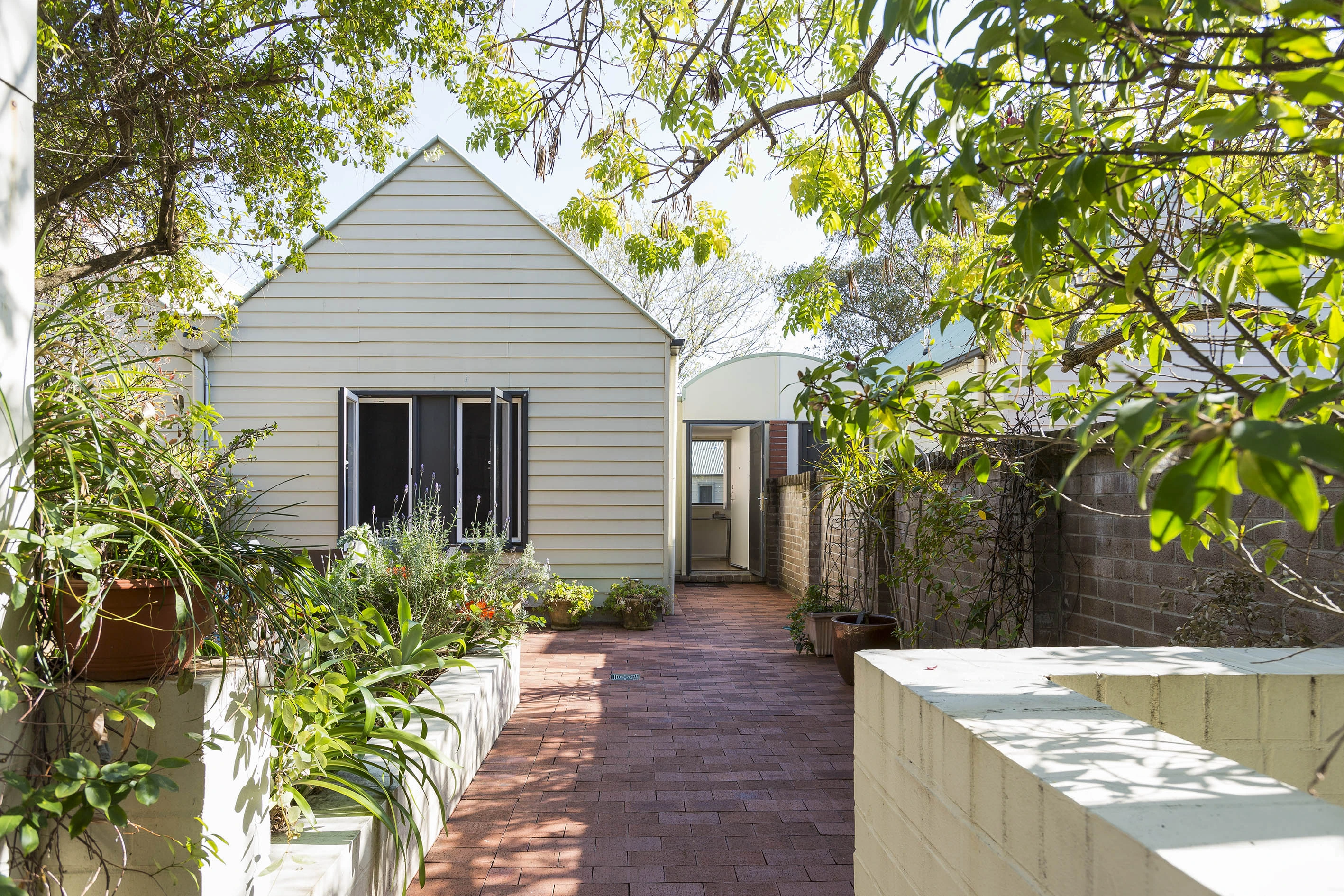 - Sunken courtyard w/ green backdrops