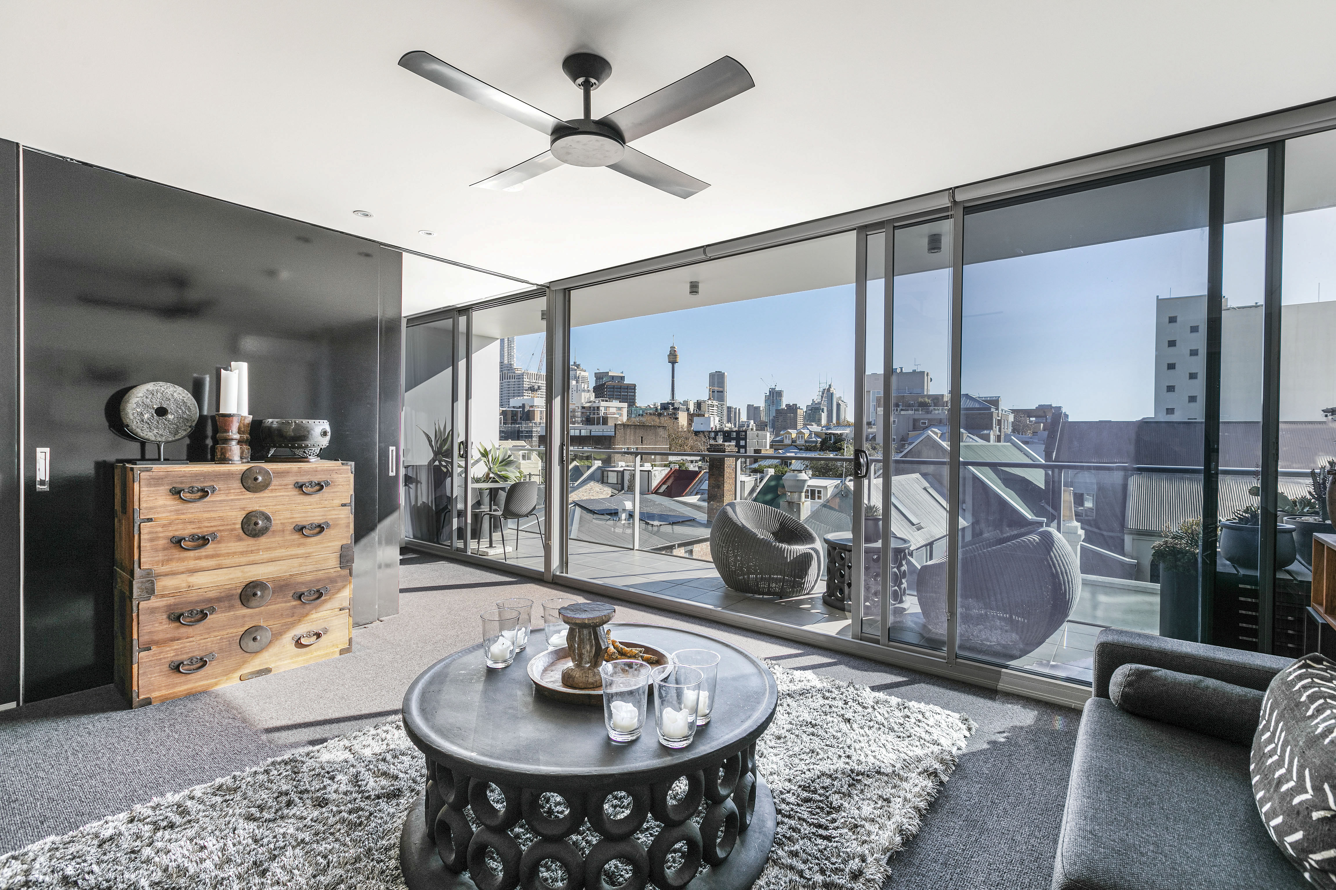 - Full-width balcony, N-facing, CBD views